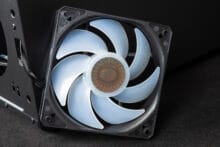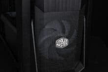 Interessant ist, dass Cooler Master auf Werbebildern des MasterBox 500 an der Position des hinteren Lüfters einen anderen Lüfter mit RGB-Funktion zeigt. Da hat der tatsächlich verbaute Lüfter eher eine Alibi-Funktion.