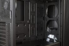 Man ist auch sehr flexibel, was mögliche Komponenten angeht. Luftkühler sind bis zu einer Höhe von 165 mm möglich, wodurch man selbst die größten Luftkühler problemlos verbauen kann. Ansonsten hat man Platz für Radiatoren aller üblichen Größen bis 360 mm vorne und an der Oberseite – und somit auch für Custom-Wasserkühlungen mit mehreren Radiatoren. Der Lüfter an der Rückseite kann in der Höhe verstellt werden, um oben montierten Radiatoren nicht in die Quere zu kommen und bei Verwendung mit Luftkühlern kann er ebenfalls perfekt ausgerichtet werden auf die Position des Kühlkörpers. Natürlich könnte man an dieser Position ebenfalls einen 120-mm-Radiator platzieren.