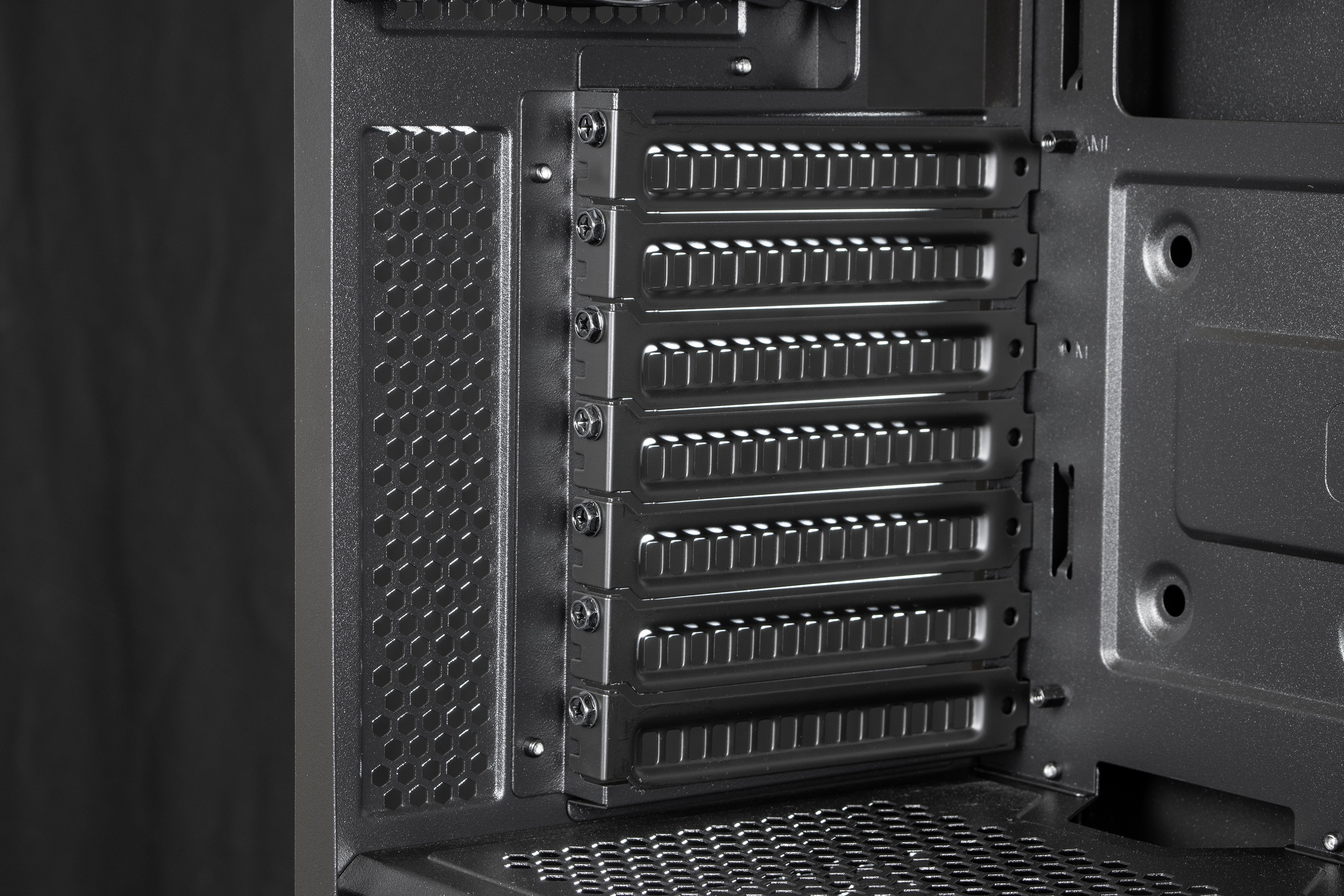 Was im Inneren des Cooler Master MasterBox 500 positiv auffällt, ist, dass die Erweiterungskarten-Abdeckungen allesamt geschraubt sind – und zwar ohne Streben zwischen diesen, was den Einbau eines vertikalen Montage-Kits weit entfernt von der Frontscheibe, also ohne das Ersticken der Grafikkarte, ermöglicht. Ein solches Kit befindet sich natürlich nicht im Lieferumfang, doch Cooler Master bietet mit dem „Universal Vertical Graphics Card Holder Kit V2“ auch ein passendes Modell an.