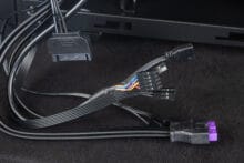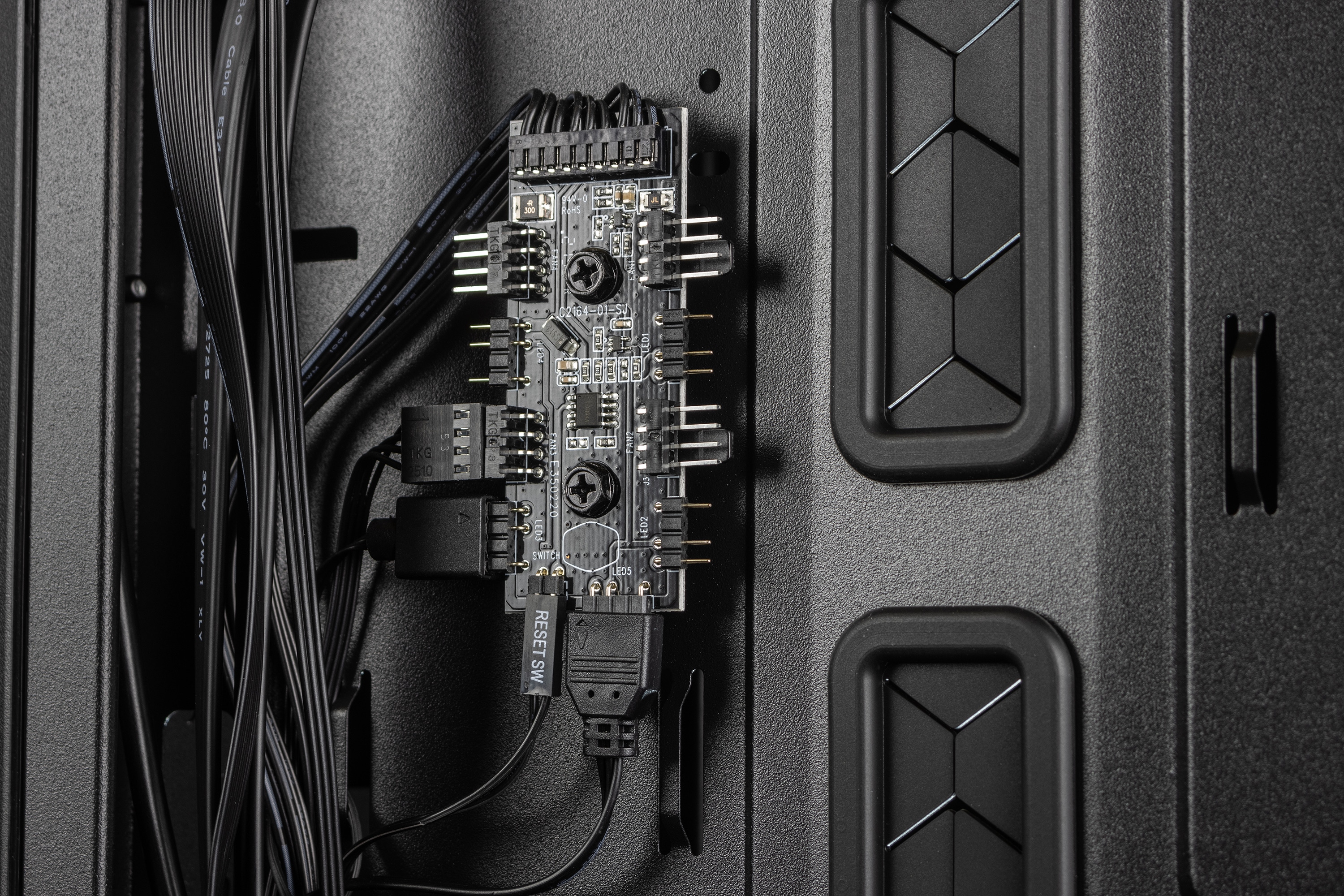 Sehr praktisch ist der integrierte Hub für ARGB- und PWM-Lüftersteuerung. Bis zu vier Lüfter und fünf ARGB-Komponenten können angeschlossen werden – alle weiteren muss man über zusätzliche Splitter verteilen. Versorgt wird dieser Hub über ein SATA-Stromkabel und die RGB-Steuerung läuft über den Reset-Knopf am Frontpanel, sofern man diesen werksseitig verkabelt nutzt. Auf diese Weise kann man auch Mainboards ohne integrierte RGB-Steuerung nutzen. Durch ein kurzes Drücken der Reset-Taste schaltet man durch diverse Modi, durch ein langes Drücken kann die Beleuchtung deaktiviert werden. Ein wenig schade ist es, dass man hier keine konstante einfarbige Beleuchtung wählen kann – neben den typischen Regenbogeneffekten findet man zwar auch einfarbige, doch diese sind stets irgendwie in Bewegung. Alternativ kann man den Hub auch mit einem regulären ARGB-Anschluss mit dem Mainboard verbinden, wenn einer vorhanden ist. Dann kann man alles je nach verwendeter Software einstellen und dem eigenen Geschmack anpassen.