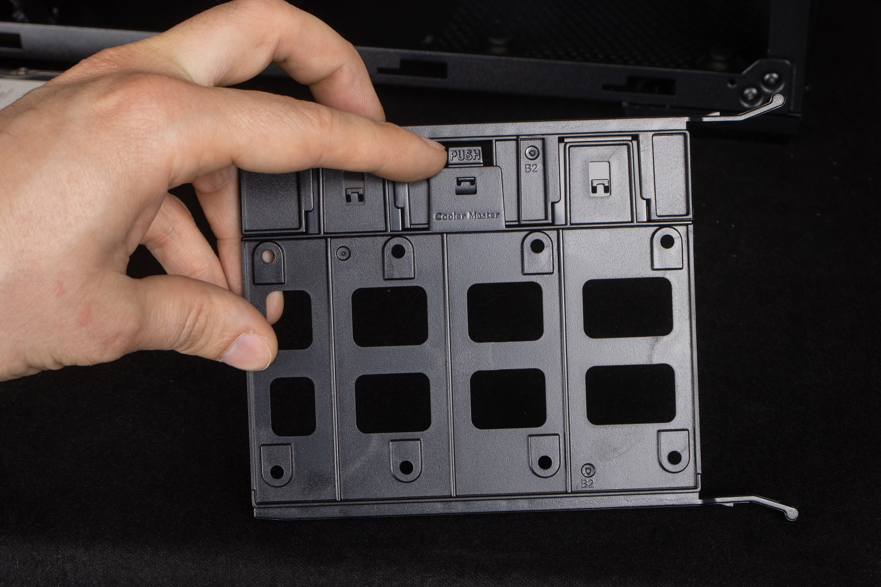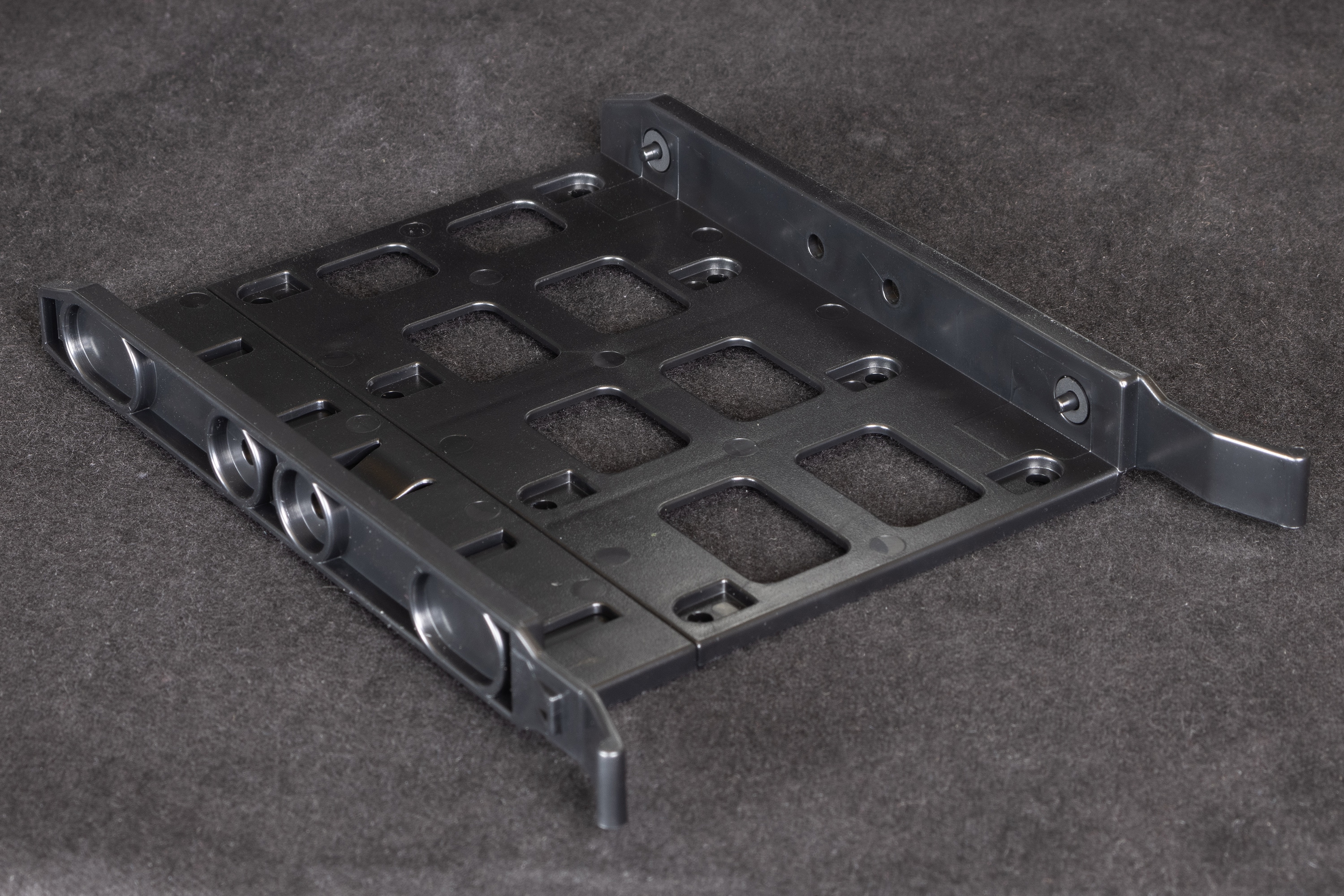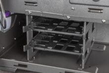 Grafikkarten stellen in allen Größen kein Problem dar, denn der Festplattenkäfig befindet sich nicht auf Kollisionskurs, sondern unten in der Netzteil-Abdeckung. Der werksseitig verbaute Front-Lüfter befindet sich auch in einer Höhe, dass er verbaute Festplatten effektiv kühlt und diese nicht einem langsamen Hitze-Tod aussetzt. Die 3,5“-Festplatten werden werkzeugfrei in den beiden Caddys platziert, was einfach ist, denn diese werkzeugfreien Festplatten-Caddys sind wirklich gut: Auf der Unterseite ist ein Knopf und durch diesen öffnet sich diese Halterung, damit man die Festplatte einfach hinein und wieder herausbekommt. Damit spart man sich das teilweise sehr schwergängige Verbiegen der Halterungen anderer Marken. 2,5“-Laufwerke lassen sich ebenfalls in diese Caddys schrauben. Hierfür werden Schrauben und der passende Schraubendreher benötigt, aber man kann diese zusätzlich zu den 3,5“-Laufwerken auf der Unterseite der Caddys montieren. Somit bekommt man bis zu vier Laufwerke im Festplattenkäfig untergebracht!