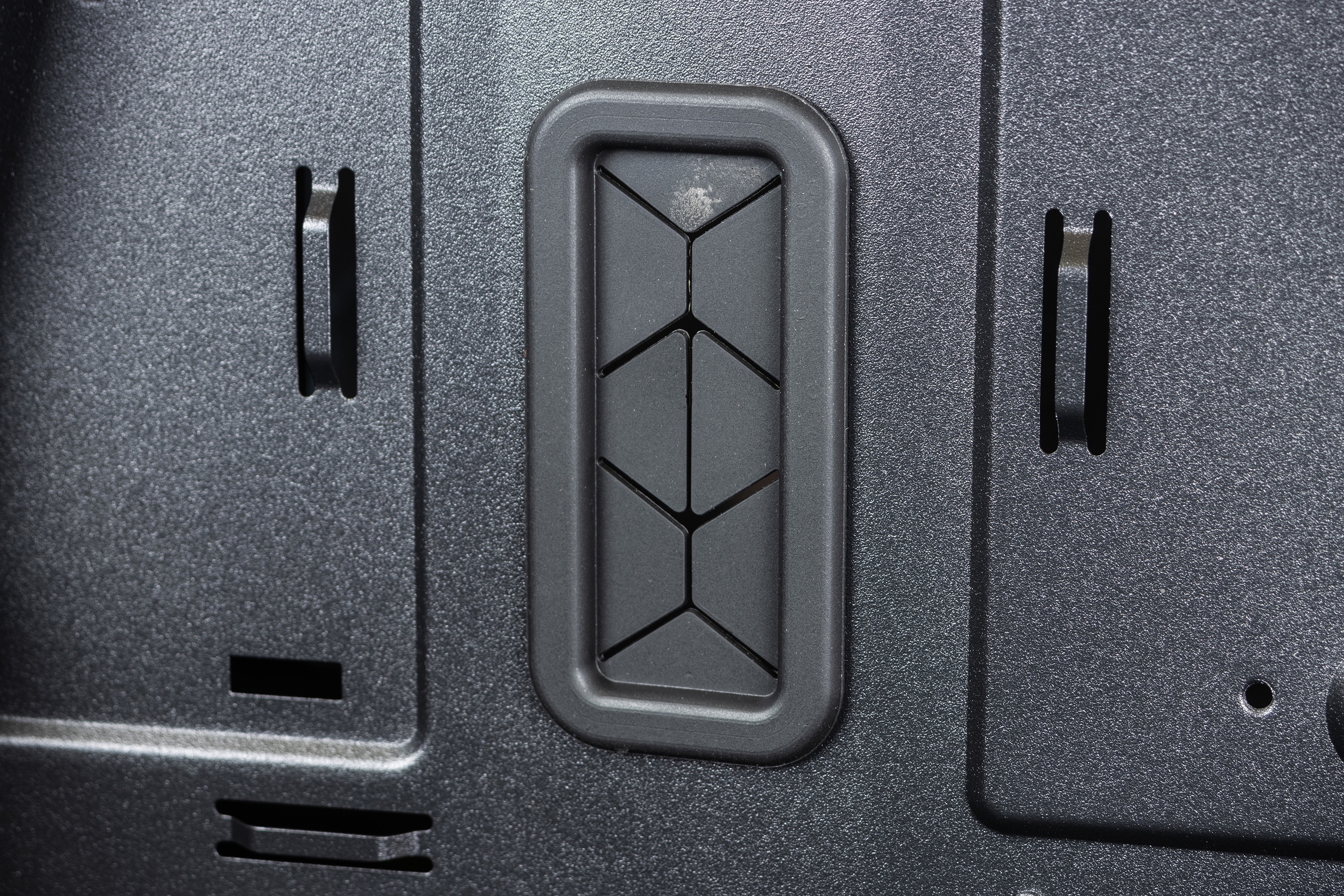 Der Blick von innen zeigt zwar drei Plätze für Lüfter, doch wo der Platz unten, an welchem der eine Werkslüfter sitzt, noch einen guten Zugriff auf das Mesh-Gitter der Front (welches mit seinen kleinen Löchern direkt als Staubfilter dient) hat, bietet der zweite Lüfter schon nur noch einen kleinen zusätzlichen Nutzen. Der obere Lüfterplatz sieht nicht aus, als könnte er noch nennenswert zusätzliche Luft ins Gehäuse bringen – diese Lüfteröffnung sitzt komplett verdeckt und könnte nur die Luft bewegen, um die die unteren Lüfter sich schon kümmern könnten. Einige Gehäuse konnten bereits beweisen, dass zwei Lüfter – einer vorne und einer hinten – durchaus effektiv arbeiten können, von daher ist die Form des Cooler Master MasterBox 500 nicht gänzlich sinnlos, doch je höher man Lüfter platziert, desto mehr sinkt deren praktischer Nutzen.