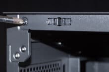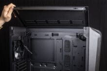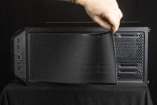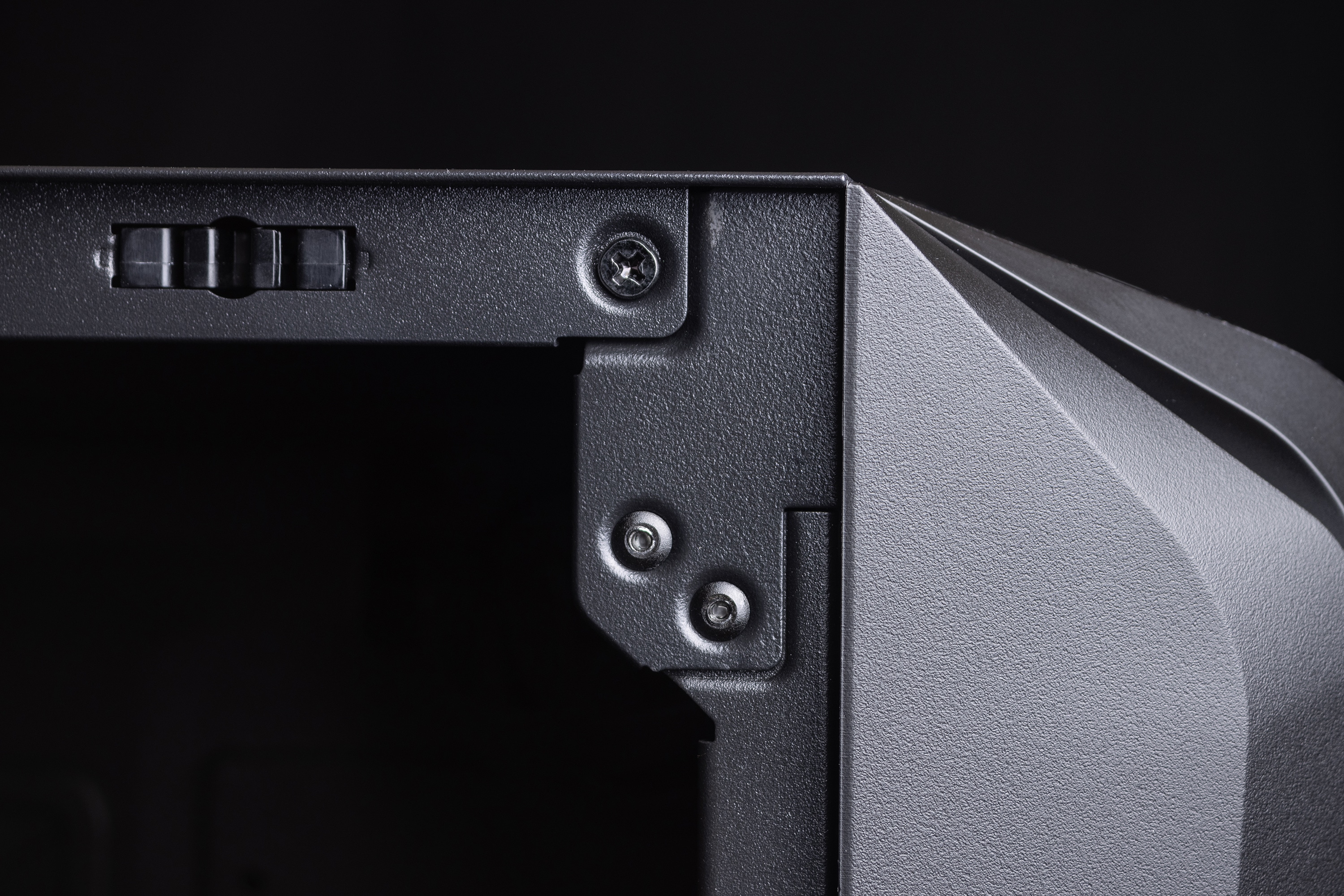 Die Seitenteile des Gehäuses sind unterschiedlich befestigt. Das eine Seitenteil besteht aus echtem Tempered Glass, ist also zwar anfällig für Fingerabdrücke, aber resistent gegenüber Kratzern. Dieses ist durch eine Rändelschraube hinten oben gesichert. Die Sicherung ist für den Transport sinnvoll, doch zu Hause nicht unbedingt notwendig, denn hier wird das Fenster sicher eingeklickt gehalten. Zum Entfernen wird die Scheibe nach vorne gedrückt, bis sie sich löst und etwas nach vorne gekippt steht; dann wird sie nach oben herausgenommen. Das hintere Seitenteil wird durch zwei Rändelschrauben gehalten, die beim Herausdrehen im Seitenteil hängen bleiben und so nicht verloren gehen können. Dann wird das Seitenteil nach hinten abgezogen, wie man es von klassischen Gehäusen kennt.