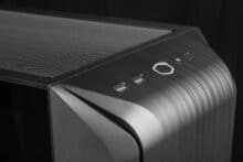 Die Verarbeitung der Front selbst wirkt jedoch gut. Diese ist zwar aus Kunststoff, der durch den Brushed-Aluminum-Look jedoch sehr hochwertig wirkt. Dazu ist er resistent gegenüber Fingerabdrücken. Die Front lässt sich komplett abnehmen, um an die Lüfter zu kommen und hierbei fällt positiv auf, dass keine Kabel das Entfernen erschweren – die RGB-Komponenten am Frontpanel werden durch einen 3-Pin-Kontakt angesteuert und die Anschlüsse sitzen direkt am Gehäuse hinter dem Frontpanel. Die Knöpfe für Power und Reset befinden sich ebenfalls am Gehäuse und das Frontpanel gibt den Druck der dort verbauten Tasten dahin weiter. Ein netter Touch der Entkopplung.