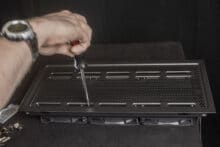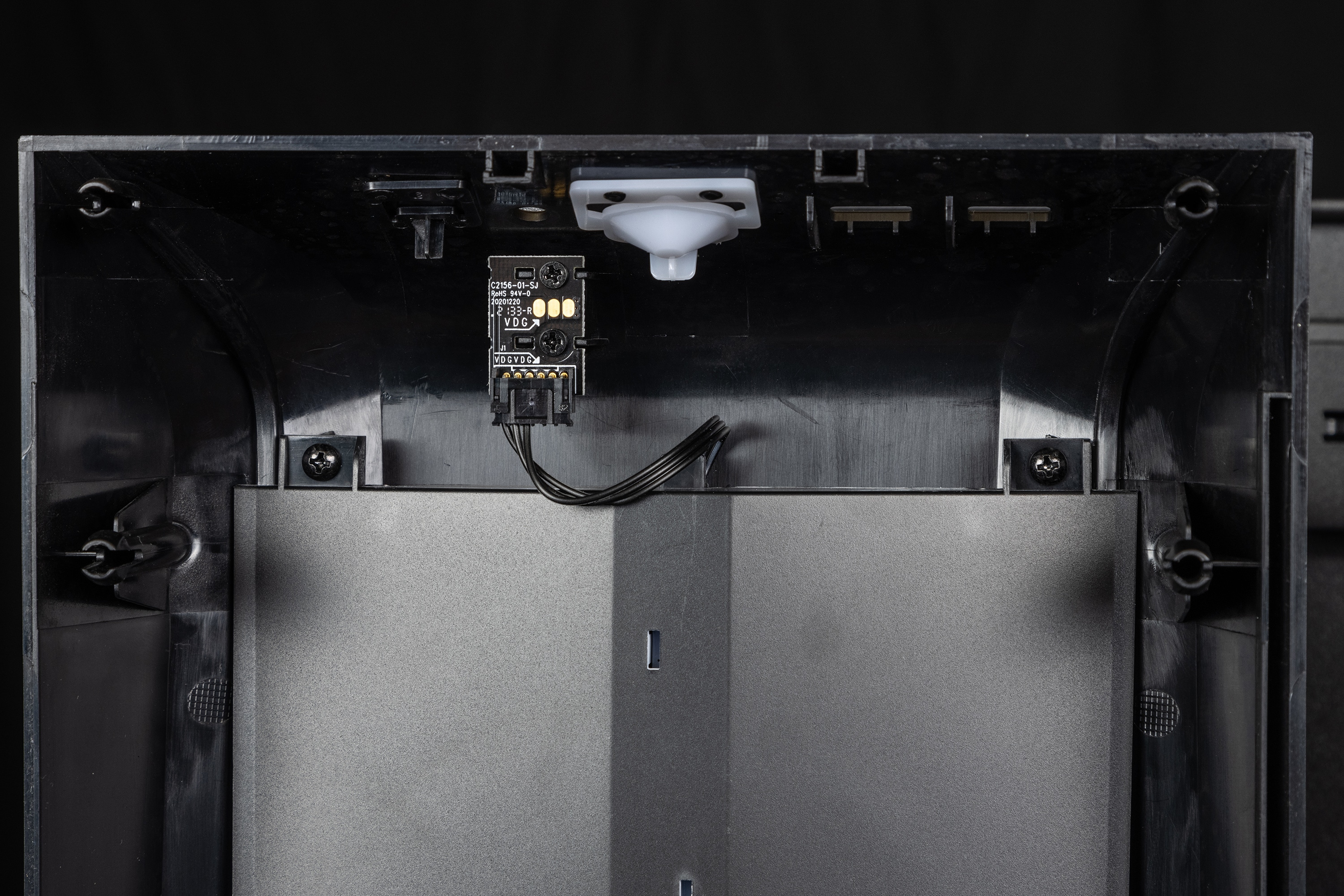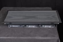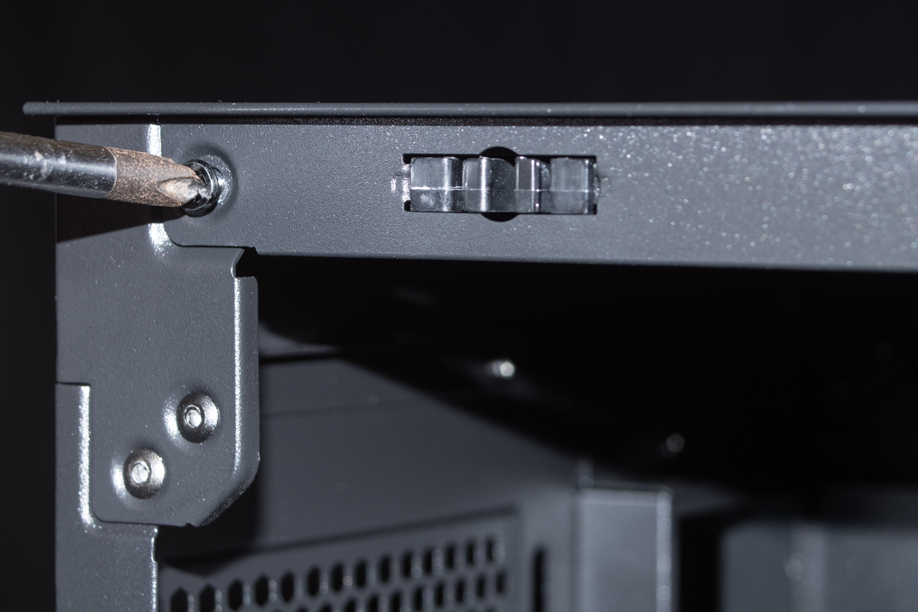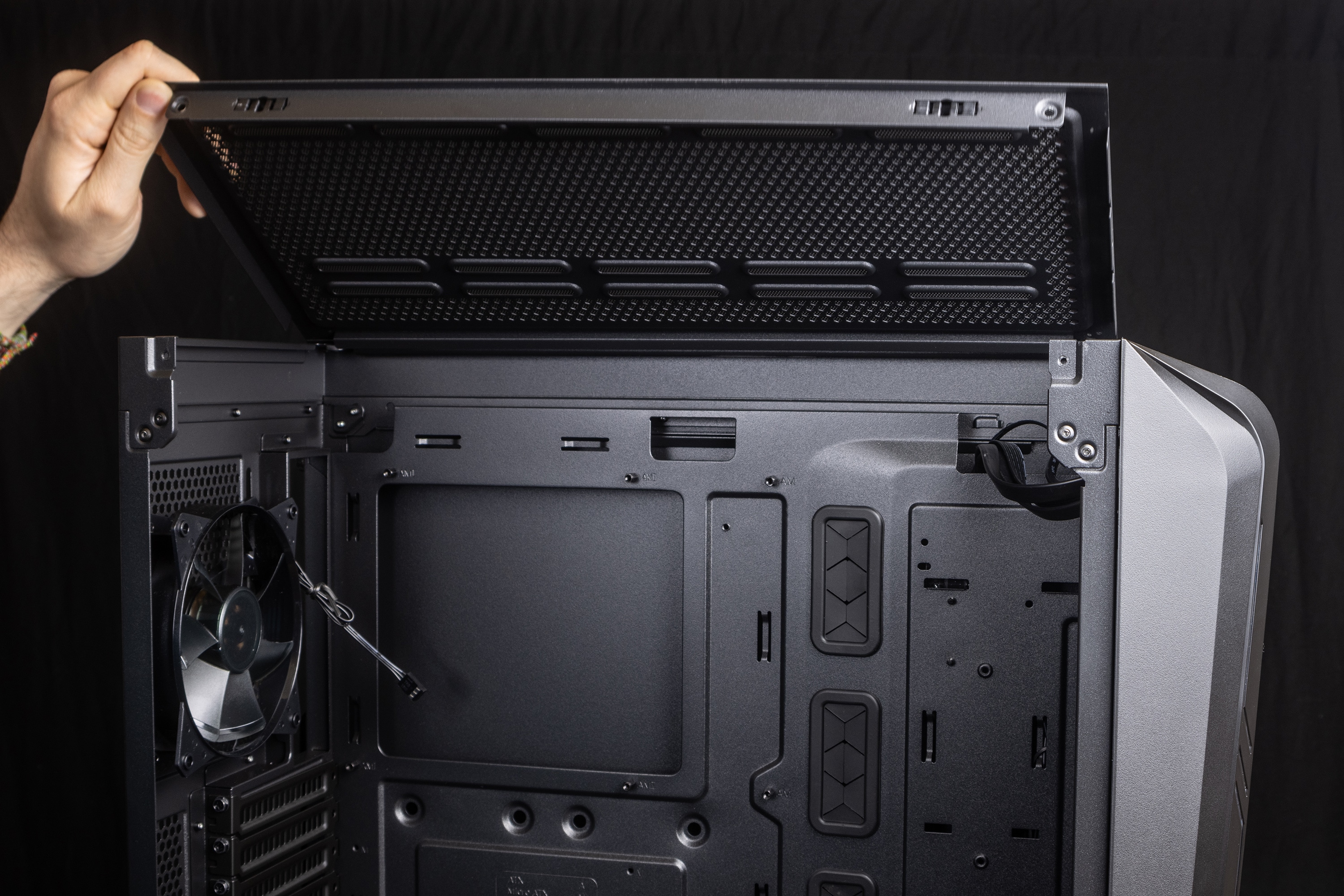 Die Gehäuseoberseite kann zum einfacheren Zugriff auf den Innenbereich abgenommen werden. Hierfür muss zunächst das Seitenteil mit der Glasscheibe entfernt werden, dann werden zwei Kreuzschlitz-Schrauben herausgedreht. Nun kann man das Oberteil nach oben klappen. Der Staubfilter auf der Oberseite wird einfach magnetisch gehalten und ist leicht zu entfernen.
