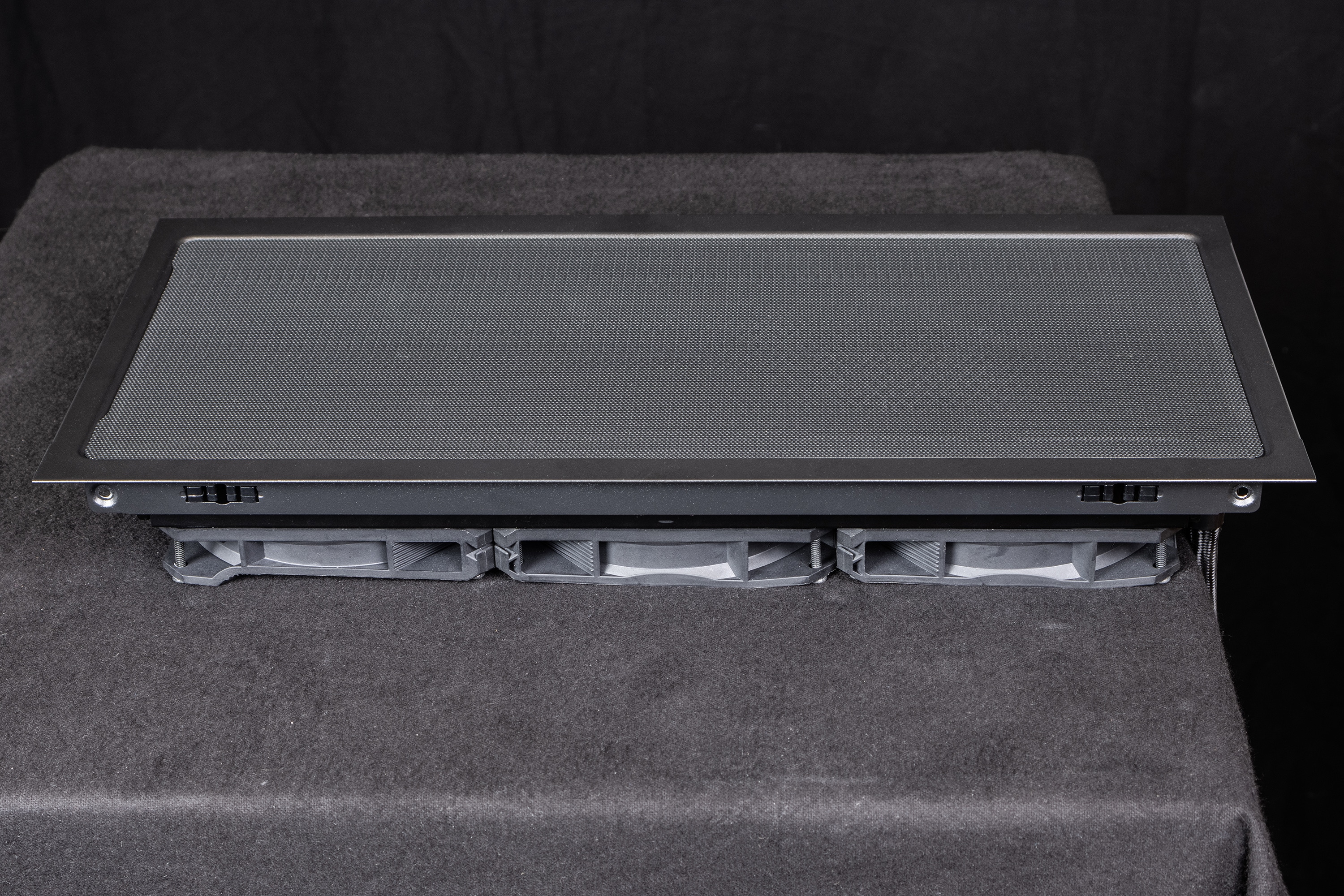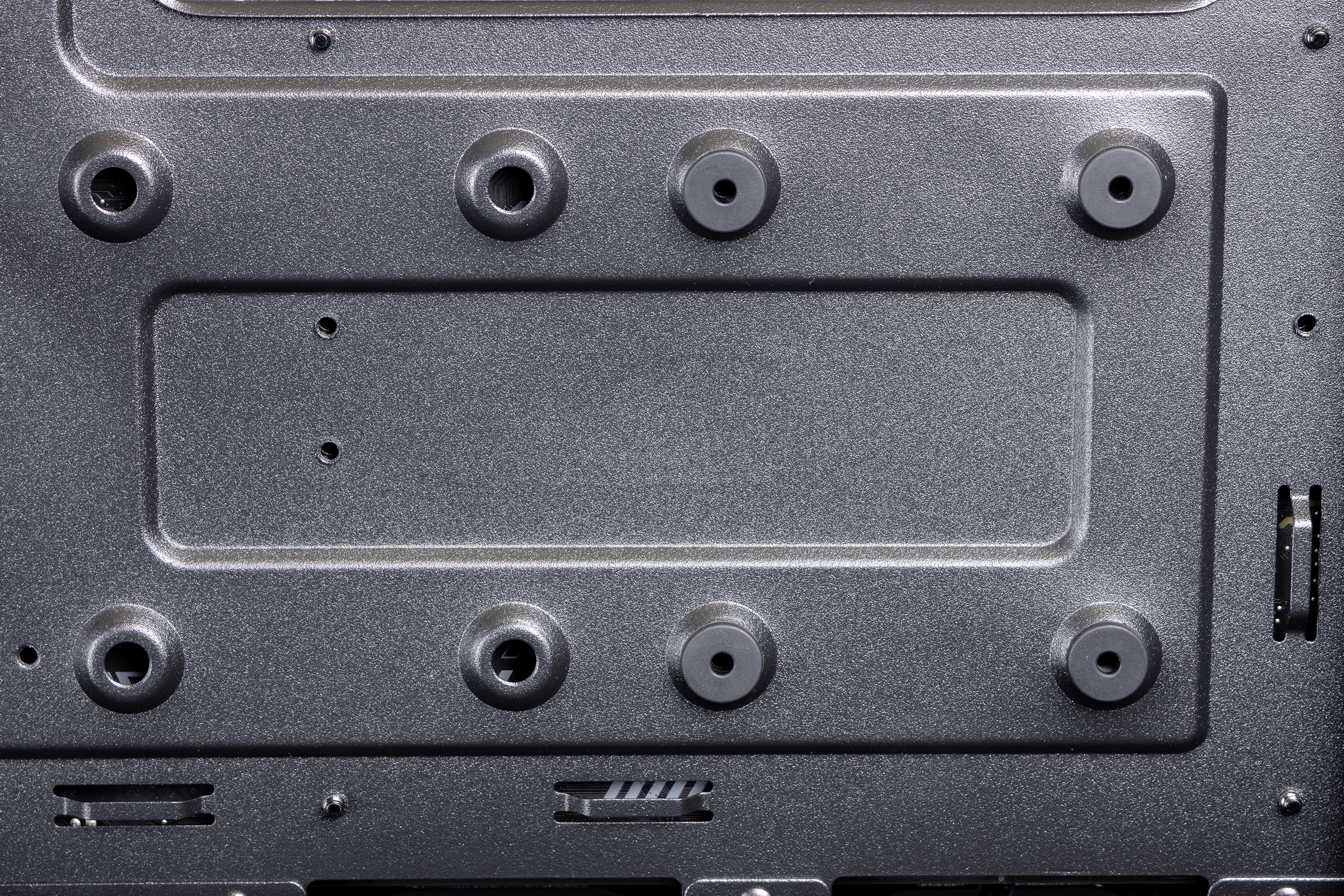 An der Front sind viele Löcher zur Befestigung von Lüftern und unterschiedlichen Radiatorgrößen vorhanden, doch es gibt keine Gewinde zum Montieren der Lüfter über lange Lüfterschrauben, sondern man muss entweder reguläre Lüfterschrauben (die kurzen, breiten) verwenden oder mit langen Radiatorschrauben durch die Lüfter und das Gehäuse gehen und auf der anderen Seite den Radiator anschrauben. Prinzipiell kann man anstatt der 120-mm-Lüfter auch 140-mm-Lüfter verbauen, doch wäre dies Verschwendung, denn die Öffnungen sind exakt an 120-mm-Lüfter angepasst und größere Lüfter würden an den Rändern direkt auf massives Metall pusten.