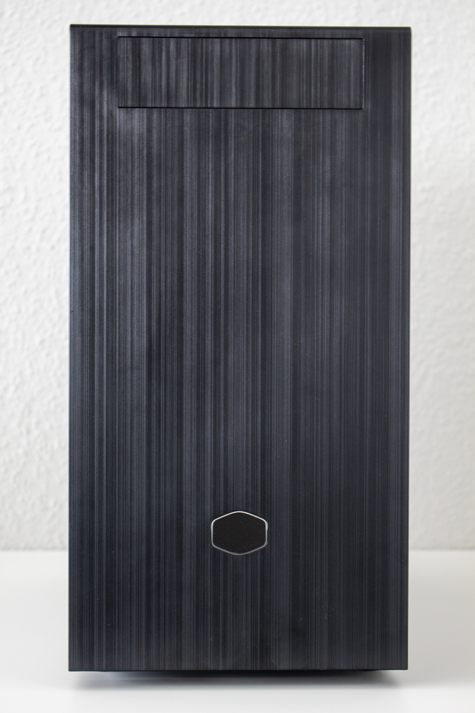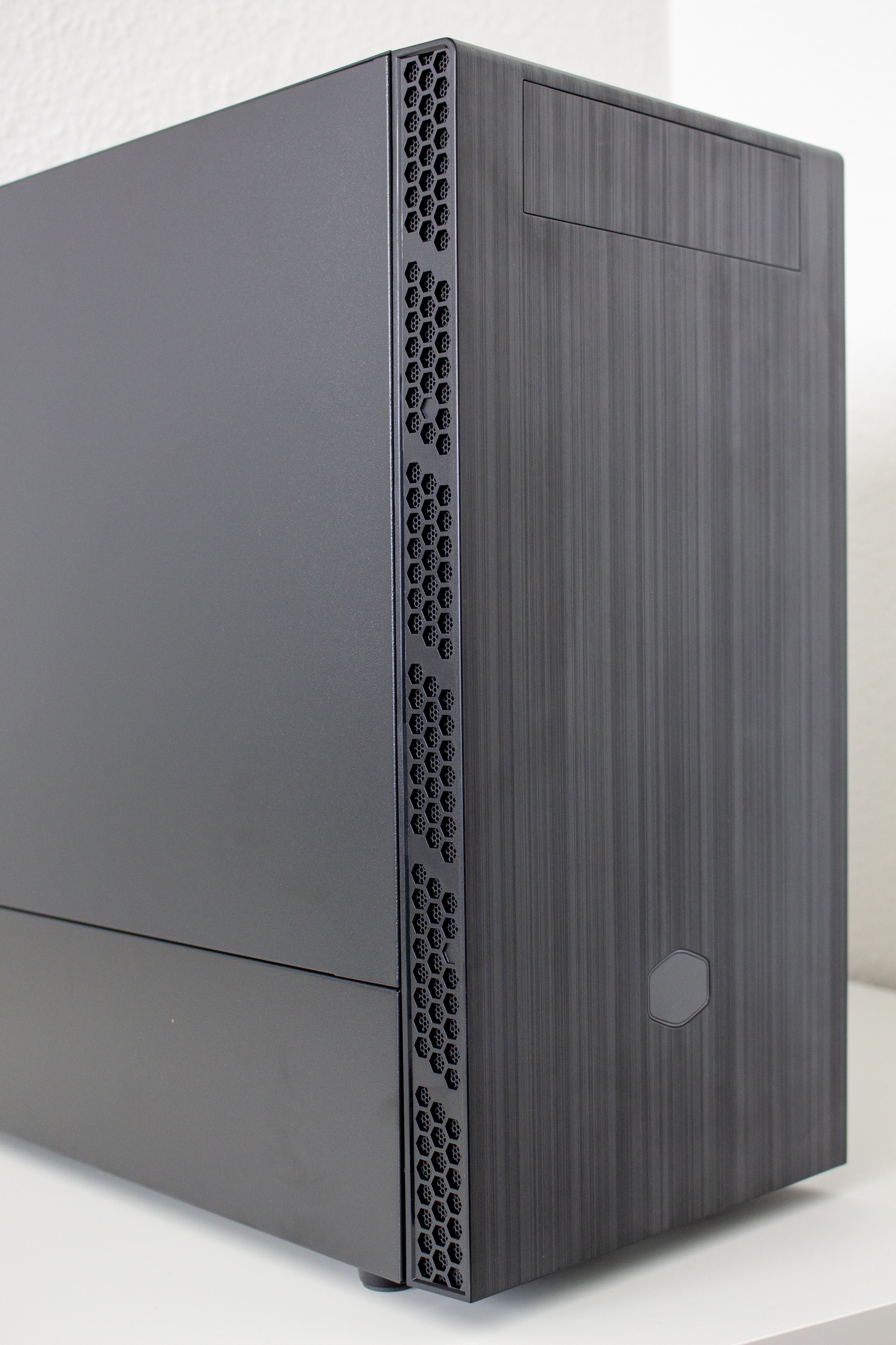 Das Cooler Master MasterBox MB400L ist äußerlich äußerst zurückhaltend und zeitlos gestaltet. Das Frontpanel besteht zwar aus Kunststoff, erinnert optisch aber an gebürstetes Aluminium. Im oberen Bereich befindet sich die entfernbare Blende für das 5,25″-Laufwerk. Wie bei jedem Hersteller darf natürlich das Logo auch nicht fehlen. Um aber den schlichten Look der Front beizubehalten, verzichtet Cooler Master bewusst auf den Schriftzug. Umrandet wird das Logo von einem Streifen aus klarem Kunststoff. Dadurch scheint ein hinter der Front angebrachter RGB-Lüfter leicht durch. Um einen guten Airflow gewährleisten zu können, verfügt das Frontpanel beidseitig über großflächige Mesh-Elemente, die gleichzeitig auch noch als Staubfilter dienen sollen. Zudem können in der Front zwei Lüfter (120 oder 140 Millimeter) befestigt werden.