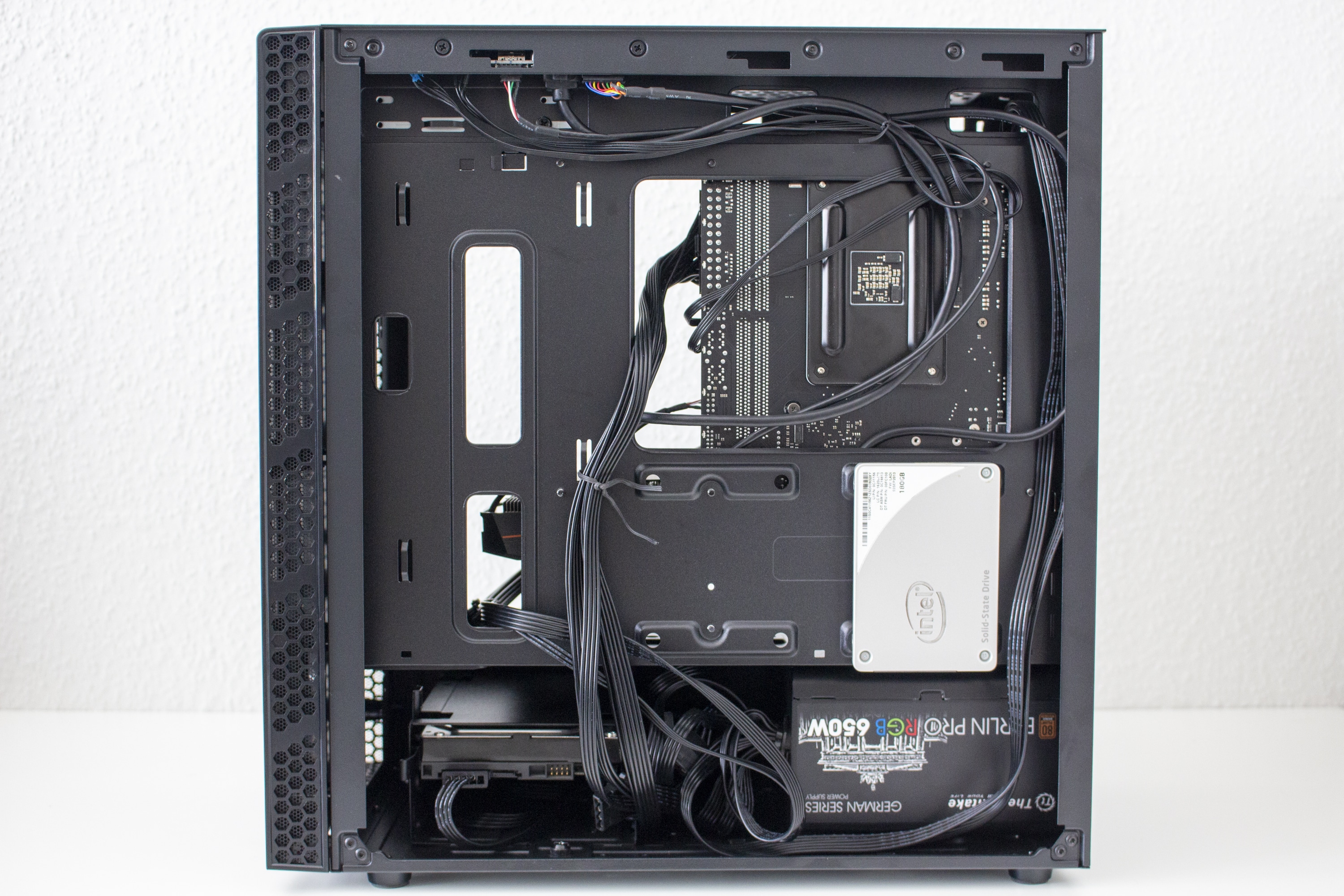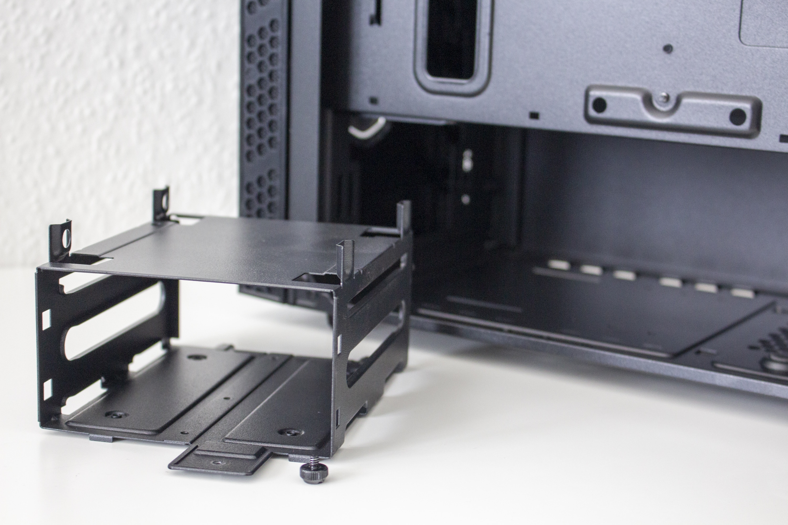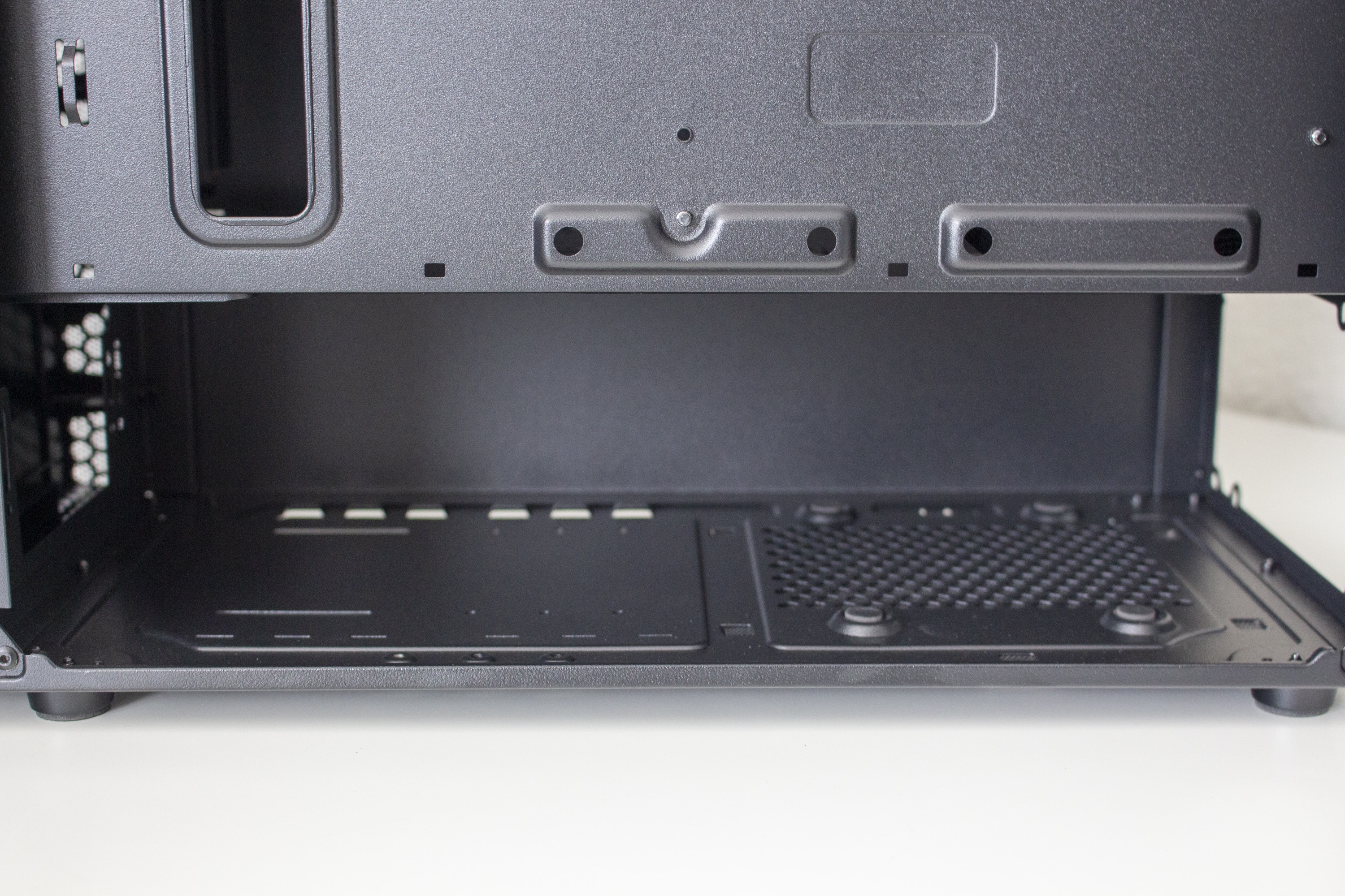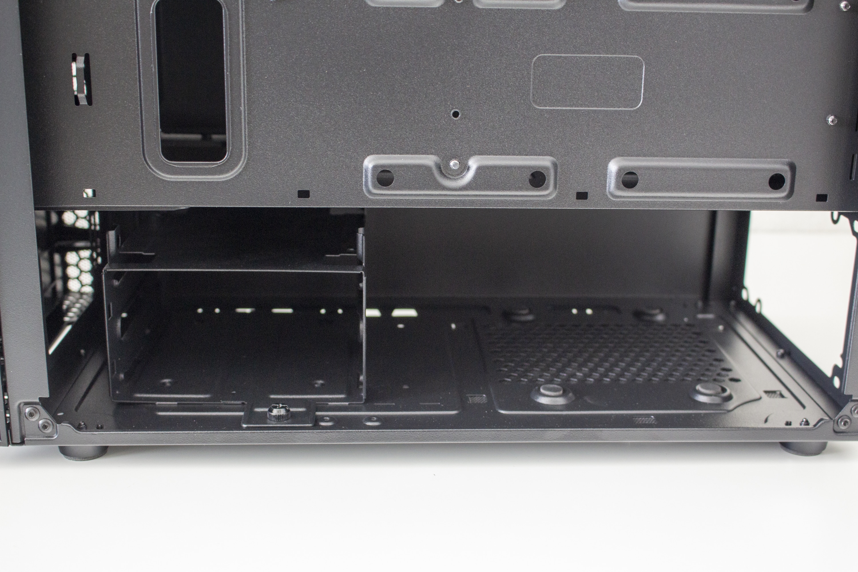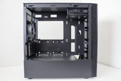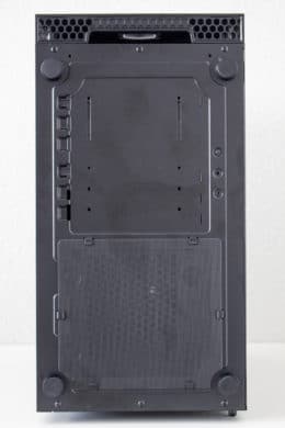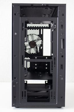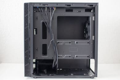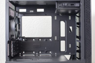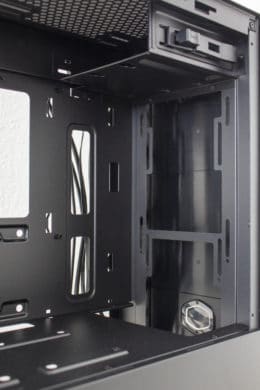 Da es zur Vorderseite nichts mehr zu sagen gibt, wenden wir uns nun der Rückseite zu. Zu finden sind hier diverse Haltepunkte für Kabelbinder und zwei potenzielle Montagepunkte für 2,5″-SSD-Rahmen. Zur Verlegung der Kabel stehen dem Käufer hier bis zu 22 Millimeter Platz zur Verfügung. In der Zone unterhalb der Abdeckung findet das Netzteil auf vier schmalen Gummipuffern Platz. Daneben hat der Hersteller den modularen Festplattenkäfig befestigt.