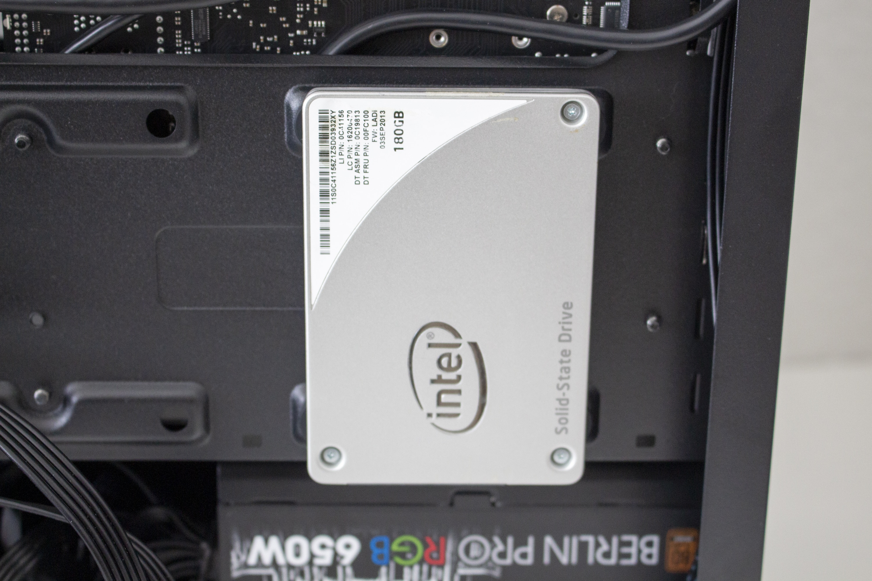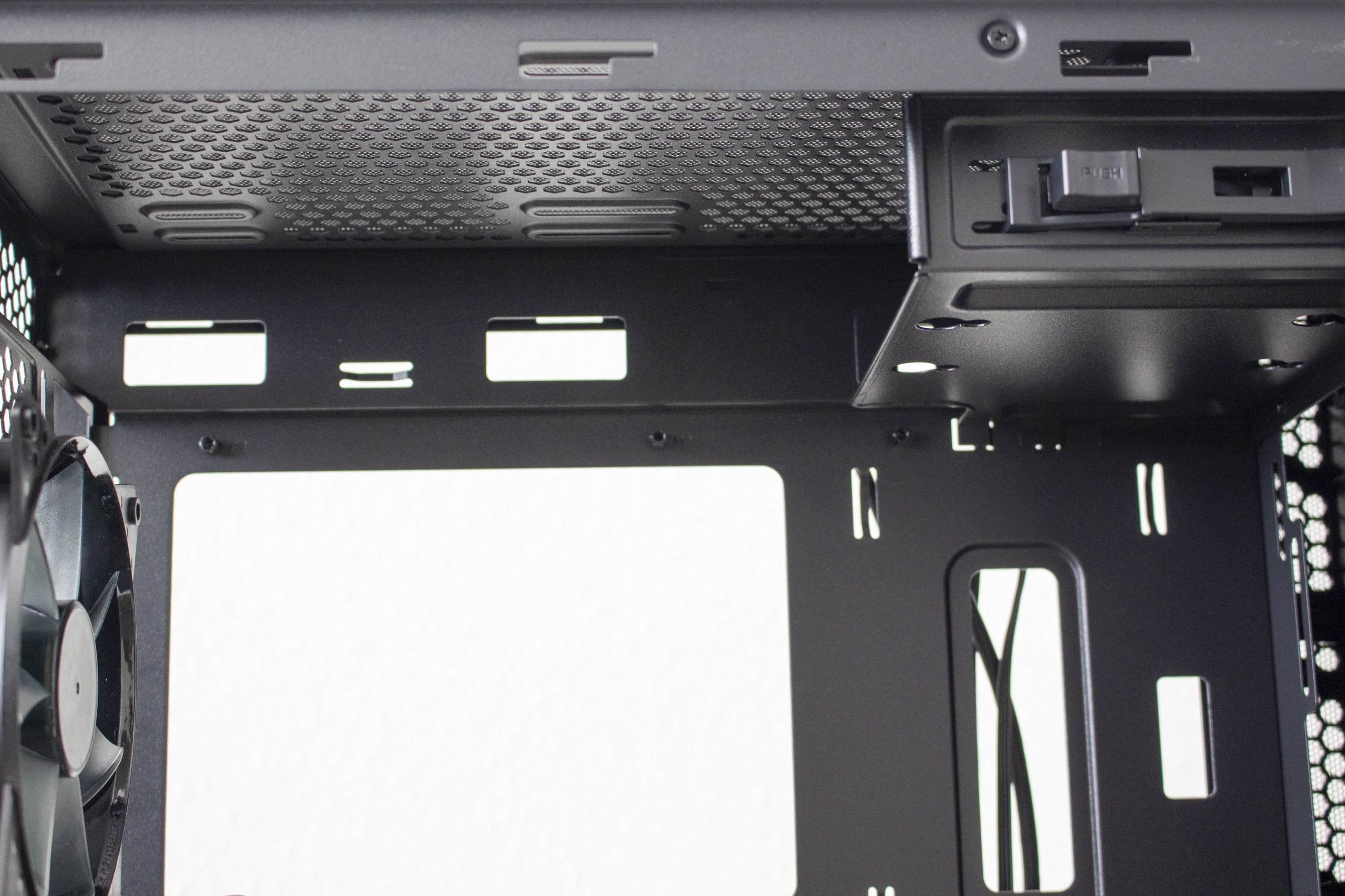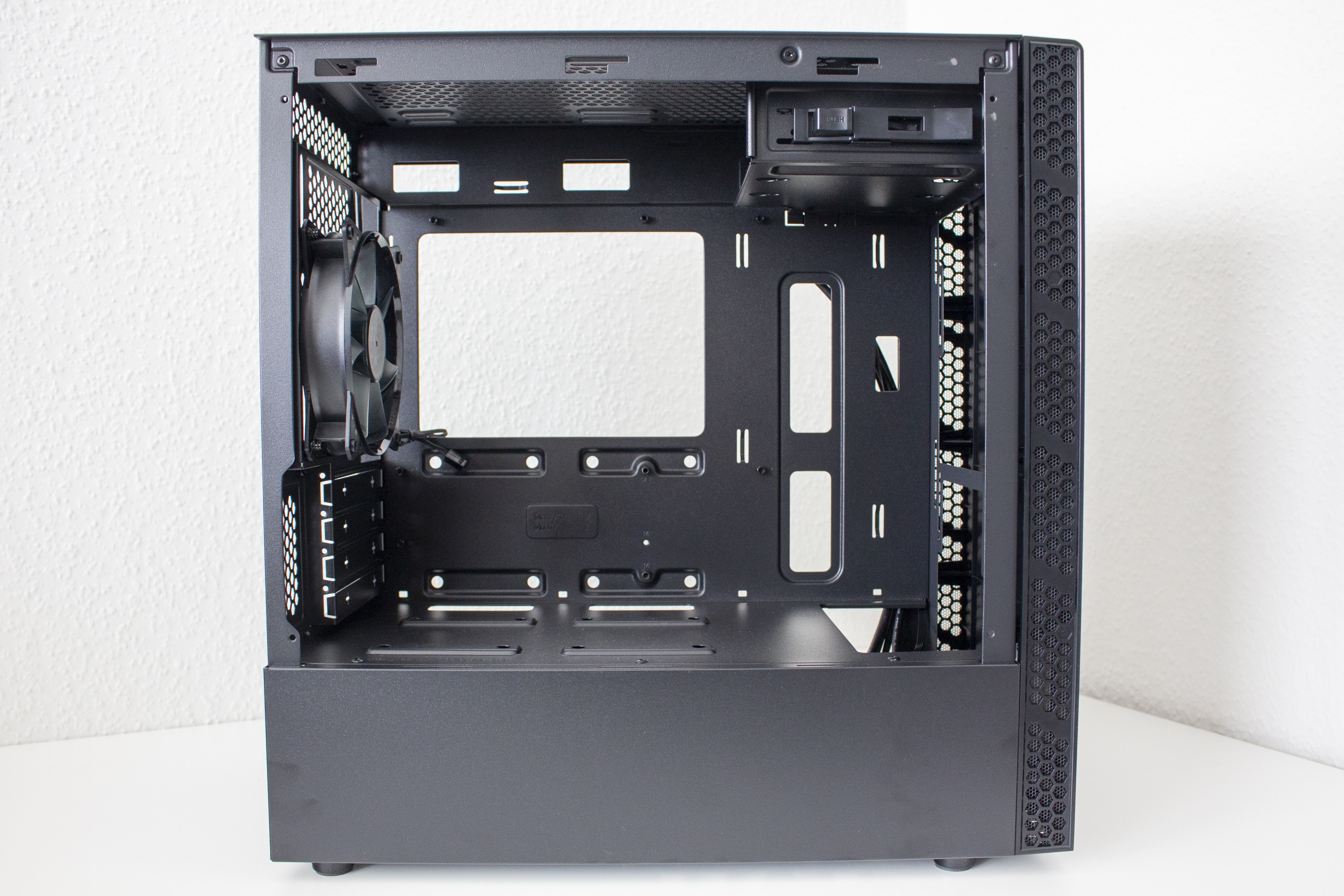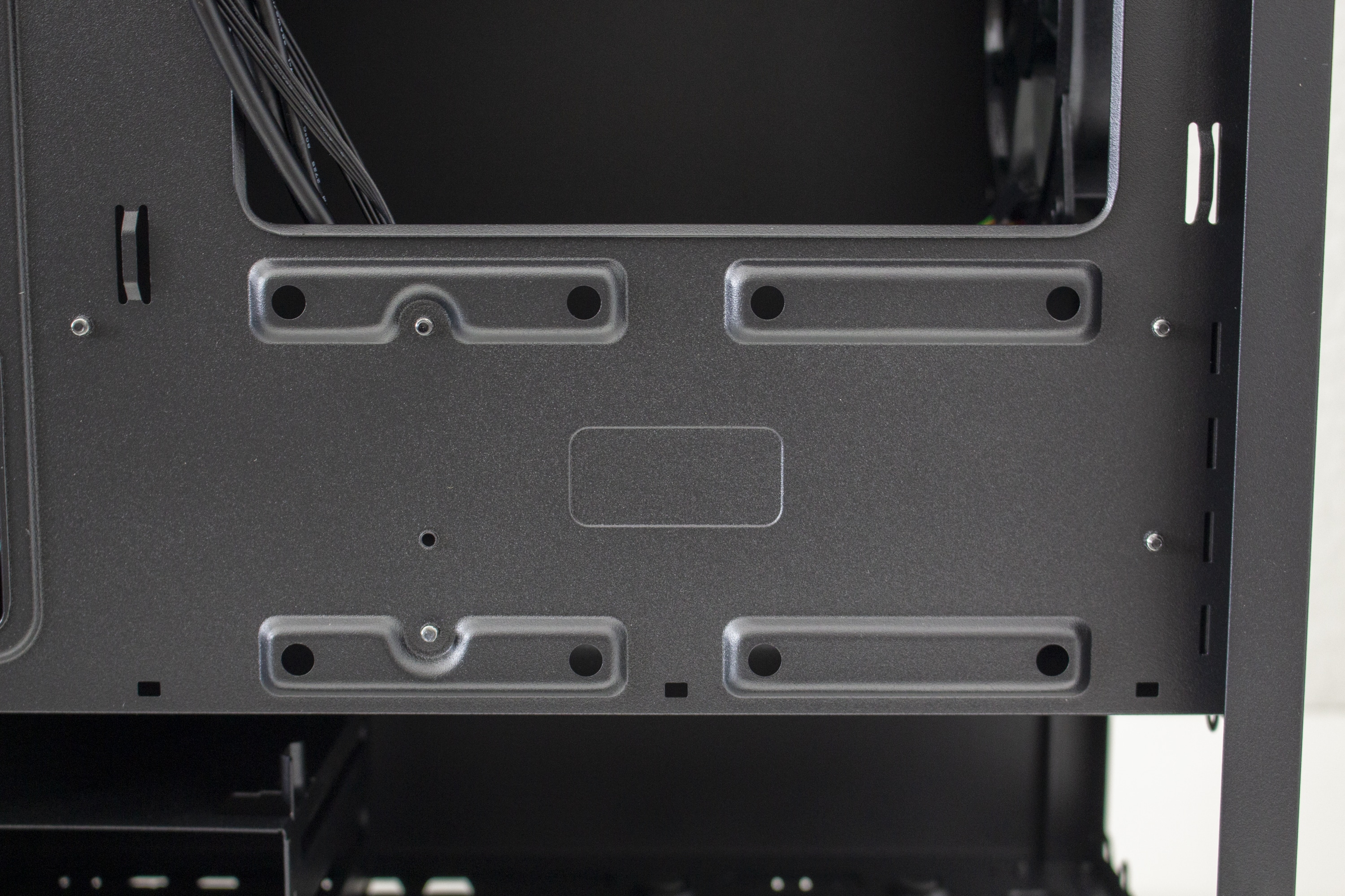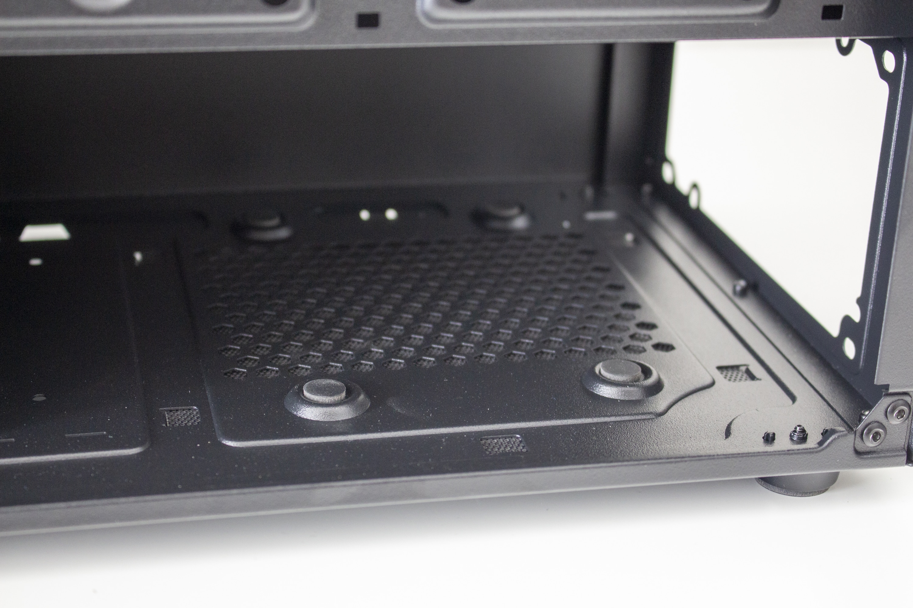 Da es zur Vorderseite nichts mehr zu sagen gibt, wenden wir uns nun der Rückseite zu. Zu finden sind hier diverse Haltepunkte für Kabelbinder und zwei potenzielle Montagepunkte für 2,5″-SSD-Rahmen. Zur Verlegung der Kabel stehen dem Käufer hier bis zu 22 Millimeter Platz zur Verfügung. In der Zone unterhalb der Abdeckung findet das Netzteil auf vier schmalen Gummipuffern Platz. Daneben hat der Hersteller den modularen Festplattenkäfig befestigt.