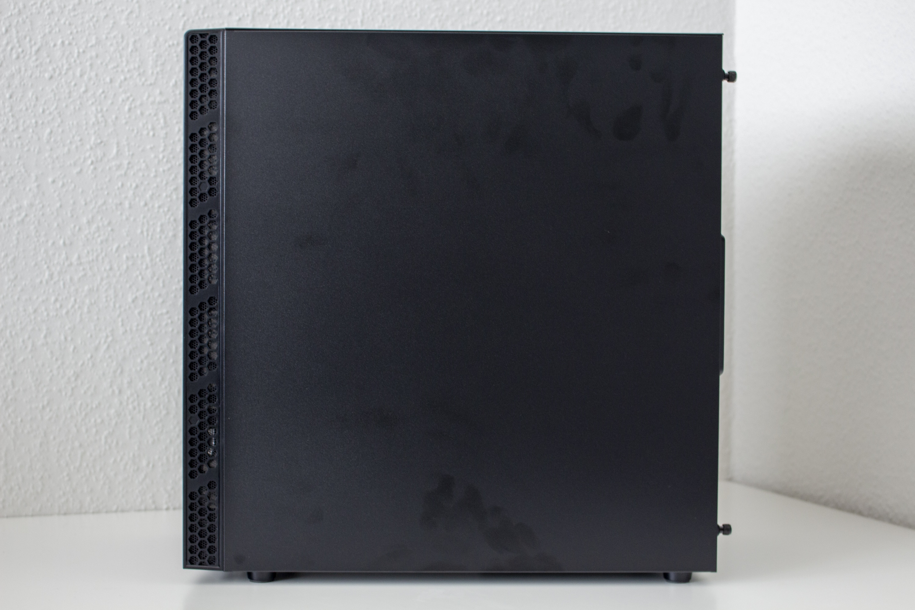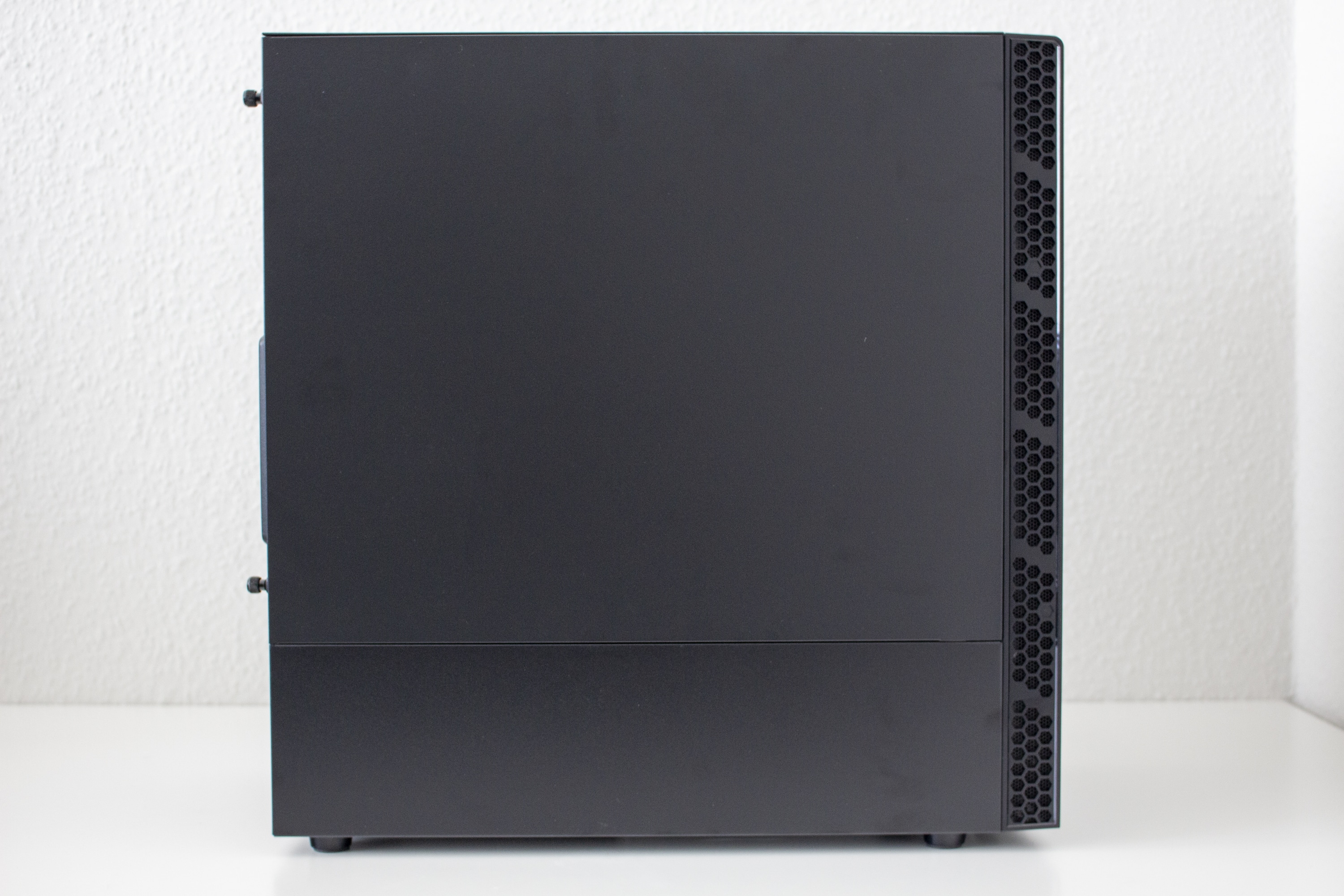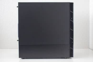 Das zurückhaltende Design setzt sich auch an der Seite fort. Das MB400L verfügt über zwei normale Seitenteile aus Stahl. Diese verfügen über „Captive-Thumbscrews“ und Griffmulden, um die Demontage zu erleichtern. Die Stabilität der Sidepanels ist für die angepeilte Preisklasse gerade noch in Ordnung. Auffällig ist außerdem, dass das linke Seitenelement nicht die komplette Seite abdeckt. Das untere Viertel gehört zum Korpus bzw. der Netzteilabdeckung und ist fest vernietet.
