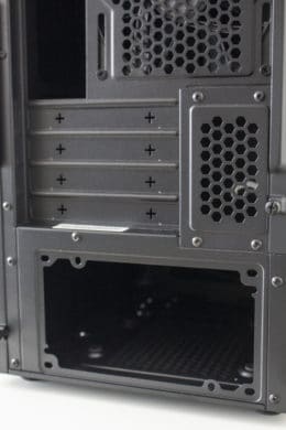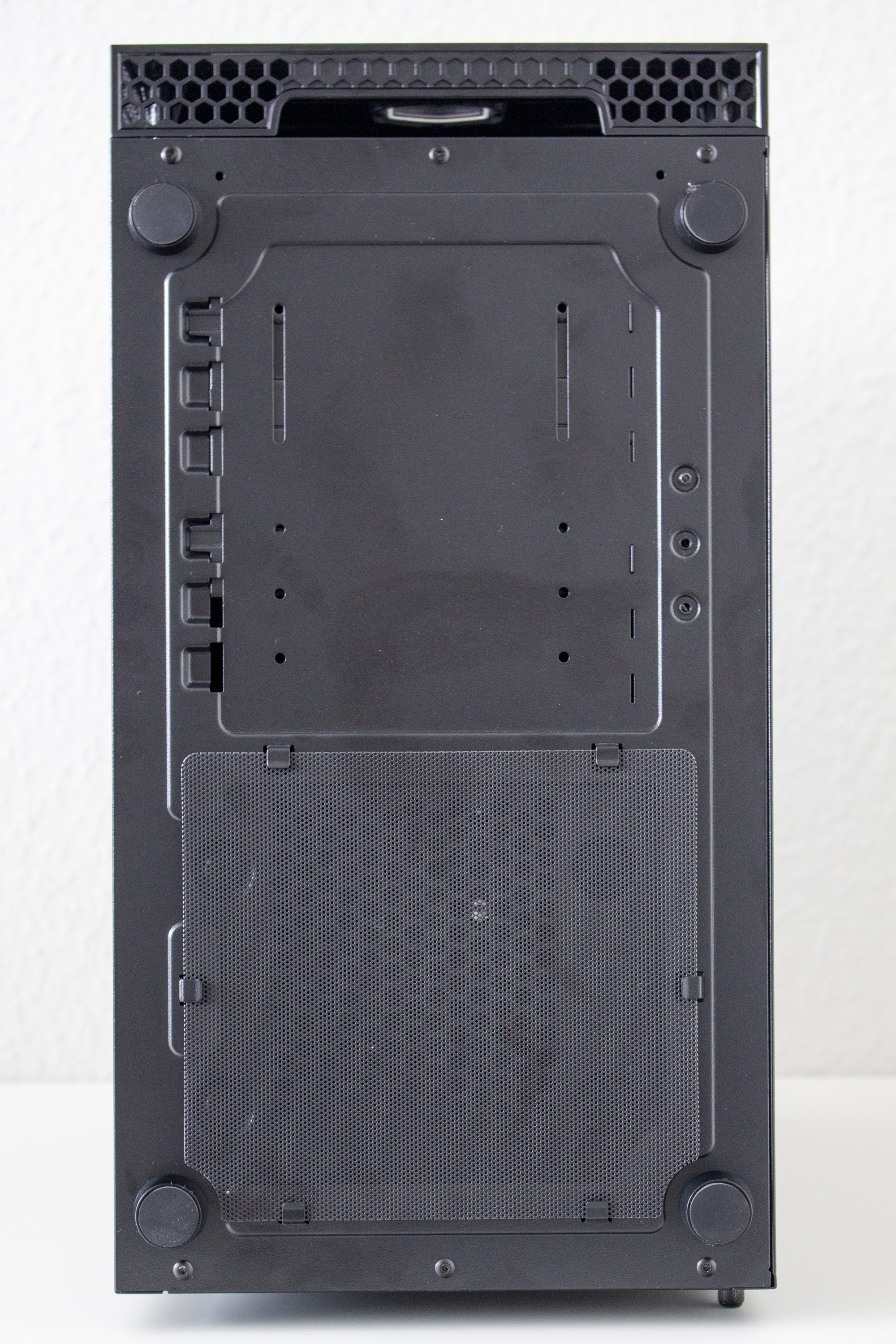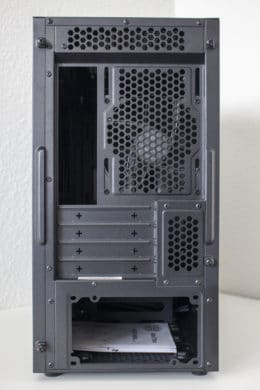 Rückseite und Unterseite des Towers offenbaren keine Besonderheiten. Das Gehäuse steht auf vier kurzen Füßen aus Kunststoff, die zur Geräuschminimierung mit dünnen Gummipuffern versehen wurden. Zum Schutz vor Staub wurde an der Unterseite leider nur eine simple Filtermatte aus Mesh angebracht. Oberhalb des Netzteil verfügt das MB400L über vier Slots für Erweiterungskarten. Diese müssen herausgebrochen werden und es befinden nicht keine Ersatzblenden im Lieferumfang. Als letztes ist an der Rückseite nur noch der vorinstallierte Gehäuselüfter zu erwähnen. Die Montage erfolgt über vier Schrauben und ist durch ein Schienensystem variabel gestaltet.