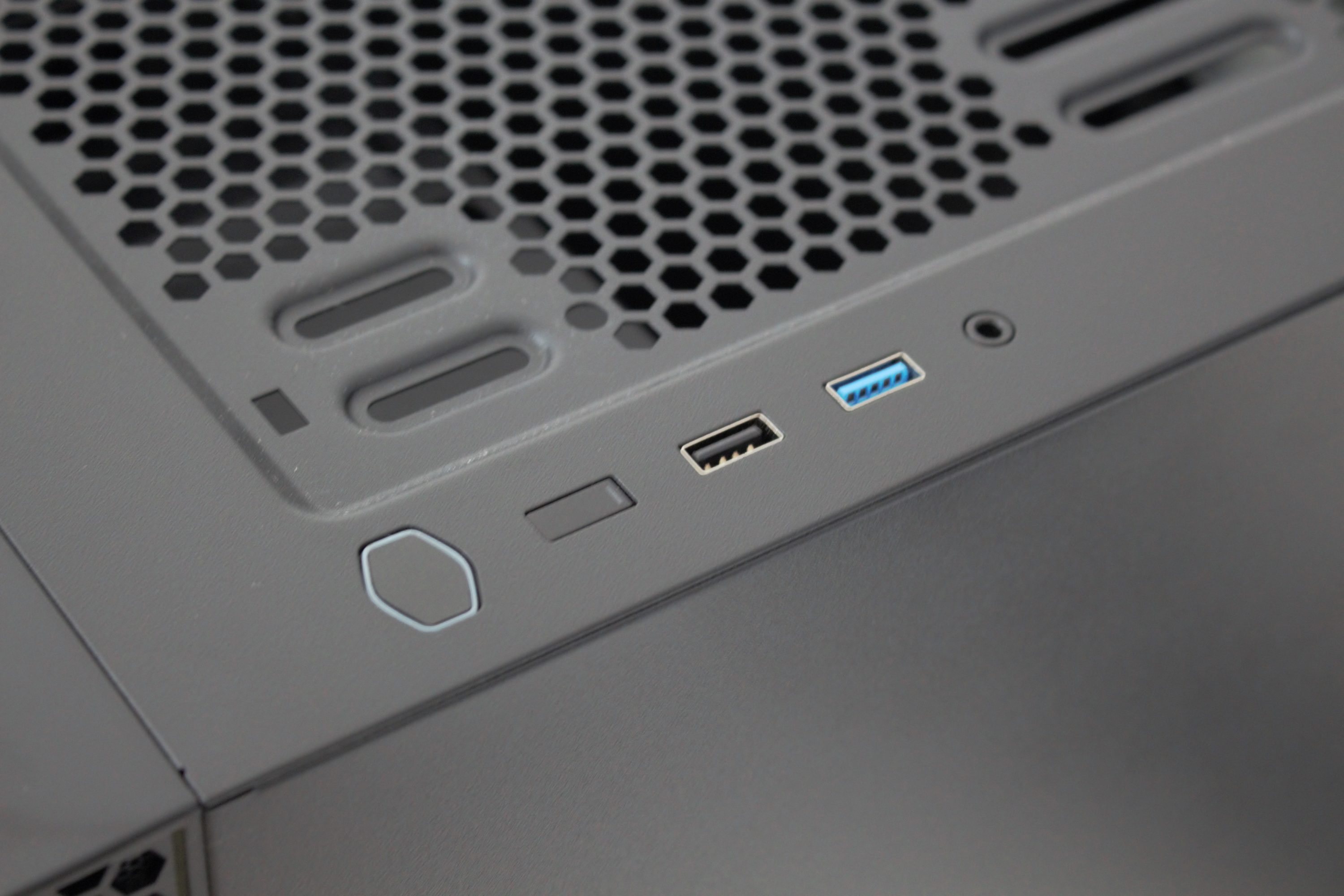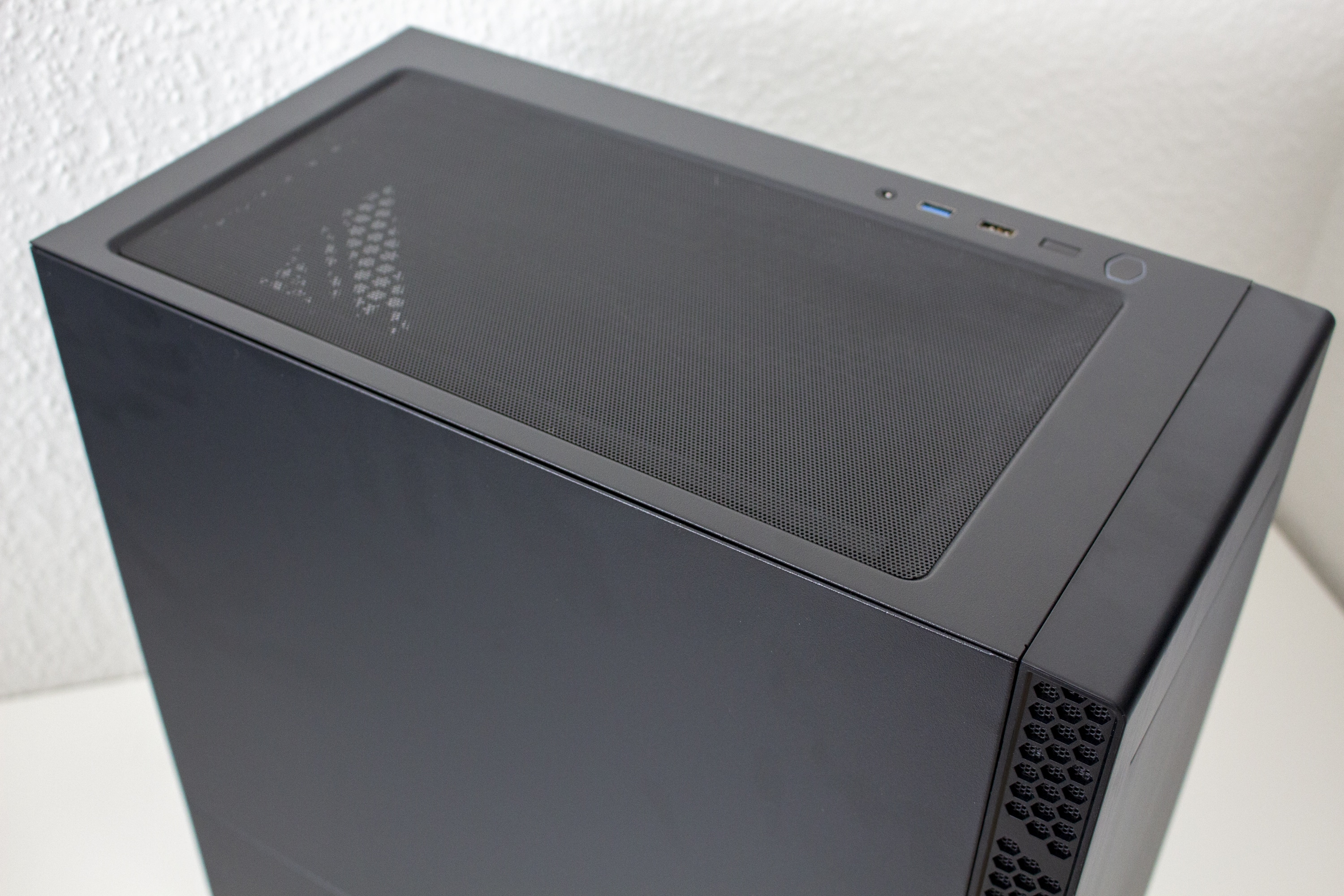 Der Deckel des MB400L zeichnet sich vor allem durch eine großflächige Öffnung für Lüfter oder Radiatoren aus. Die Öffnung ist leicht vertieft und sitzt nicht symmetrisch im Deckel. Zur Verbesserung der Optik und zum Schutz vor Staub, legt Cooler Master diesem Mini-Tower noch einen magnetischen Staubfilter bei. Ebenfalls im Deckel hat der Hersteller das I/O-Panel untergebracht. Dieses verfügt über zwei USB-Anschlüsse (1x USB 3.0, 1x USB 2.0), einen Combo-Port für Kopfhörer und Mikrofon, sowie zwei Knöpfe für Power und Reset.