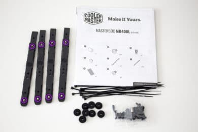 Das Cooler Master MB400L kommt gut und sicher verpackt in einem braunen Karton mit schwarzer Schrift. Innerhalb des Kartons ist der Tower von zwei Blöcken aus normalem Styropor und einer Folie aus Kunststoff umhüllt. Auf dem Karton sind Bilder des Towers und alle wichtigen technischen Daten abgedruckt. Das mitgelieferte Zubehör befindet sich in einem Beutel und ist innerhalb des Gehäuses mit einem Kabelbinder befestigt. Mitgeliefert werden alle wichtigen Schrauben, eine Bedienungsanleitung, neun schwarze Kabelbinder, eine Nuss zum Eindrehen von Abstandshaltern und vier Schienen zum Einbau von Festplatten. Außerdem gehören zum Lieferumfang der vorinstallierte 120-Millimeter-Lüfter, vorinstallierte Abstandshalter, sowie ein magnetischer Staubfilter für den Deckel.