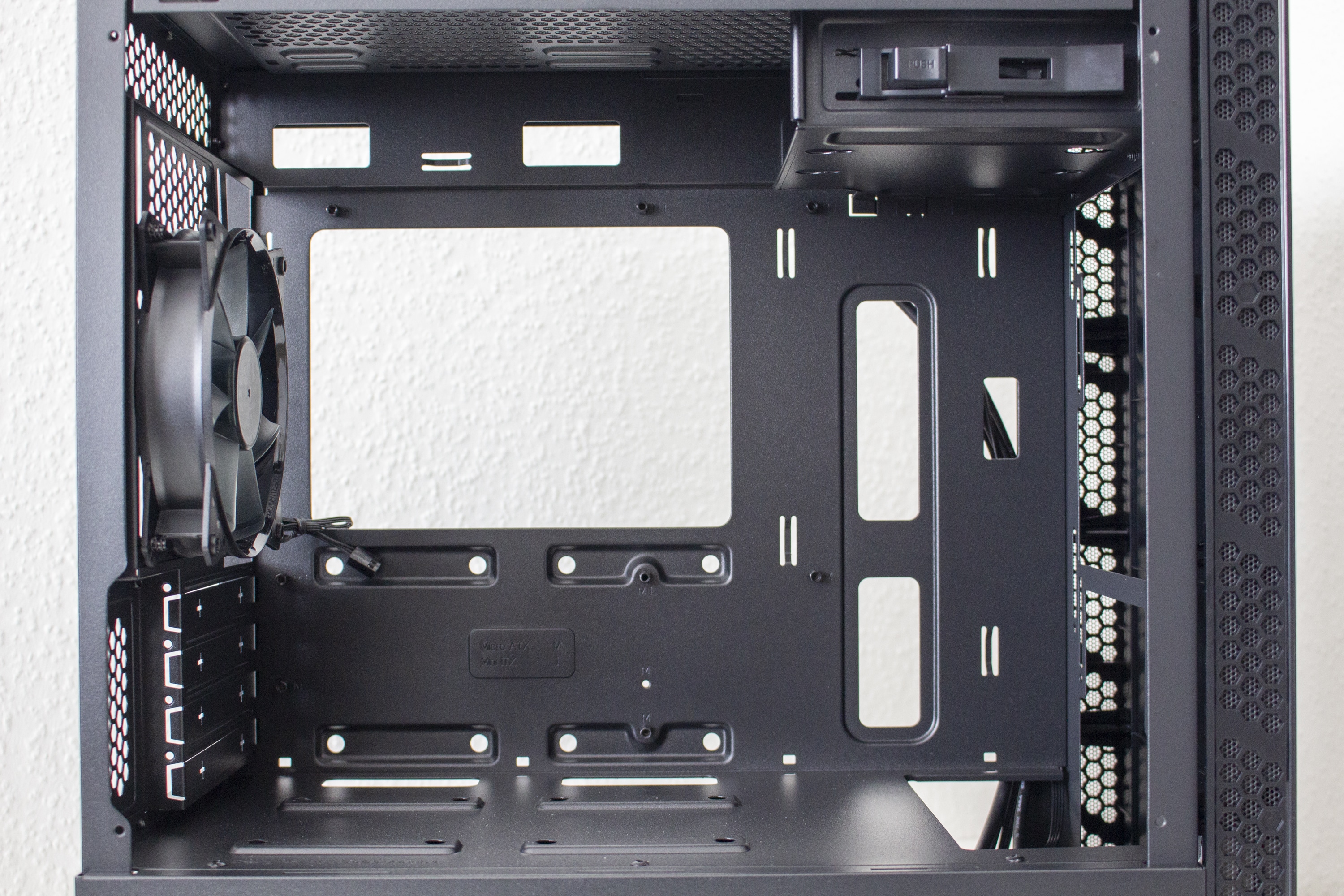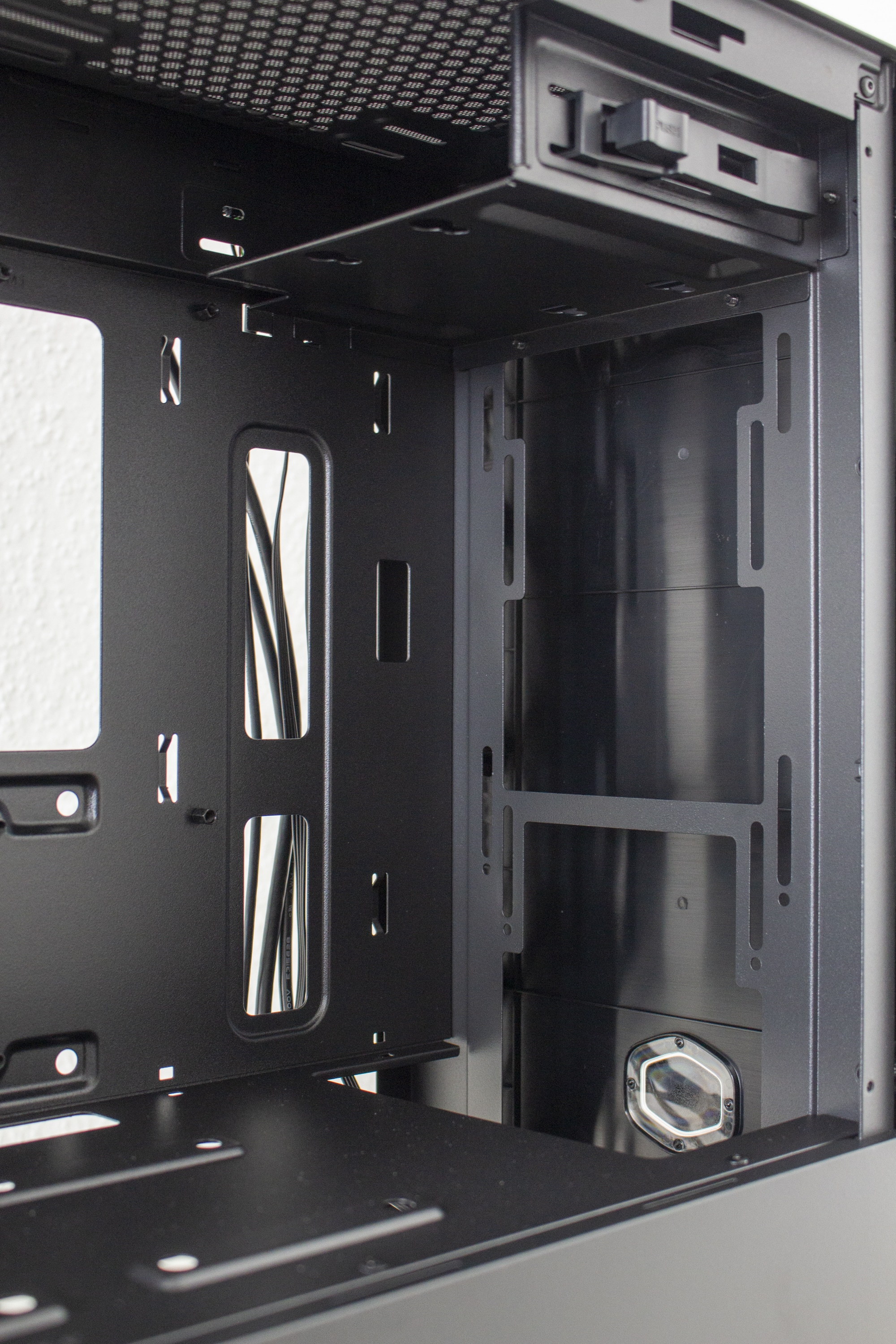 Im Innenraum setzt Cooler Master auf ein bewährtes Konzept in Form eines Zwei-Kammer-Systems mit viel Platz für Hardware und Radiatoren. Die große Hauptkammer bietet Platz für ein Mainboard im mATX-Format und Erweiterungskarten. Das Mainboard-Tray ist, mit Ausnahme eines Ausschnitts für CPU-Kühler-Backplates und mehreren Kabelmanagement-Öffnungen, komplett geschlossen. Dadurch ist der Tower auch ohne Seitenteile verwindungssteif.