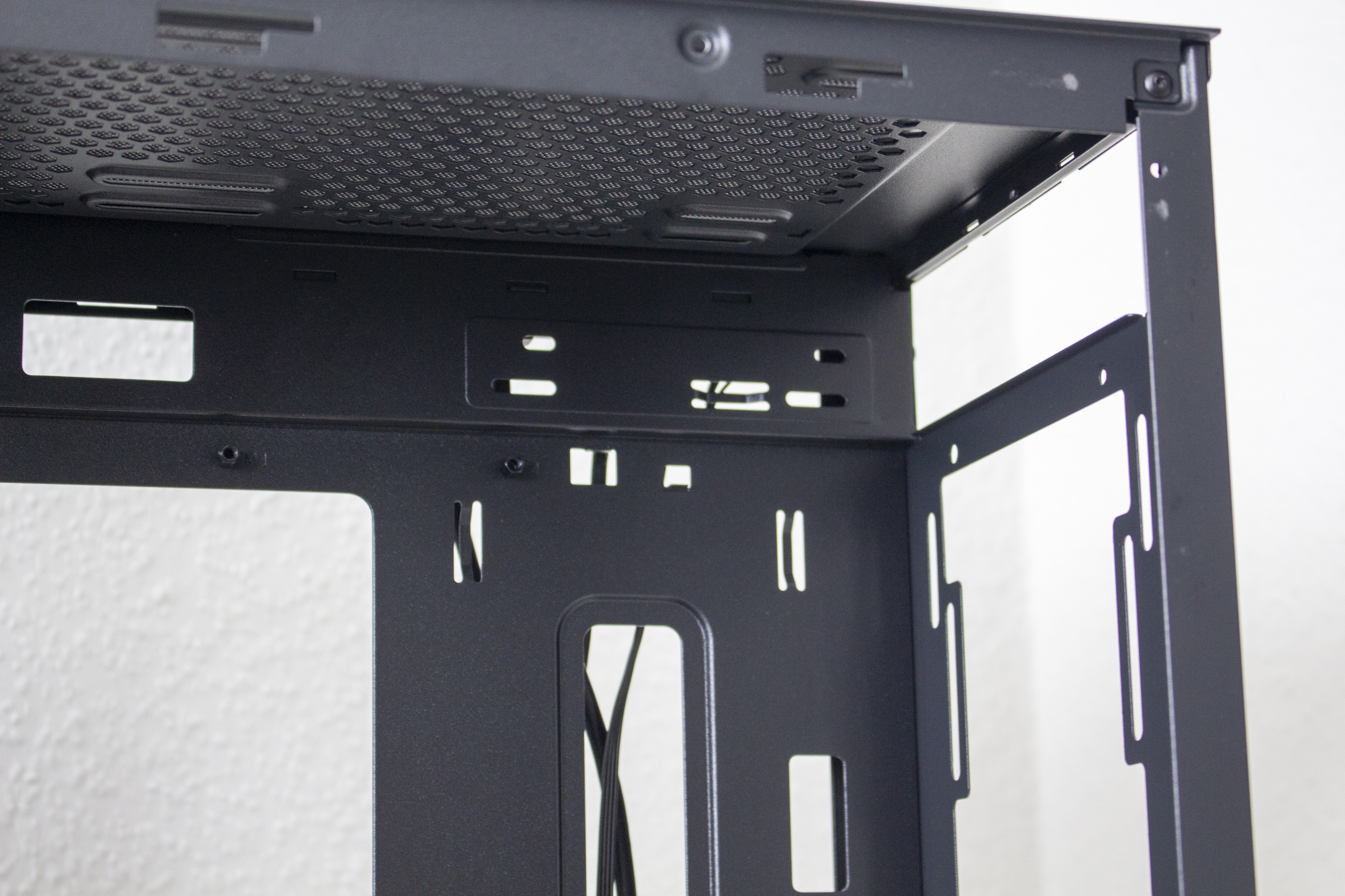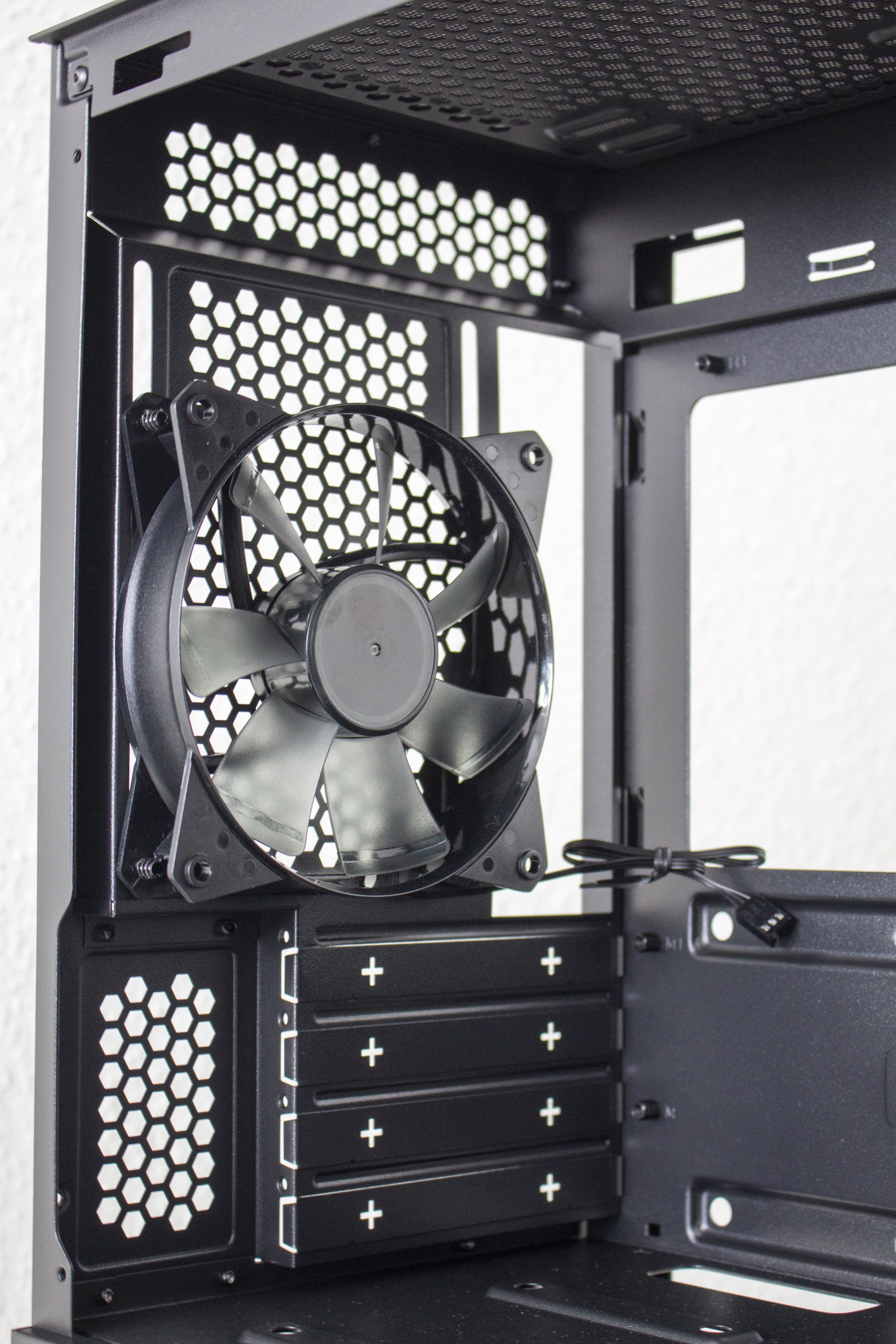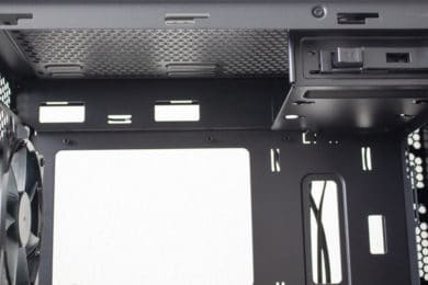 Da es in der Front keine HDD-Schlitten gibt, können optionale Frontlüfter ungehindert das Innere des Mini-Tower mit Frischluft versorgen. Die Abführung der erwärmten Luft erfolgt über den vorinstallierten Lüfter am Heck. Weitere Lüfter können im Deckel angebracht werden. Aufgrund der versetzten Montageschienen könnte hier vielleicht auch ein Radiator Platz finden, hohe RAM- oder VRM-Kühler könnten diesem Vorhaben aber schnell einen Strich durch die Rechnung machen.