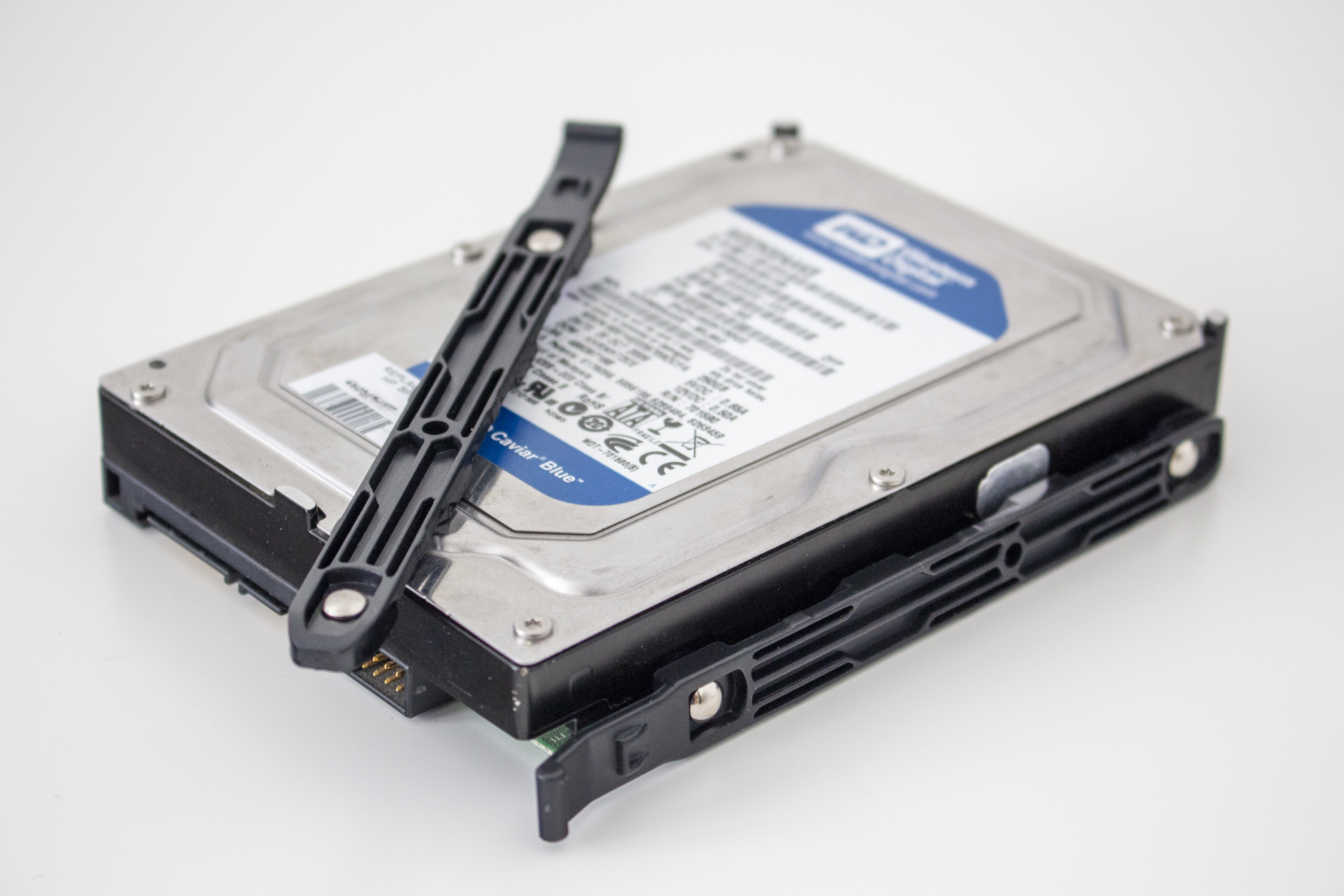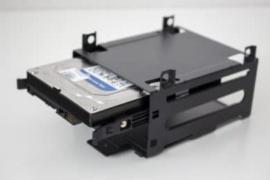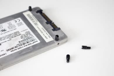 Als letzten Punkt möchten wir in diesem Kapitel noch über die Möglichkeiten zum Einbau von Datenträgern sprechen. Insgesamt könnte man im Cooler Master MB400L sieben Datenträger verbauen. Ab Werk bzw. mit dem mitgelieferten Zubehör werden aber maximal vier Datenspeicher unterstützt. Im HDD-Käfig unterhalb der Netzteilabdeckung finden bis zu drei 3,5″-Festplatten Platz. Die Montage erfolgt dabei über zwei Montageschienen die einfach angesteckt werden. Etwas interessantes hat sich Cooler Master bei Befestigungsmethode für SSDs ausgedacht. An vier möglichen Lokationen können jeweils vier Entkopplungsringe an den Korps gesteckt werden. Nachdem die SSD mit schmalen Stiften versehen wurde, kann der Datenträger anschließend einfach an der gewünschten Stelle angesteckt werden.