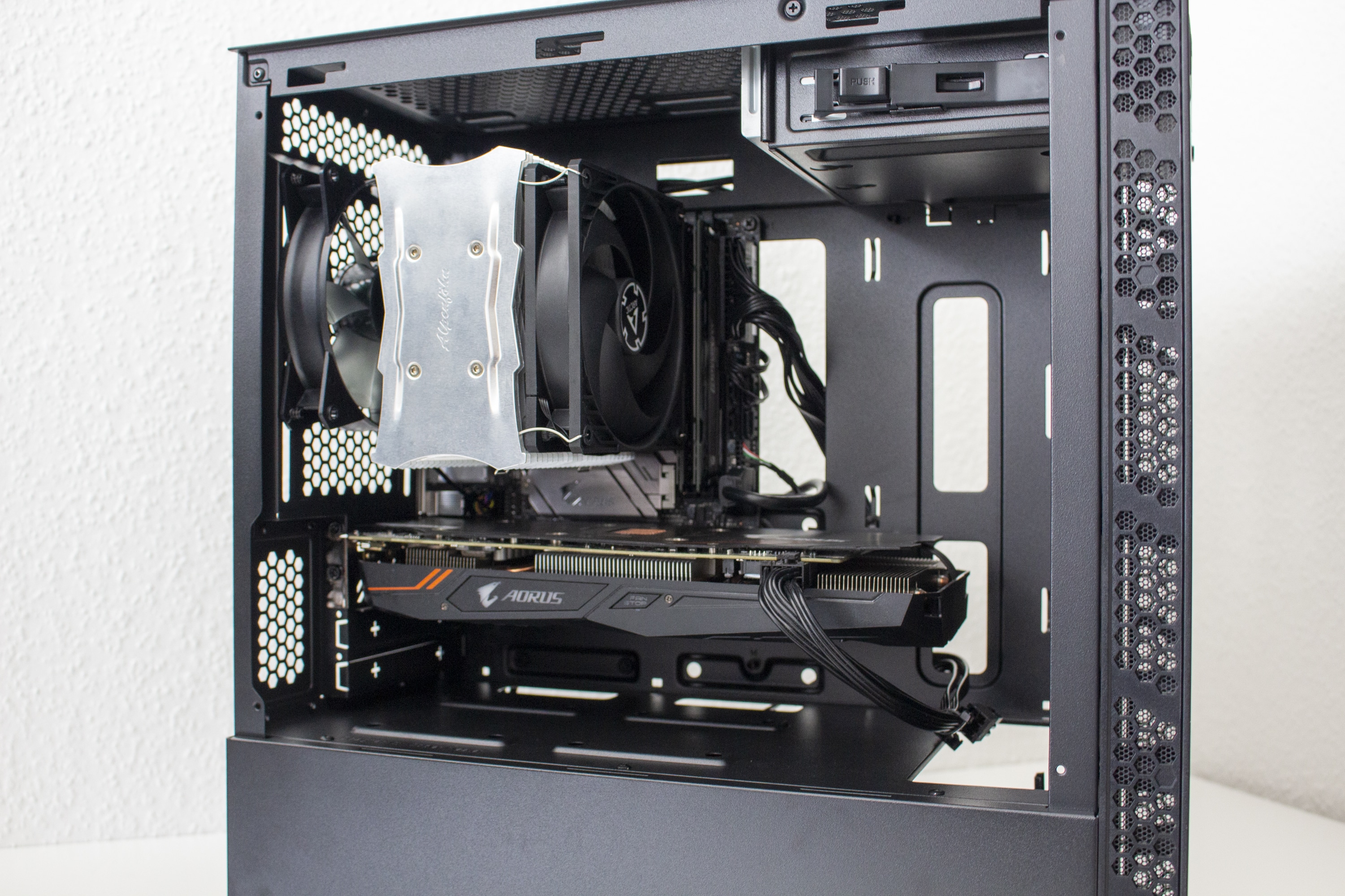 Nun kommen wir zum Systemeinbau. Als Hardware verwenden wir einen AMD Ryzen 5 1600 auf einem Gigabyte B450 I Aorus Pro WIFI* mit 32GB Crucial Ballistix Sport LT grau DDR4-3000. Der Ryzen wird von einem EKL Alpenföhn Matterhorn Pure gekühlt. Für die Bildausgabe ist eine GTX 1060 6GB von Gigabyte AORUS zuständig. Die Stromversorgung erledigt das nichtmodulare Berlin Pro RGB 650W mit RGB-Lüfter.