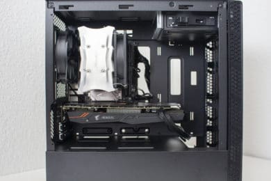 In Bezug auf die allgemeine Hardwarekompatibilität muss man sich als Käufer kaum Gedanken machen. Grafikkarten werden bis zu einer maximalen Länge von 344 Millimetern und CPU-Kühler bis zu einer maximalen Höhe von 166 Millimetern unterstützt. Das reicht für alle aktuellen GPUs und für sehr viele CPU-Kühler aus. Trotz des kompakten Aufbaus darf auch das Netzteil bis zu 325 Millimeter lang sein. In dem Fall muss der Käufer aber auf den HDD-Käfig und einen Frontradiator verzichten. Mit HDD-Käfig sollte das Netzteil nicht länger als 140 Millimeter sein. Das schränkt die Ausfall dann doch schon spürbar ein. Auch die Kompatibilität zu Wasserkühlungen ist begrenzt. Maximal wird in der Front und ohne optisches Laufwerk ein 280 Millimeter Radiator unterstützt.
