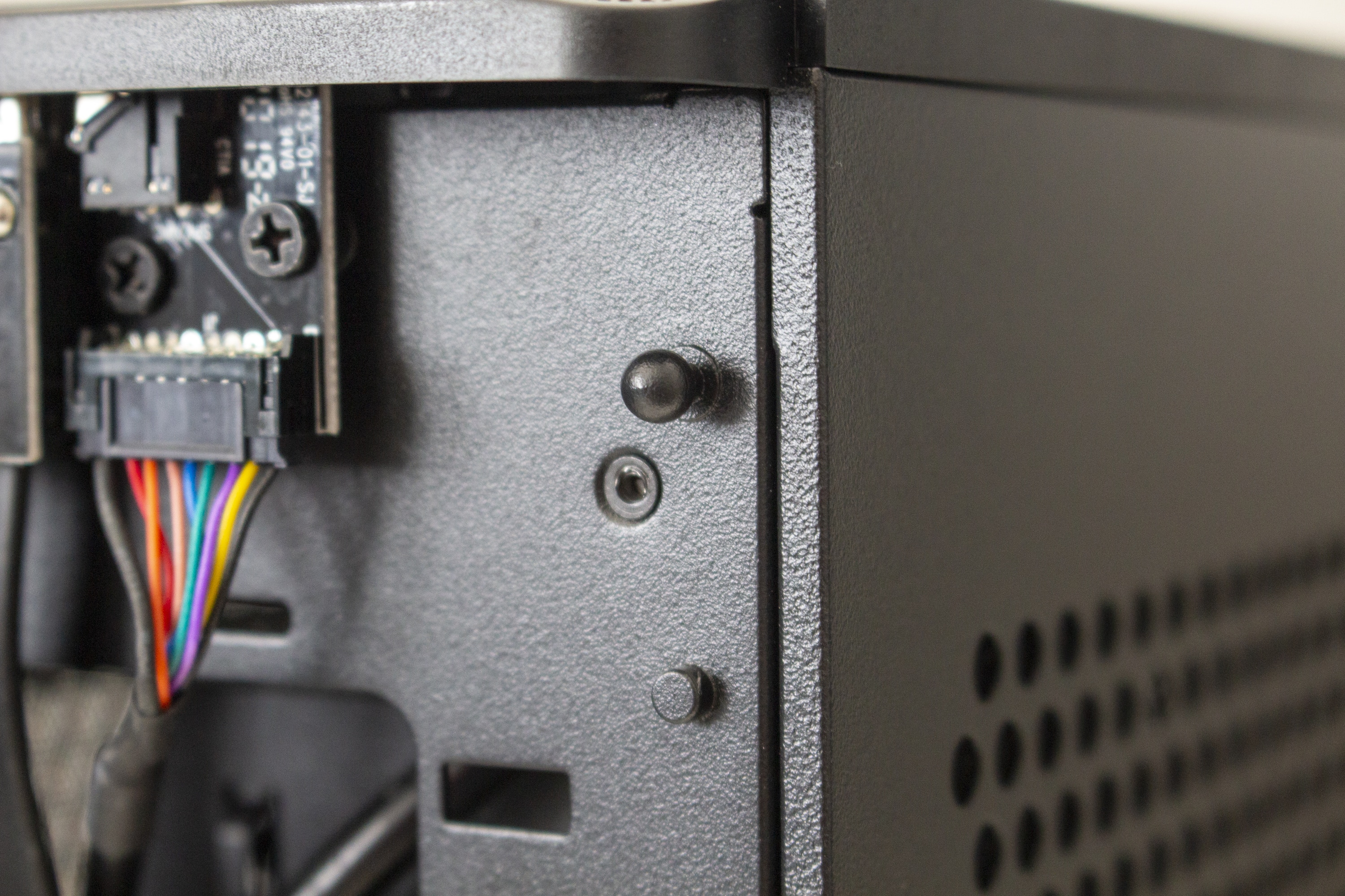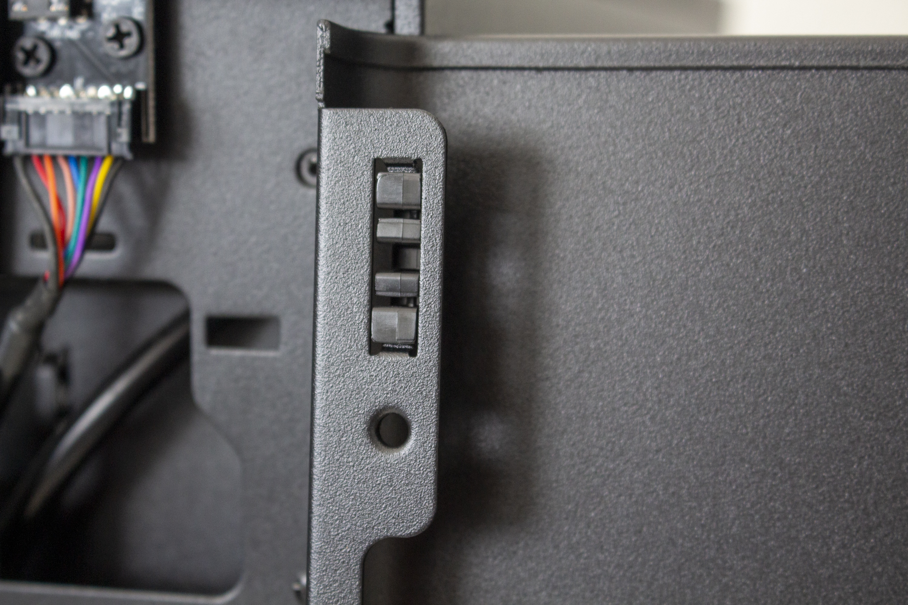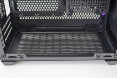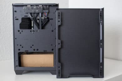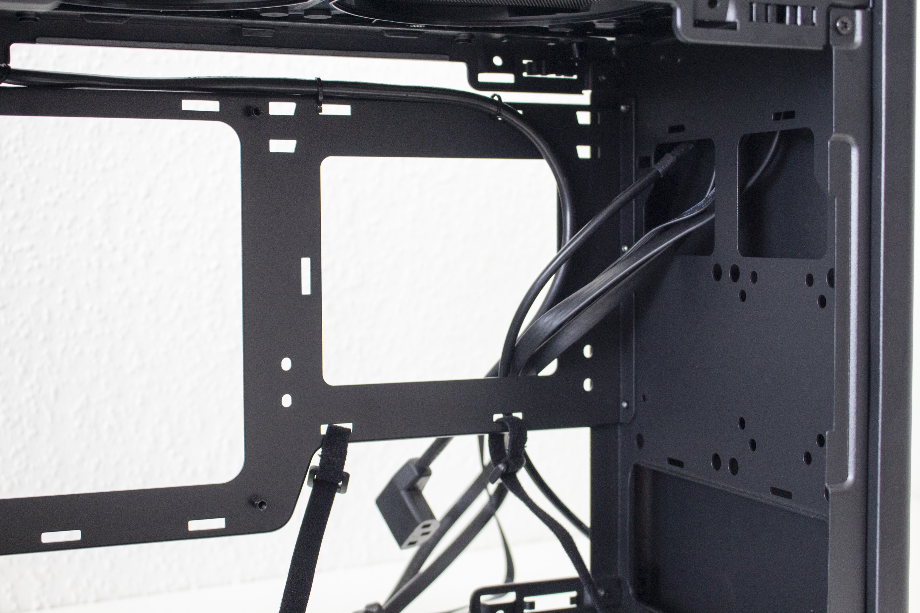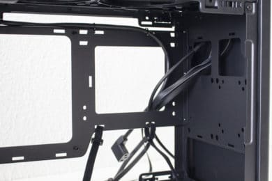 Nimmt man die Seitenteile ab, dann blickt man an der Rückseite lediglich auf das Mainboard-Tray, drei große Öffnungen und ein paar Haken zur Befestigung von Kabelbindern. Zwischen Seitenwand und Mainboard-Tray gibt es kaum Platz, sodass die Verlegung von Kabeln an dieser Stelle nahezu unmöglich ist. Da es hier nicht viel mehr zu sehen gibt, wenden wir und nun der Vorderseite zu.