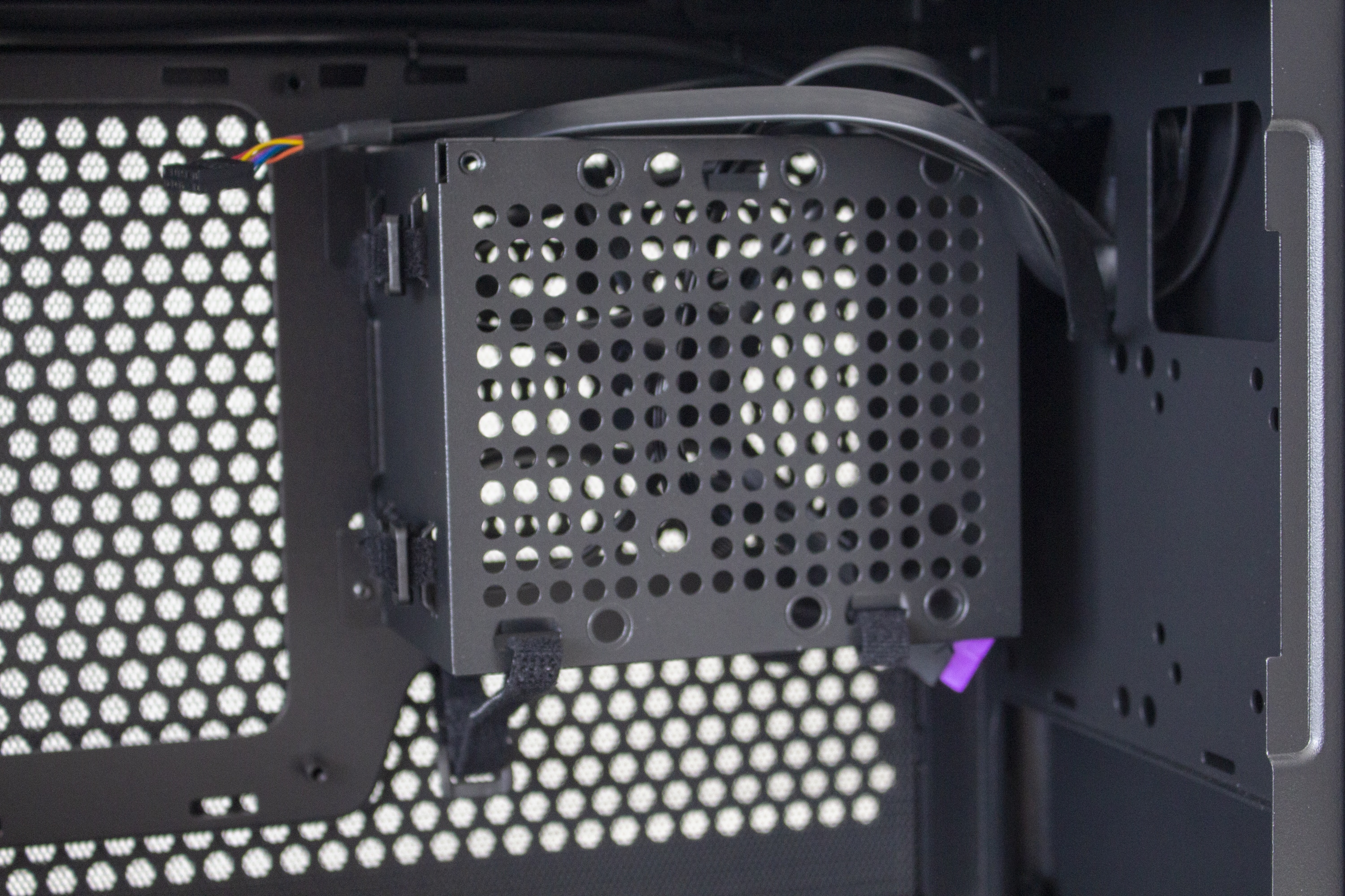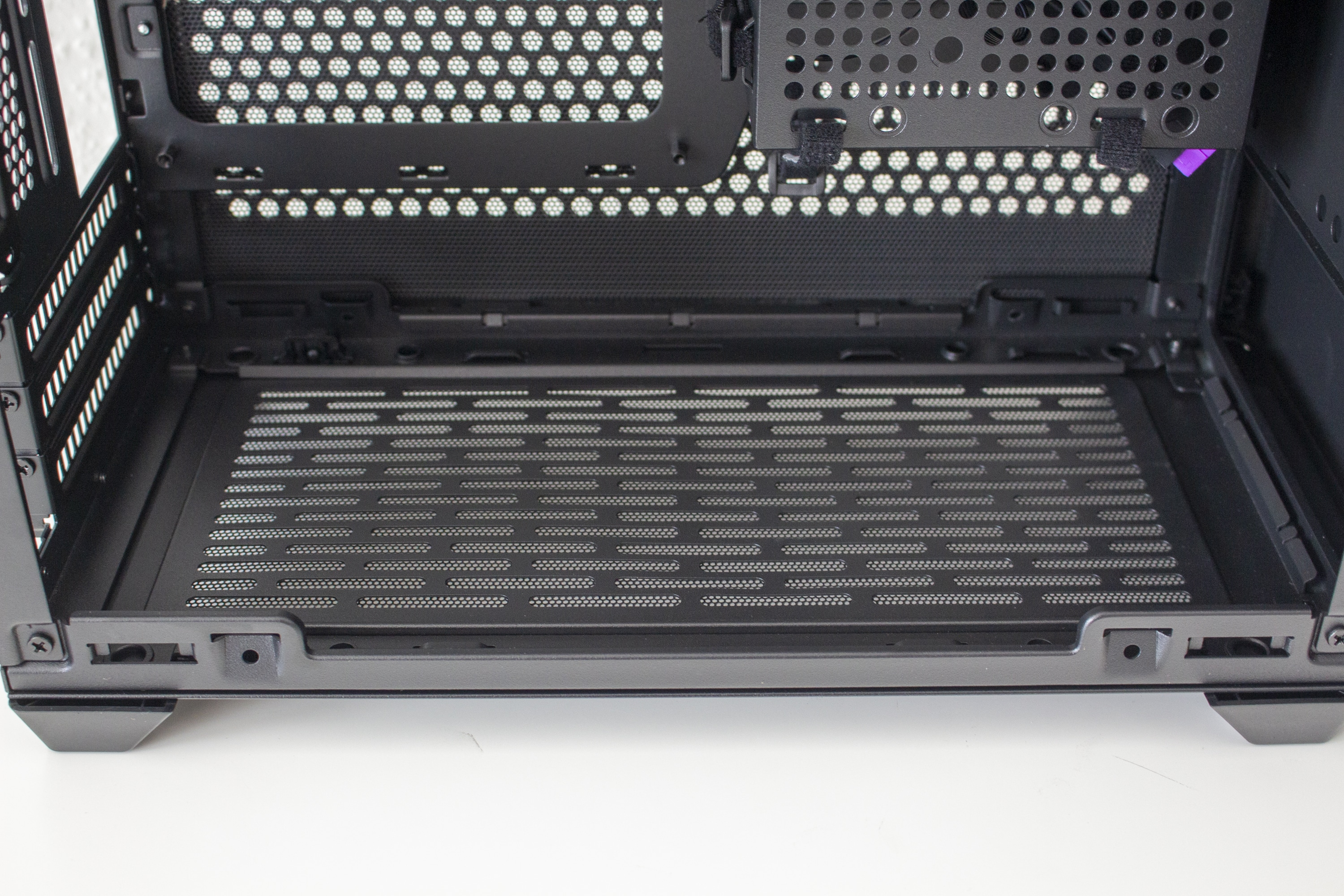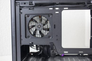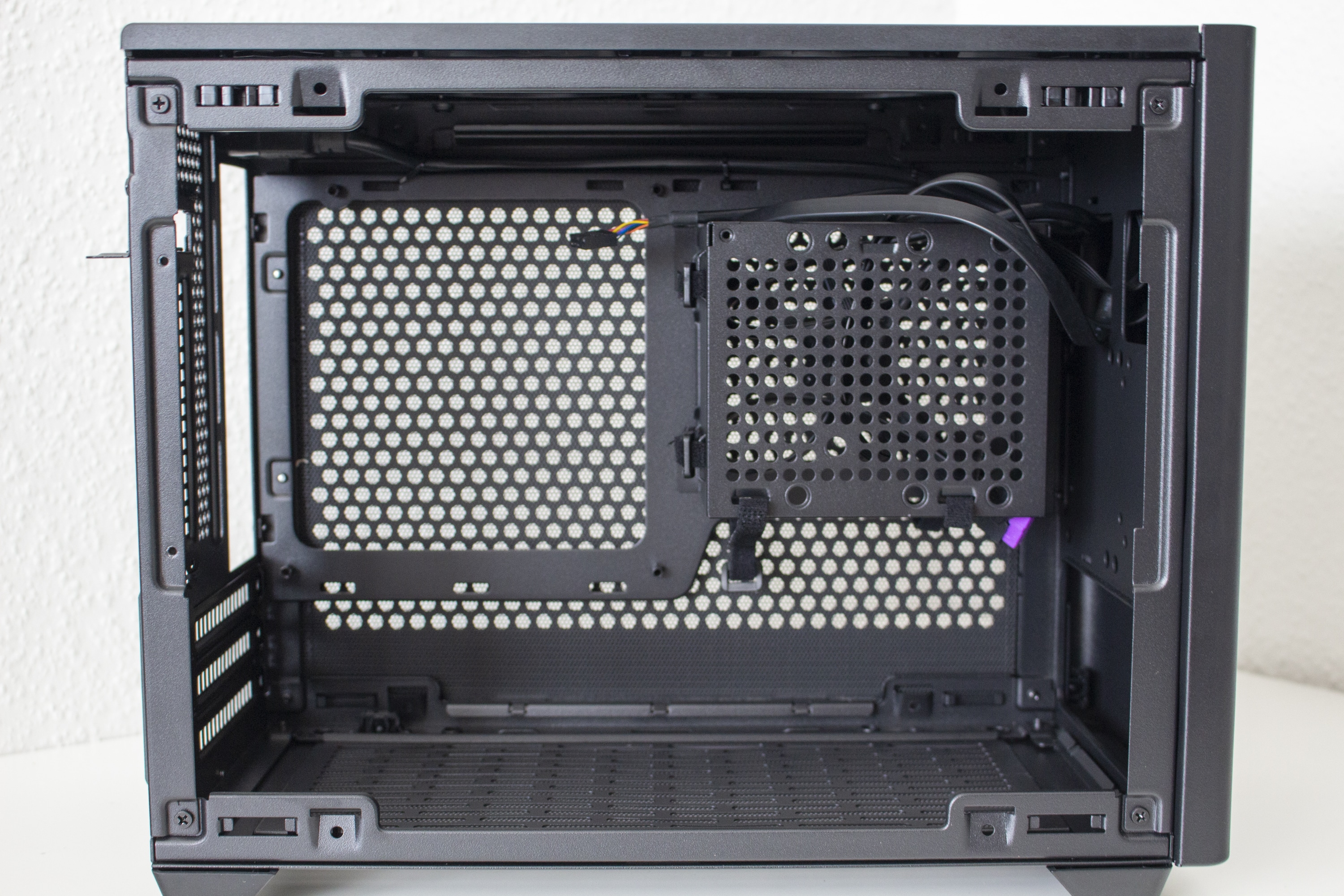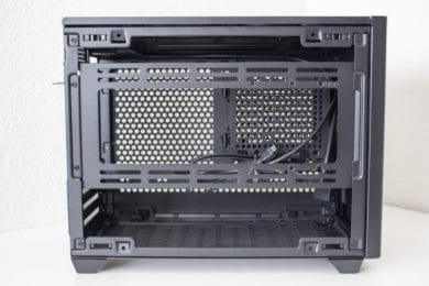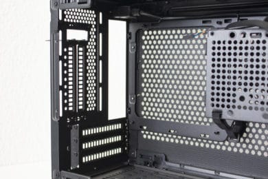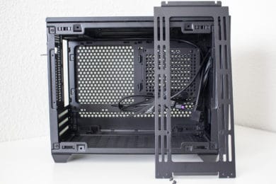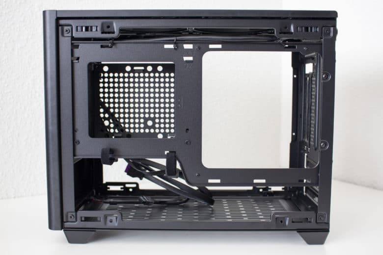 Im rechten Bereich des Innenraums hat Cooler Master einen perforierten Rahmen angebracht. Dieser dient zum Einem zur Befestigung des SFX-Netzteils und zum Anderen auch zur Montage eines 3,5″- oder eines 2,5″-Datenträgers. Möchte man ein DTX-Mainboard im Cooler Master NR200P verbauen, lässt sich der Netzteil-Rahmen auch um 90 Grad drehen und an der Wand hinter dem Frontpanel anbringen. Um den Kabelsalat möglichst gering zu halten, hat der Hersteller zahlreiche Laschen für Kabelbinder in den Rahmen gestanzt und diese teilweise sogar mit Klettstreifen versehen.