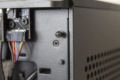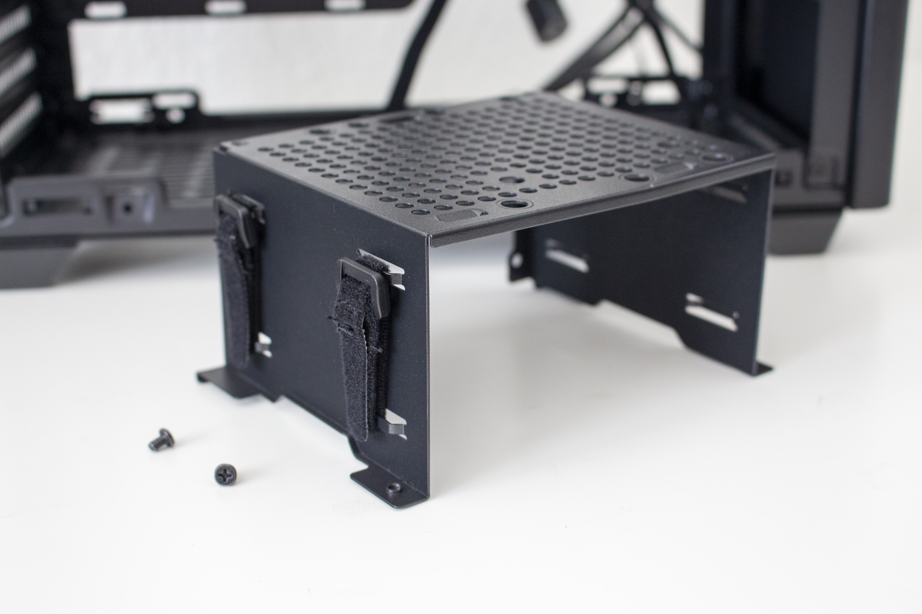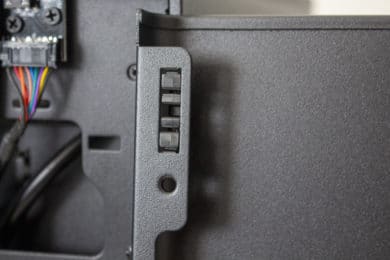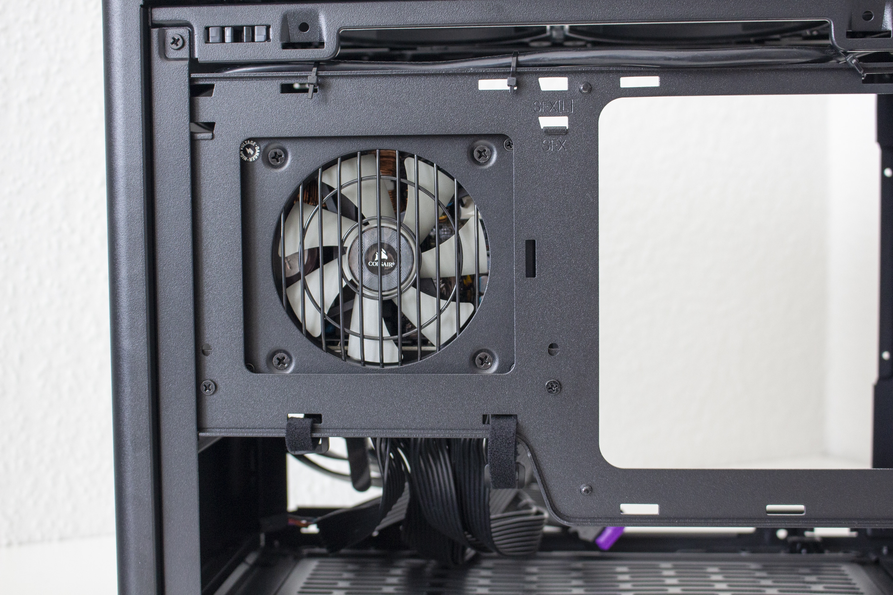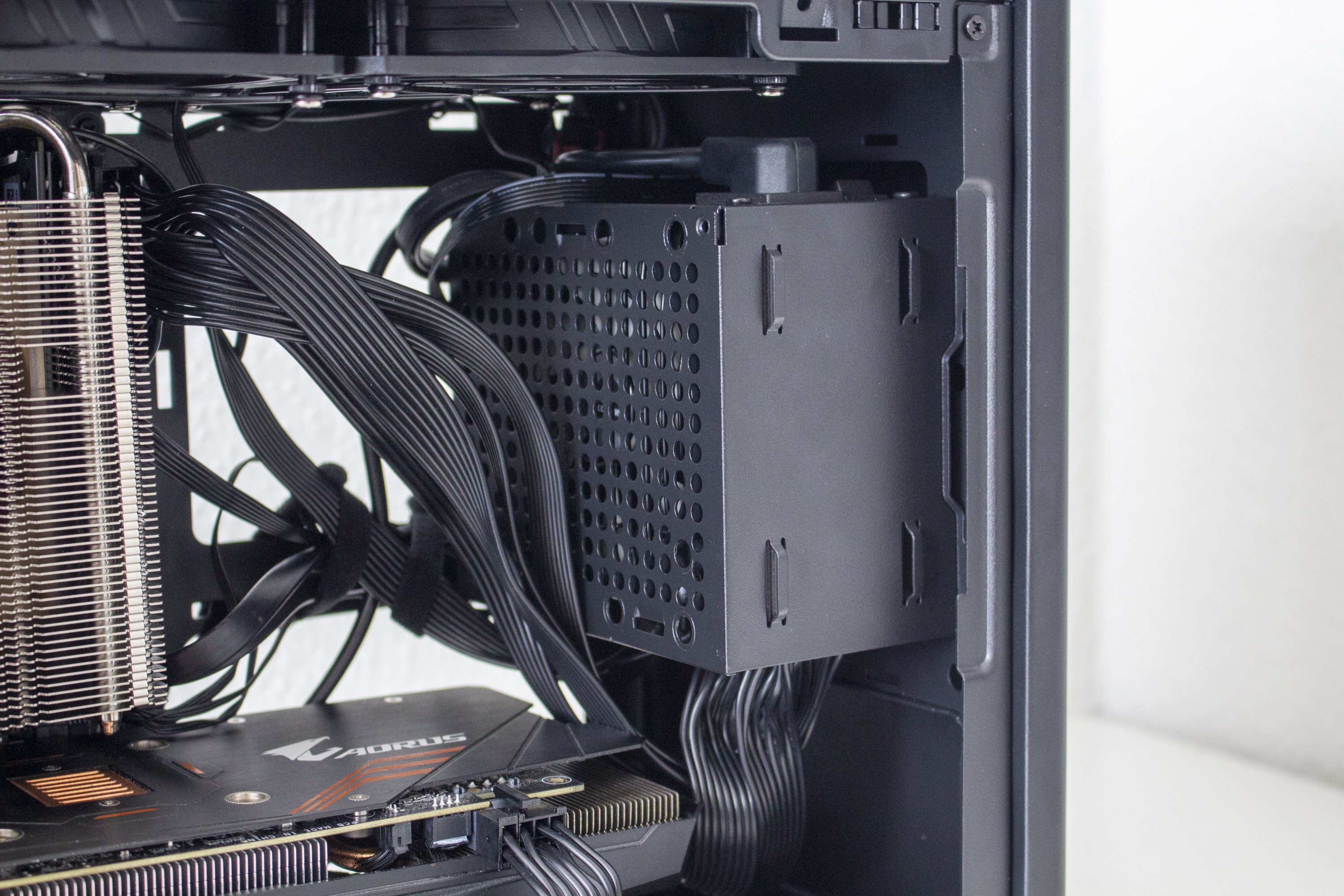 Im rechten Bereich des Innenraums hat Cooler Master einen perforierten Rahmen angebracht. Dieser dient zum Einem zur Befestigung des SFX-Netzteils und zum Anderen auch zur Montage eines 3,5″- oder eines 2,5″-Datenträgers. Möchte man ein DTX-Mainboard im Cooler Master NR200P verbauen, lässt sich der Netzteil-Rahmen auch um 90 Grad drehen und an der Wand hinter dem Frontpanel anbringen. Um den Kabelsalat möglichst gering zu halten, hat der Hersteller zahlreiche Laschen für Kabelbinder in den Rahmen gestanzt und diese teilweise sogar mit Klettstreifen versehen.