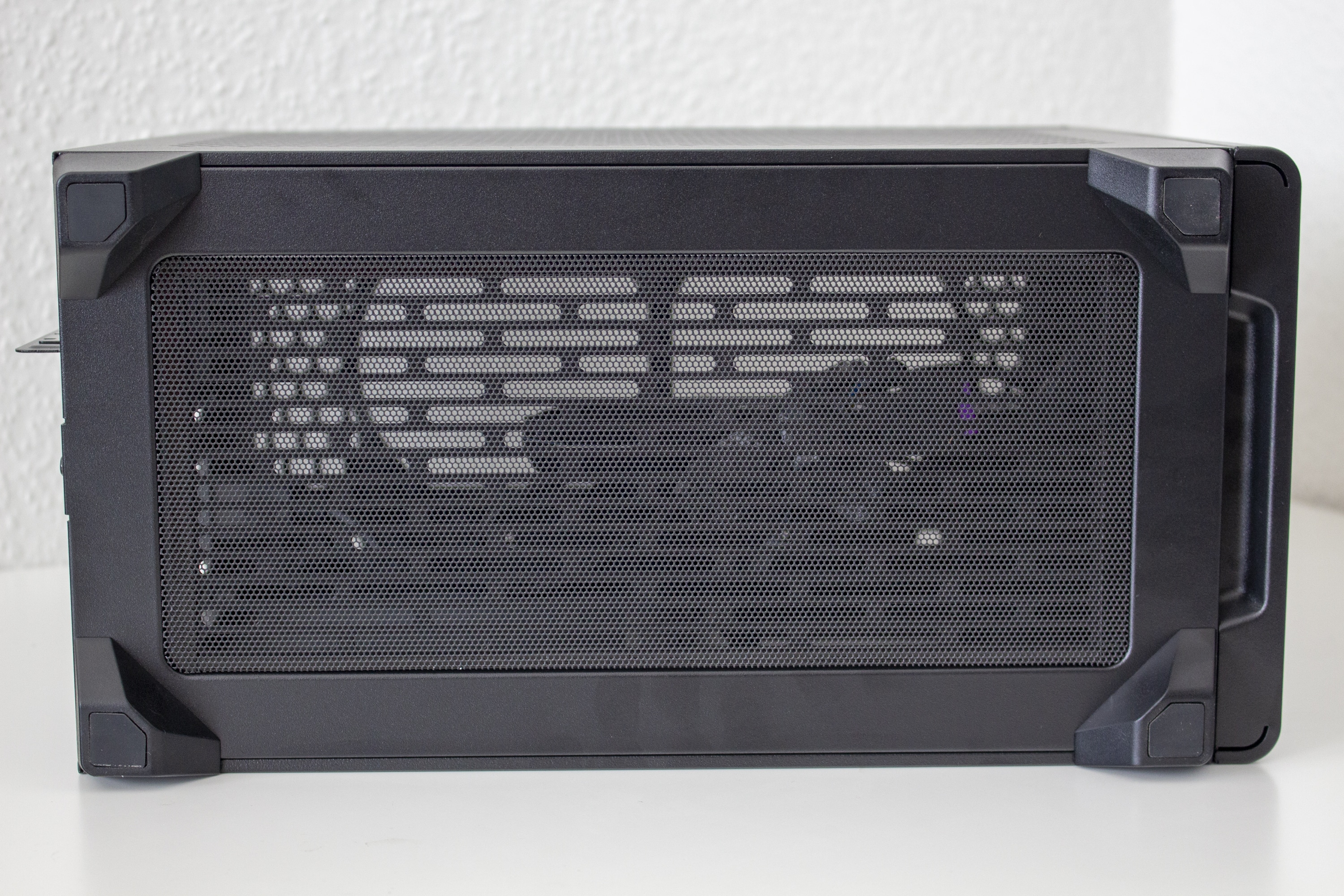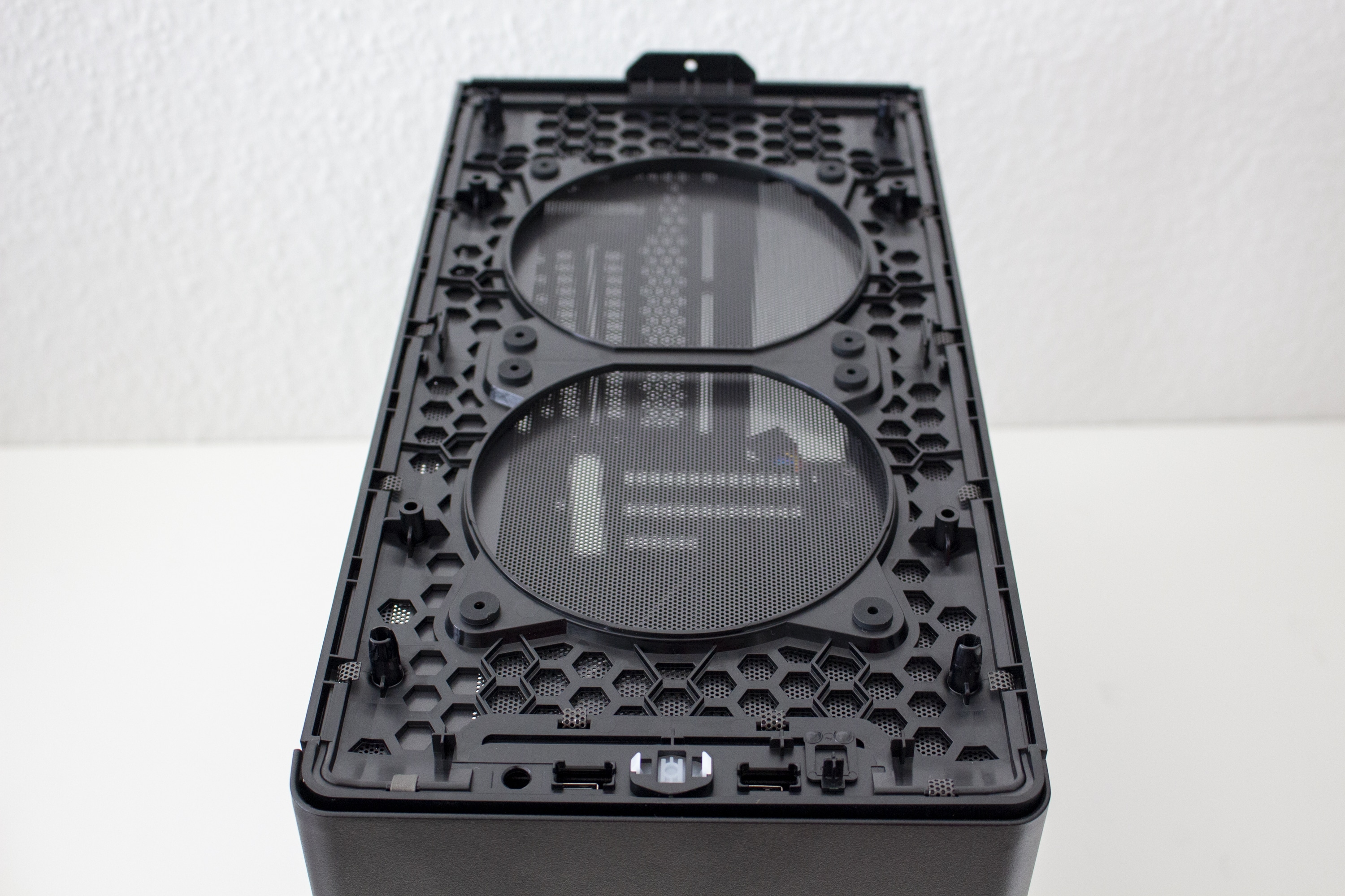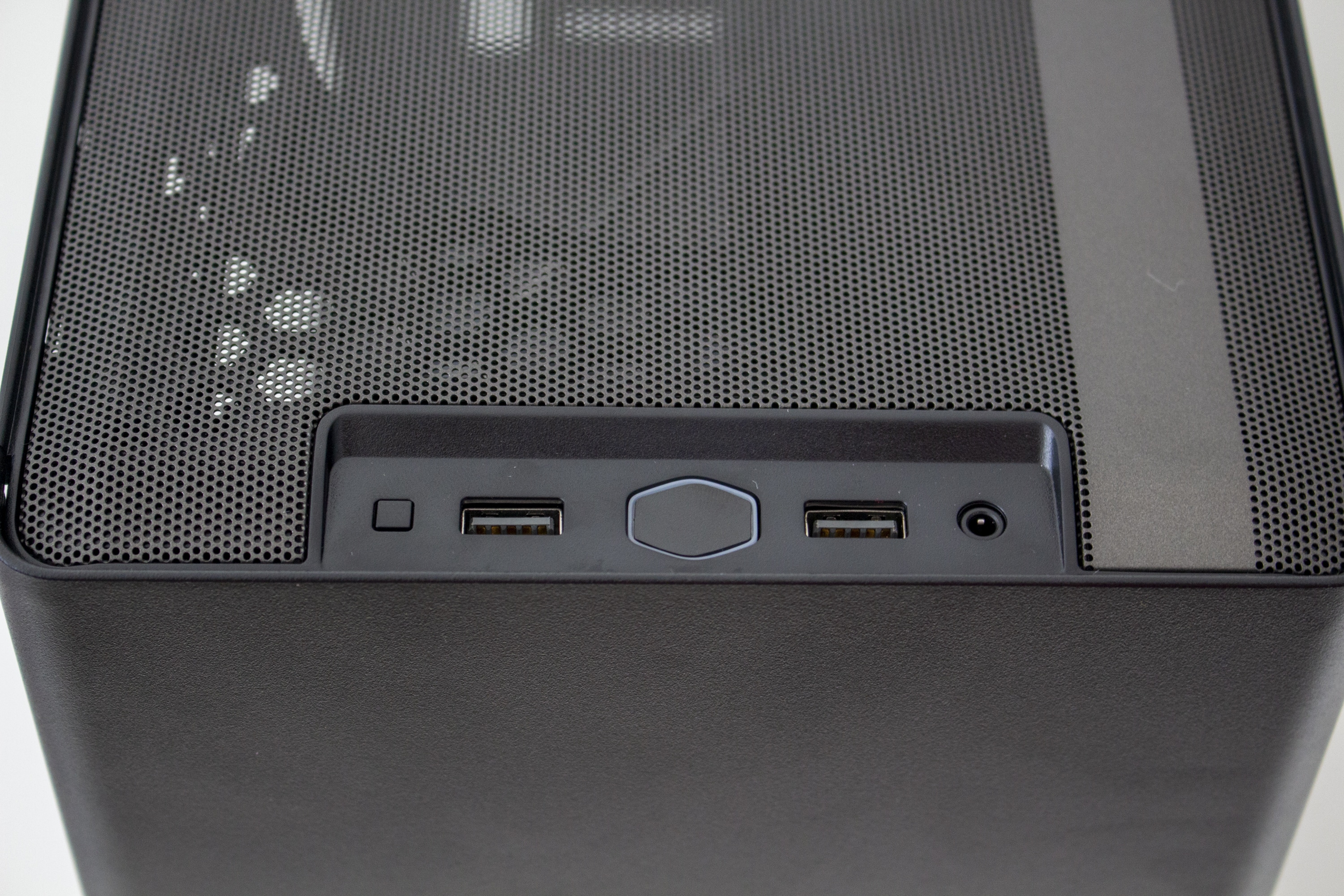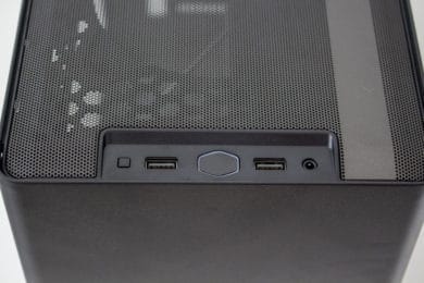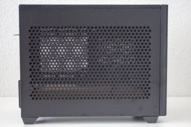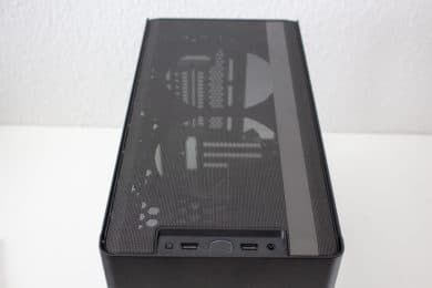 Der Deckelbereich des NR200P wird durch ein großes Mesh-Gitter und einen Rahmen aus Kunststoff dominiert. Dieses verfügt jedoch nicht über einen Staubfilter und lässt sich leider recht leicht eindrücken. Unterhalb des Gitters kann man insgesamt zwei Lüfter mit einer Rahmenbreite von 120 Millimetern einbauen. Bevor wir diesen Bereich abschließen, sei noch das I/O-Panel zu erwähnen. Dieses verfügt über zwei USB 3.0-Anschlüsse, einen Power- bzw. Reset-Button und einen Headset/Mikrofon-Combo-Port. USB Typ-C gibt es beim Cooler Master NR200P nicht.