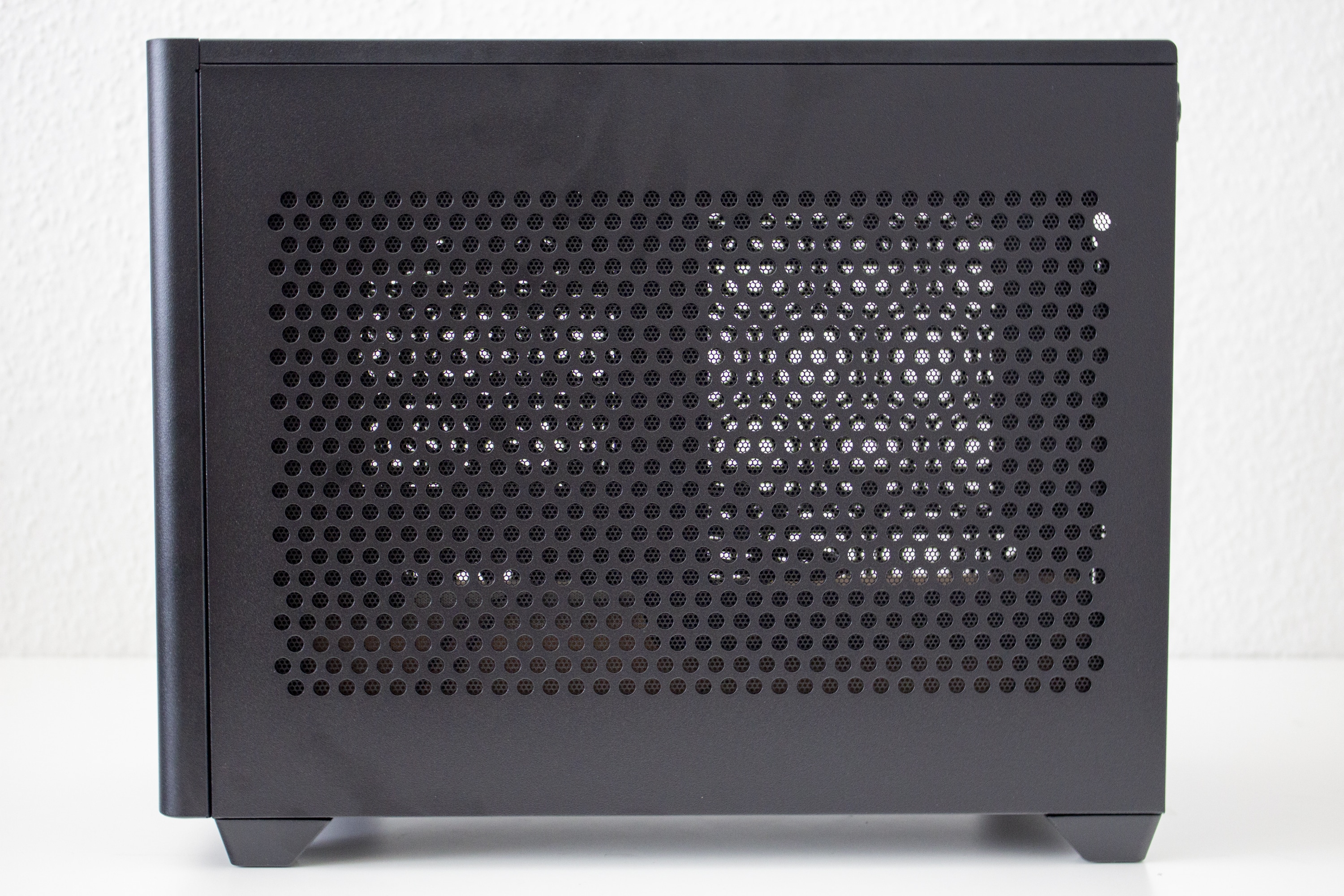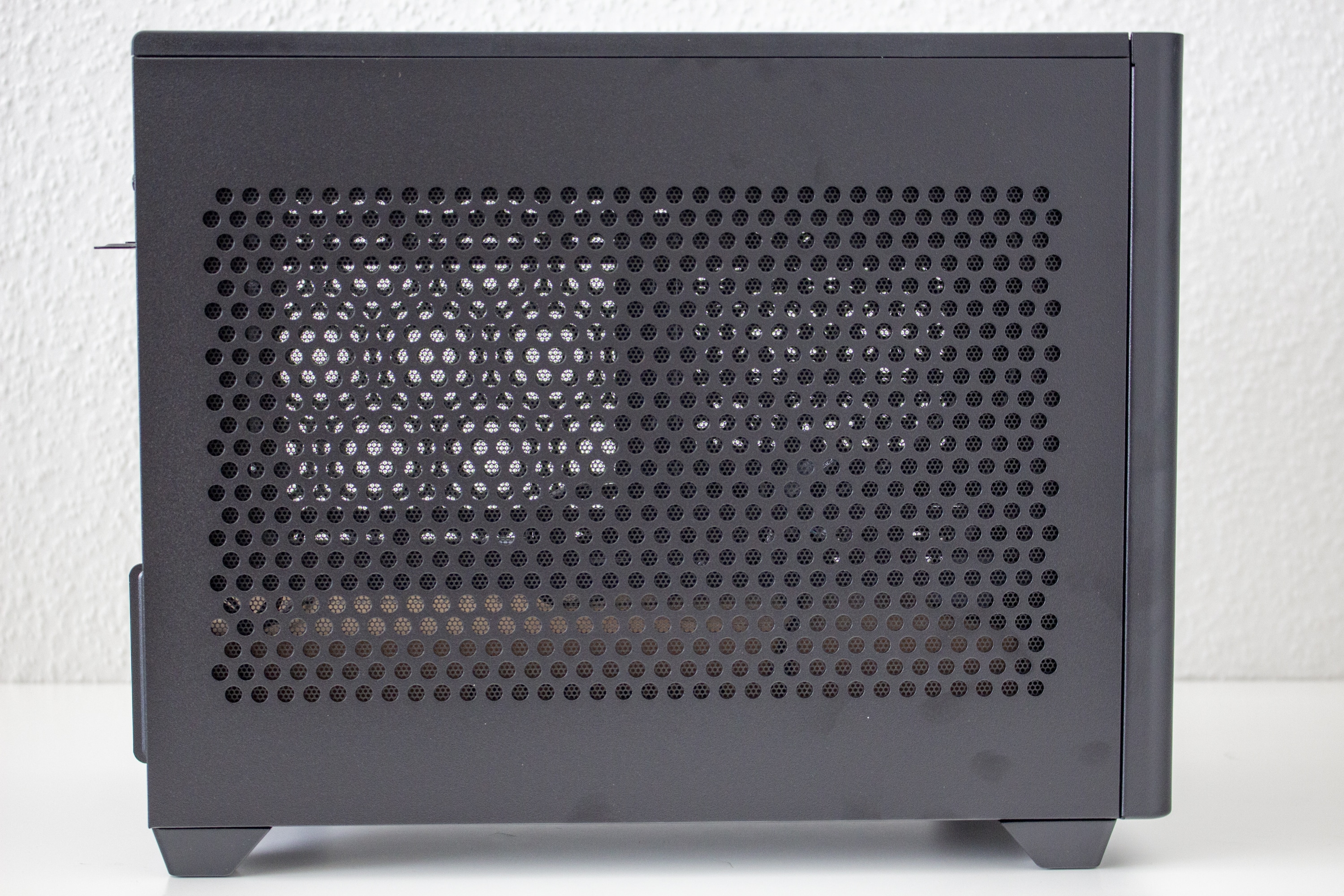 Ab Werk ist die Sidepanel-Konfiguration vollständig auf Airflow ausgelegt. Beide Seitenteile bestehen aus Stahl und wurden großflächig mit Lüftungsöffnungen versehen. Zum Schutz vor Staub wurden hinter diesen Öffnungen zusätzliche Staubfiltermatten angebracht. Die Montage der Sidepanels erfolgt gleichermaßen über Metall-Pins wie beim Frontpanel auch. Beim NR200P gehört zum Lieferumfang zusätzlich noch ein Seitenfenster aus gehärtetem Glas. Die Befestigung erfolgt identisch und kann, bei Bedarf, über eine Schraube auf der Innenseite noch verstärkt werden.