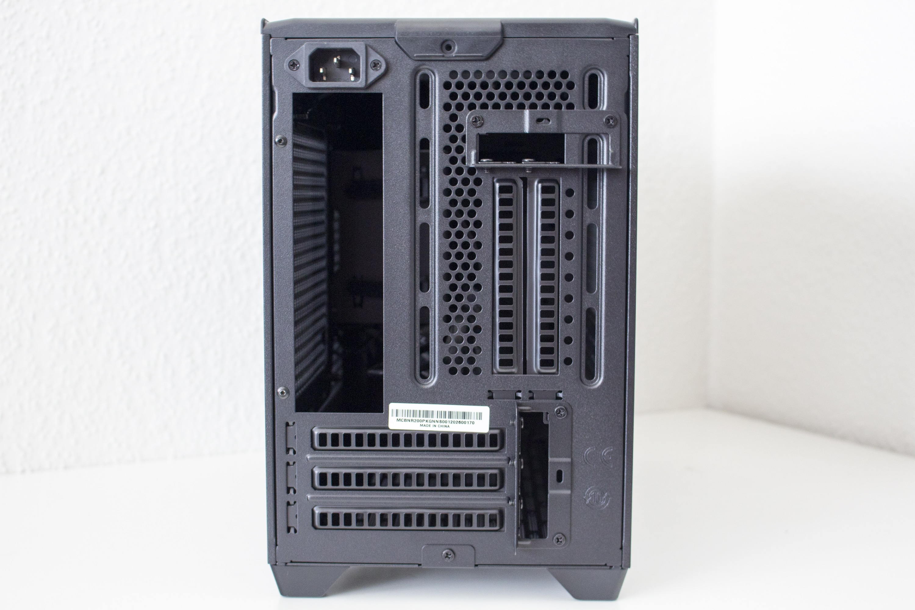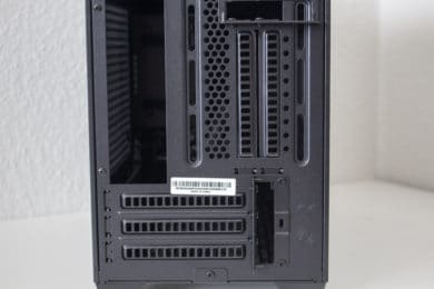 An der Rückseite kommt dieses ITX-Gehäuse mit gleich fünf wiederverwendbaren PCI-Slotblenden und einem Montagepunkt für einen 92-Millimeter-Lüfter daher. Das bedeutet man kann im NR200P die Grafikkarte entweder horizontal oder vertikal verbauen. Im oberen Bereich ist dann noch der Stecker für das Kaltgerätekabel zu finden.