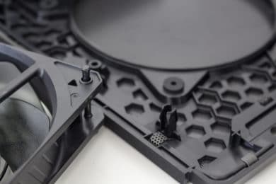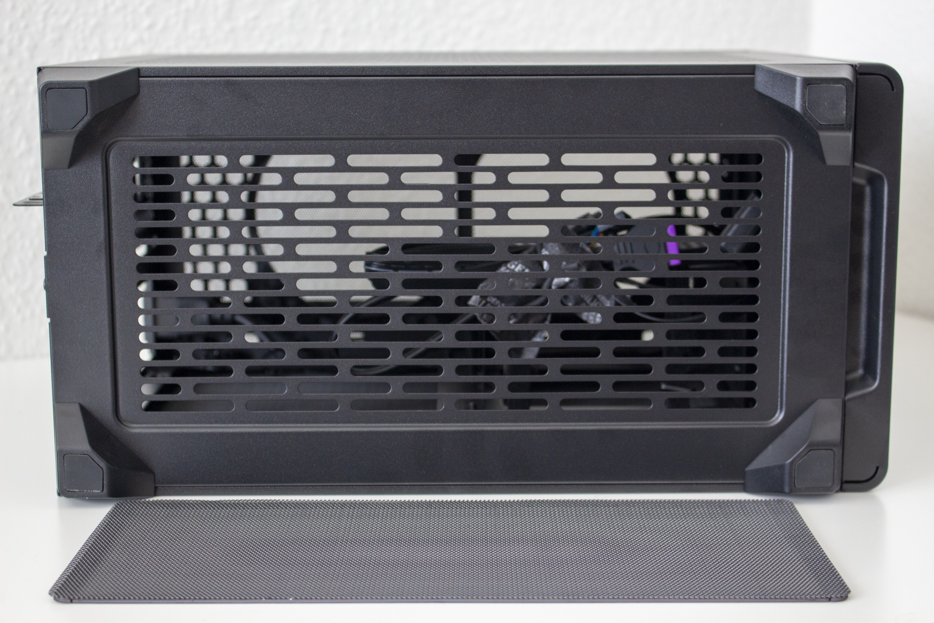 Die Unterseite des NR200P ist ebenfalls auf einen hohen Airflow ausgelegt. Die große Lüfteröffnung ermöglicht die Anbringung von zwei 120-Millimeter-Lüftern oder eines 240-Millimeter-Radiators. Um den Einbau zu erleichtern ist es zudem möglich, die Bodenpartie vom Korpus zu trennen. Für einen sicheren Stand des kleinen Gehäuses sorgen vier solide Kunststoff-Füße. Wem diese Füße optisch nicht gefallen, für den hat Cooler Master auf seiner Homepage weitere 3D-Drucker-Vorlagen zur Verfügung gestellt.