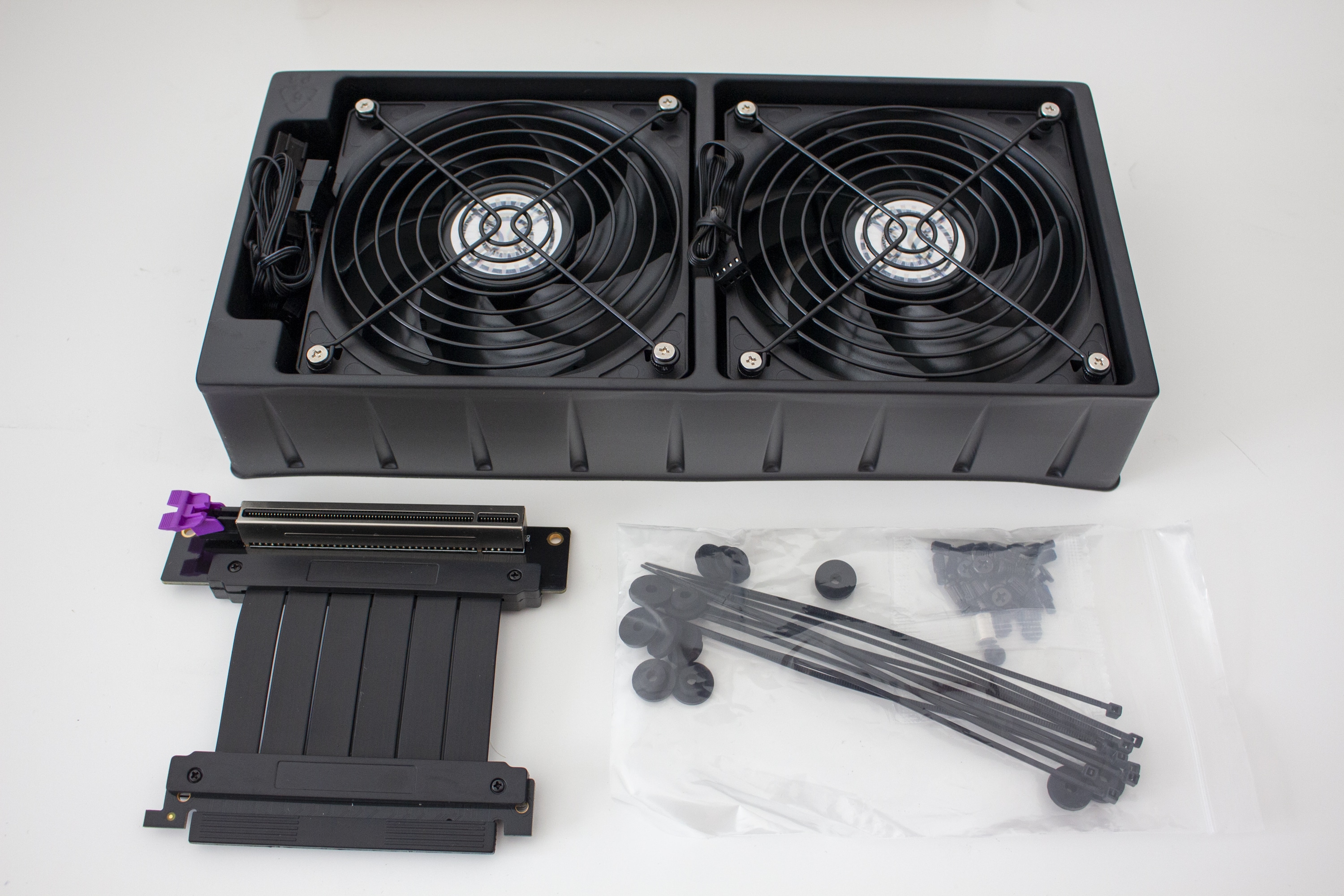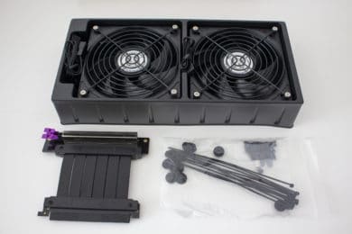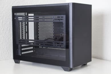 Der grundsätzliche Aufbau ähnelt auf dem ersten Blick dem eines normalen Tower-Gehäuses, nur halt etwas kleiner. Das ITX-Mainboard wird auf der linken Seite befestigt und im unteren Bereich findet sogar eine Triple-Slot-Grafikkarte Platz. Durch optionale Lüfter im Boden kann die Grafikkarte bei Bedarf direkt mit Frischluft versorgt werden. Verbaut man eine normale Dual-Slot-GPU passen hier aber lediglich 15 Millimeter tiefe Lüfter. Möchten man die Grafikkarte lieber vertikal verbauen und durch das Seitenfenster präsentieren, ist auch das möglich. Ein entsprechendes Riser-Kabel bzw. Befestigungspunkte sind vorhanden.