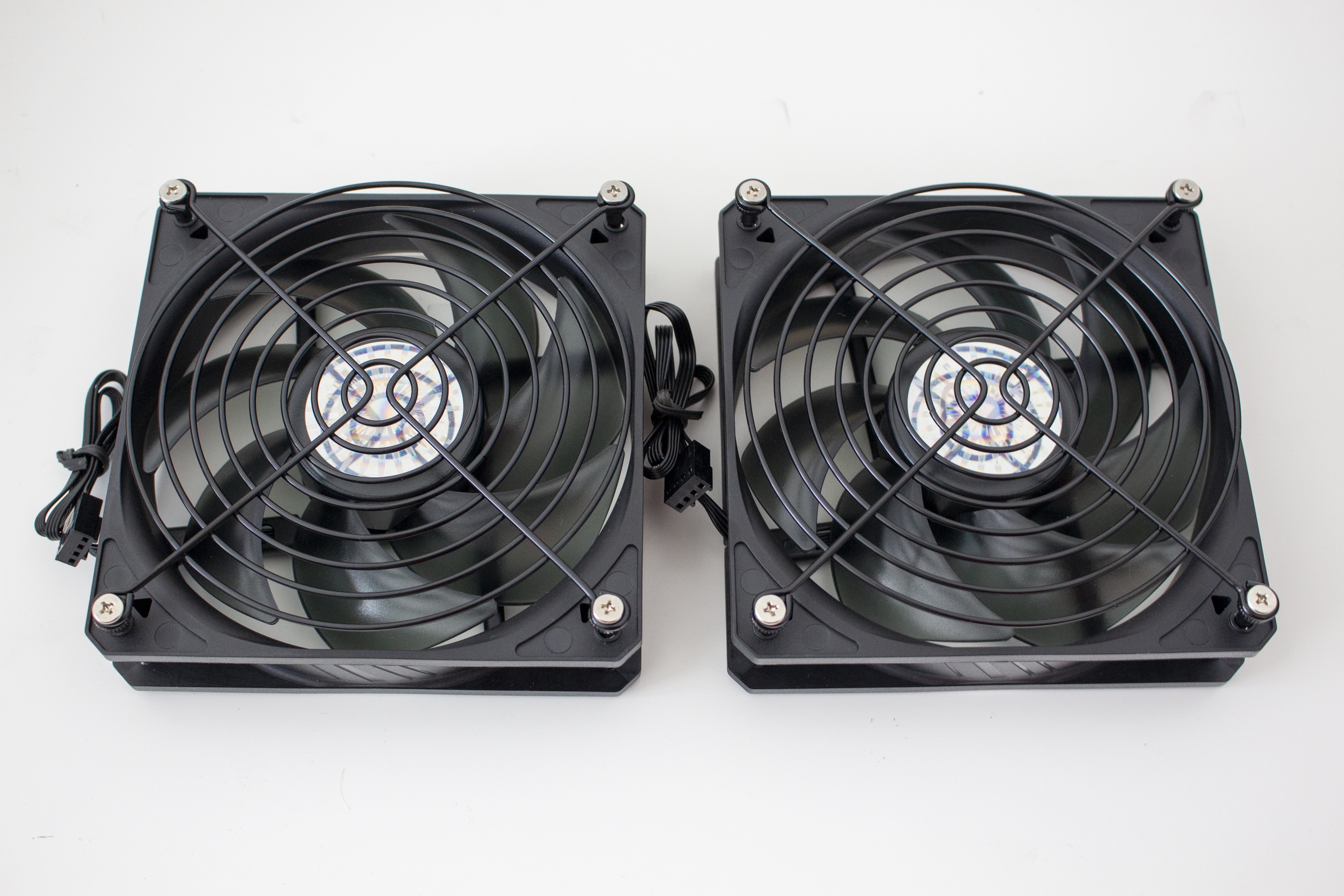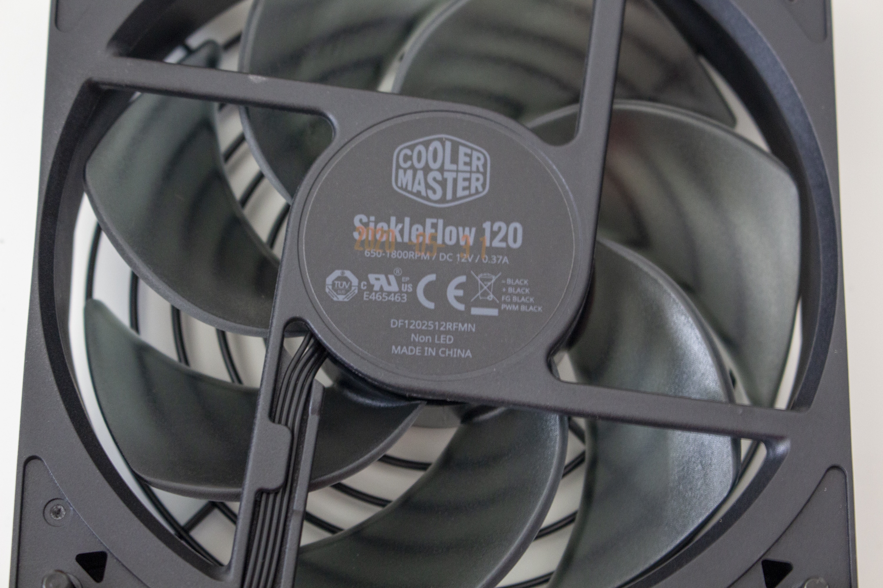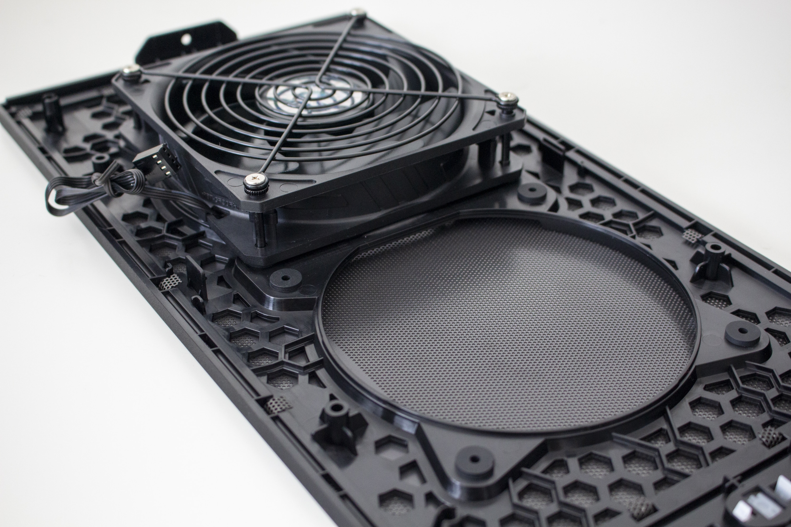 Ab Werk kommt das Cooler Master NR200P mit zwei Lüftern. Beide Lüfter sind vom Typ SickleFlow 120, sind ab Werk nicht vormontiert und haben einen Drehzahlbereich zwischen 650 und 1800 Umdrehungen pro Minute. Beide Ventilatoren sind mit einem Schutzgitter bzw. einem speziellen Montagerahmen ausgestattet. Zur Befestigung müssen die Metallstifte nur in die Gummiringe des Deckels gedrückt werden. Da die Gitterkonstruktion auf jeden handelsüblichen 120-Millimeter-Lüfter passt, wäre ein Austausch kein Problem. Die Verbindung mit dem Mainboard erfolgt über ein 4-Pin-PWM-Stecker. Eine Y-Weiche liegt dem Lieferumfang bei.
