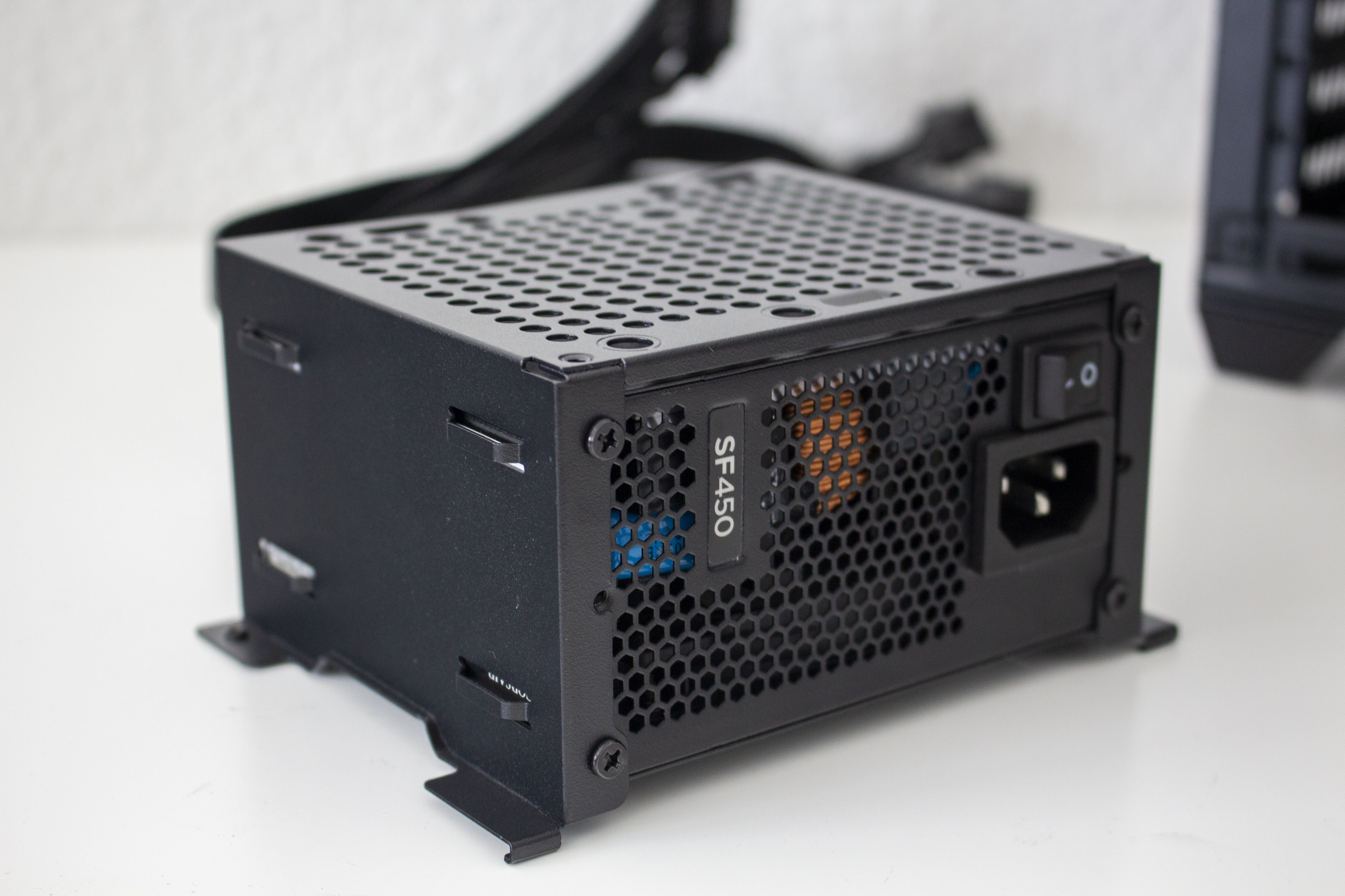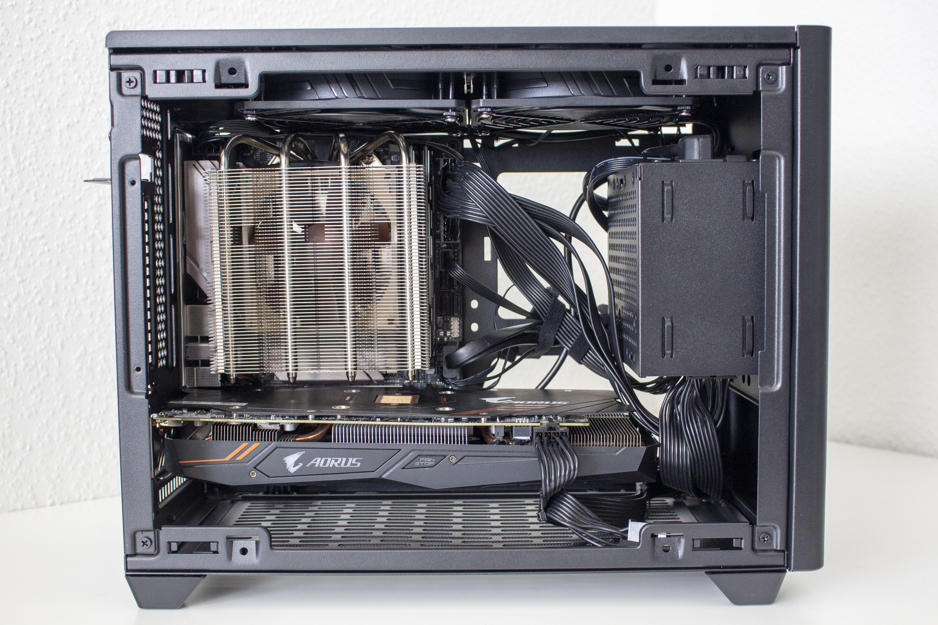 Nun kommen wir zum Systemeinbau. Als Hardware verwenden wir einen AMD Ryzen 5 1400 auf einem Gigabyte B450 I Aorus Pro WIFI mit Crucial Ballistix Sport LT grau 32 GB DDR4-3000. Der Ryzen wird von einem Noctua NH-L12 Ghost S1 Edition gekühlt und ist auf 3,8 GHz übertaktet. Für die Bildausgabe ist eine GTX 1060 6GB von Gigabte AORUS zuständig. Die Stromversorgung erledigt das voll-modulare Corsair SF Series SF450* mit einem Effizienzgrad von 80 Plus Gold.
