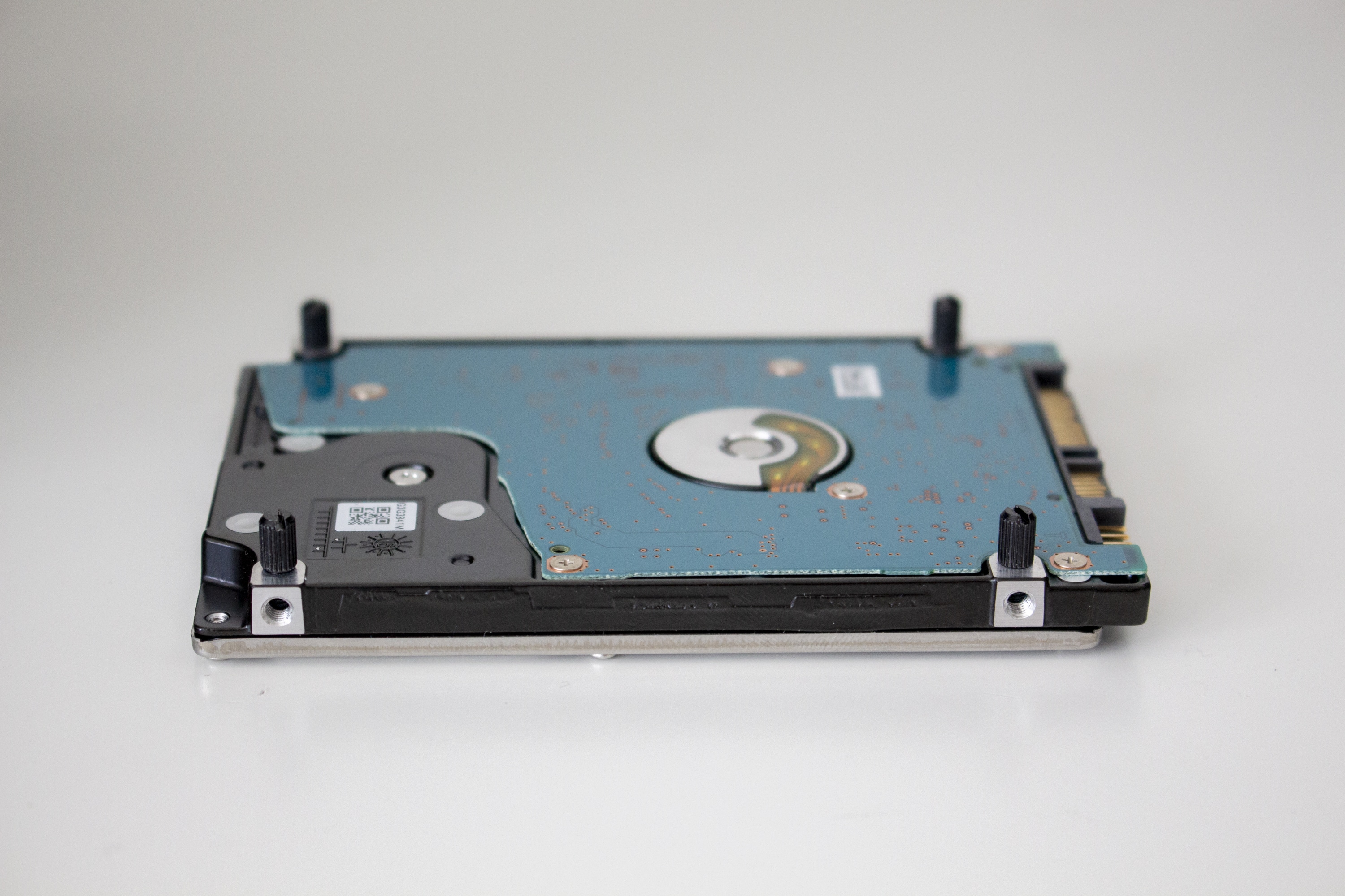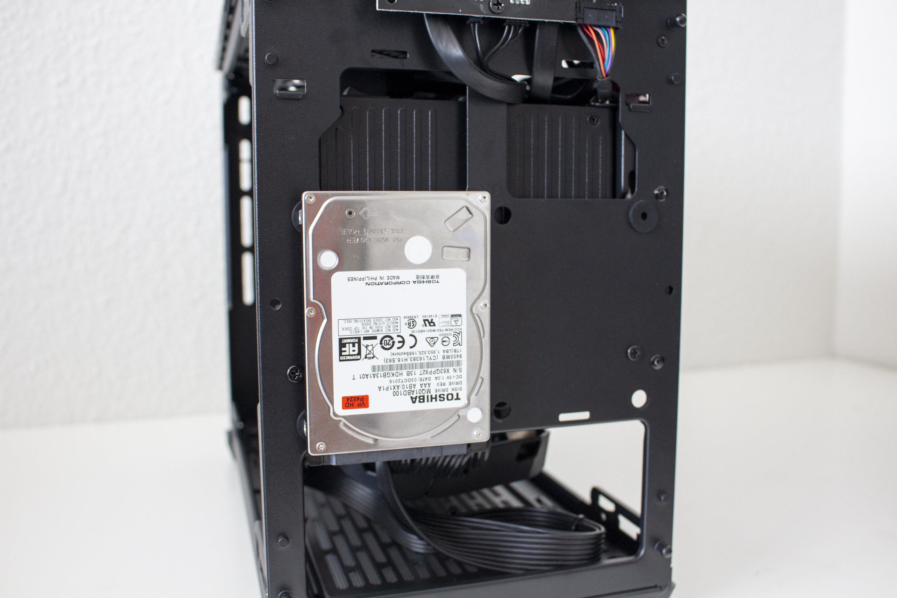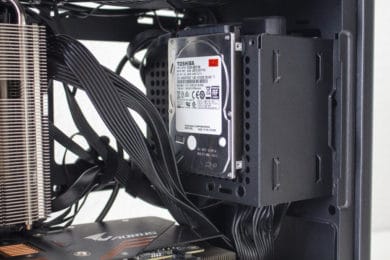 Um den Inneneindruck zum NR200P abzuschließen, möchte wir noch ein paar Worte über die Möglichkeit zur Unterbringung von Datenträgern verlieren. Gleichzeitig passen in dieses Gehäuse zwei 2,5″- und zwei 3,5″- oder eine 3,5″- und drei 2,5″-Festplatten bzw. SSDs. Neben dem bereits erwähnten HDD-Käfig gibt es hinter dem Frontpanel zwei Plätze und am Radiatorrahmen einen Platz. Die Befestigung erfolgt dabei über Gummischeiben zur Entkopplung und dünnen Pins an der Unterseite des Datenträger. Die Anbringung erfolgt schnell, ist aber nicht als Transportsicher zu bezeichnen.