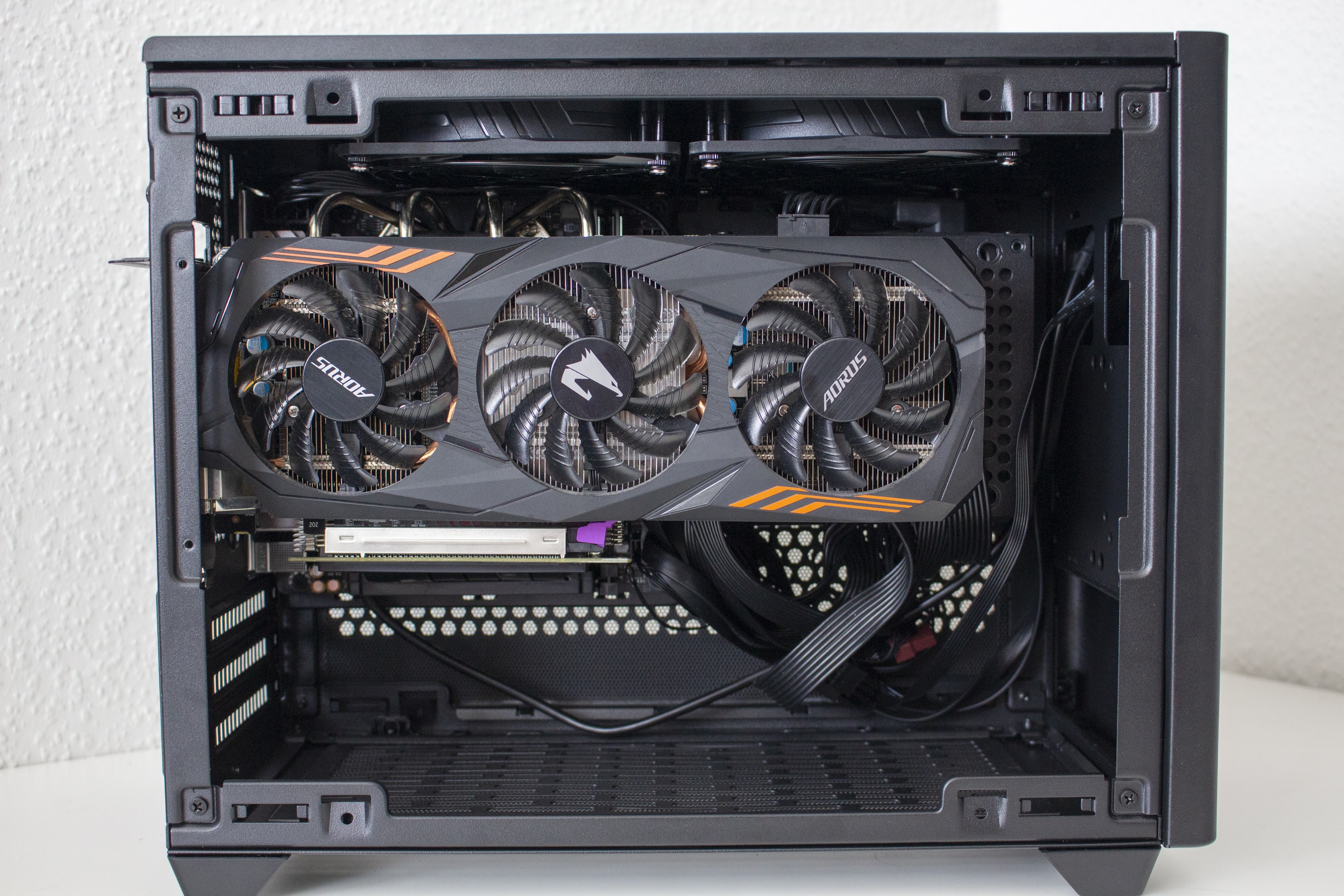 Hat man vorher nur in einem normalen Midi-Tower gebaut, ist der Hardware-Einbau in einem ITX-Gehäuse schon eine kleine Herausforderung. Mit einem Volumen von 18 Litern gehört das Cooler Master NR200 zwar nicht du den kleinsten Gehäusen, viel Raum zum Arbeiten gibt es aber dennoch nicht. Mit ein klein wenig Geschick waren die Teile aber relativ schnell eingebaut und verkabelt. Etwas Schwierigkeiten gab es jedoch zwischen der 280 Millimeter langen Grafikkarte und dem Netzteil. Da die Kabel im Weg waren, mussten wir das Netzteil an der Gehäusefront montieren und selbst dann war es recht knapp. Auf den Bildern ist außerdem auch das System mit vertikal montierter Grafikkarte zu sehen. Das dazu benötigte Riser-Kabel gehört zum Lieferumfang.