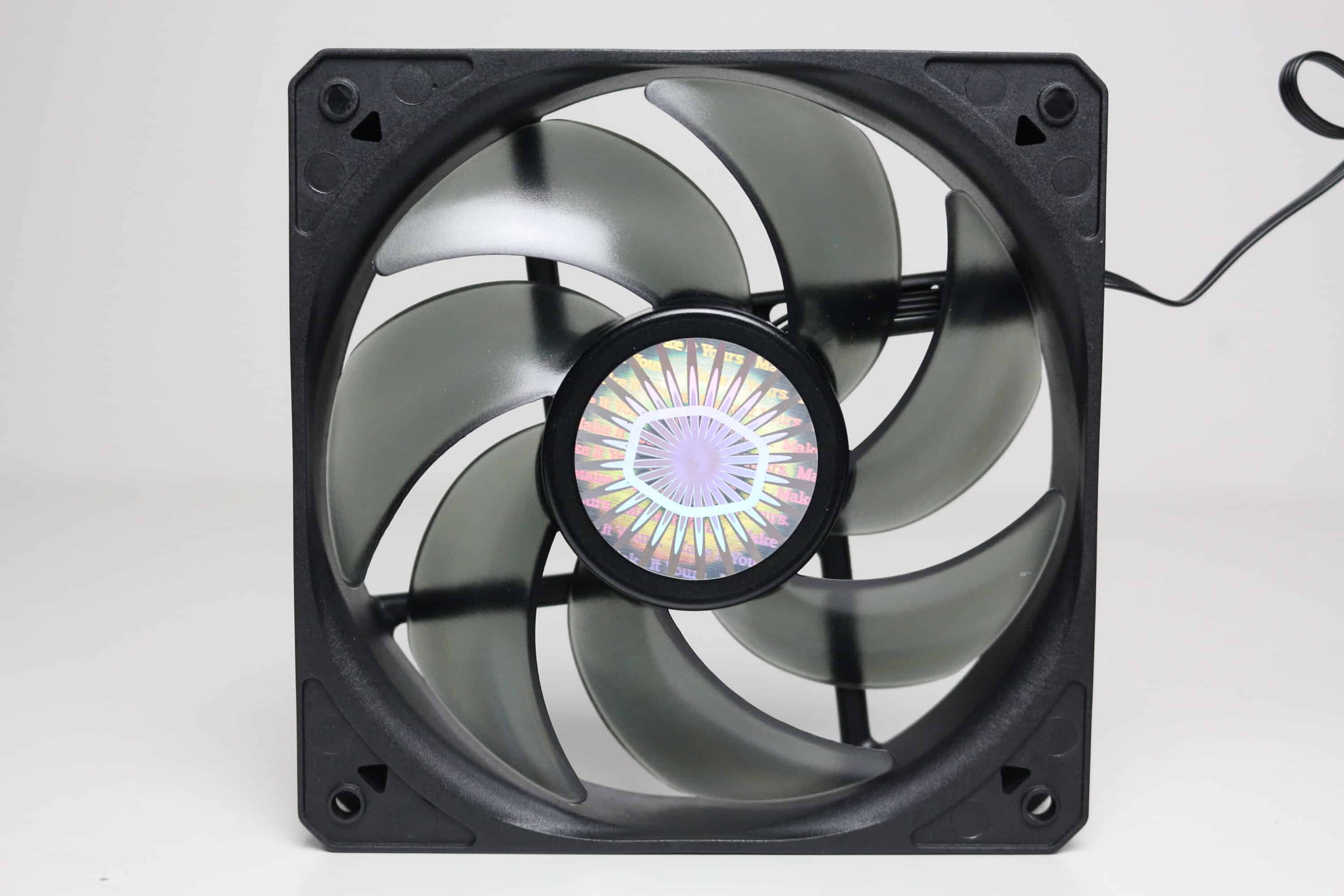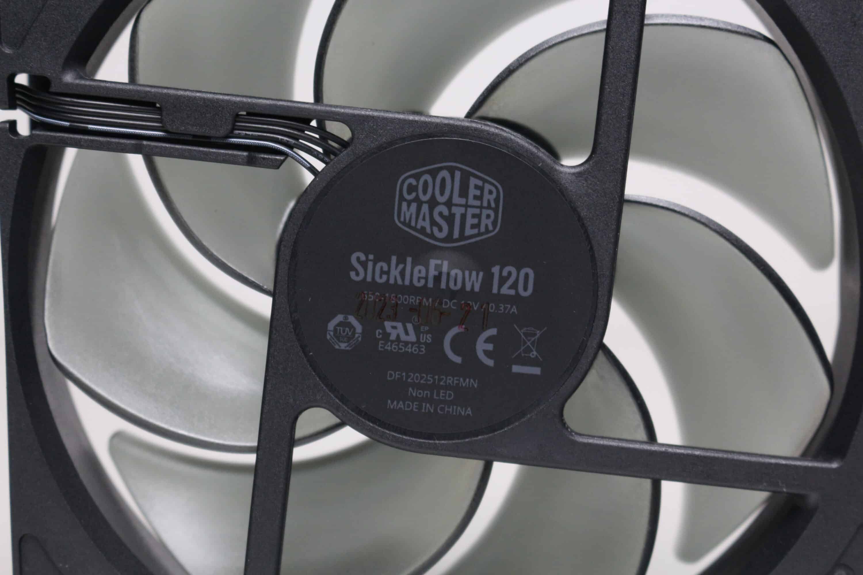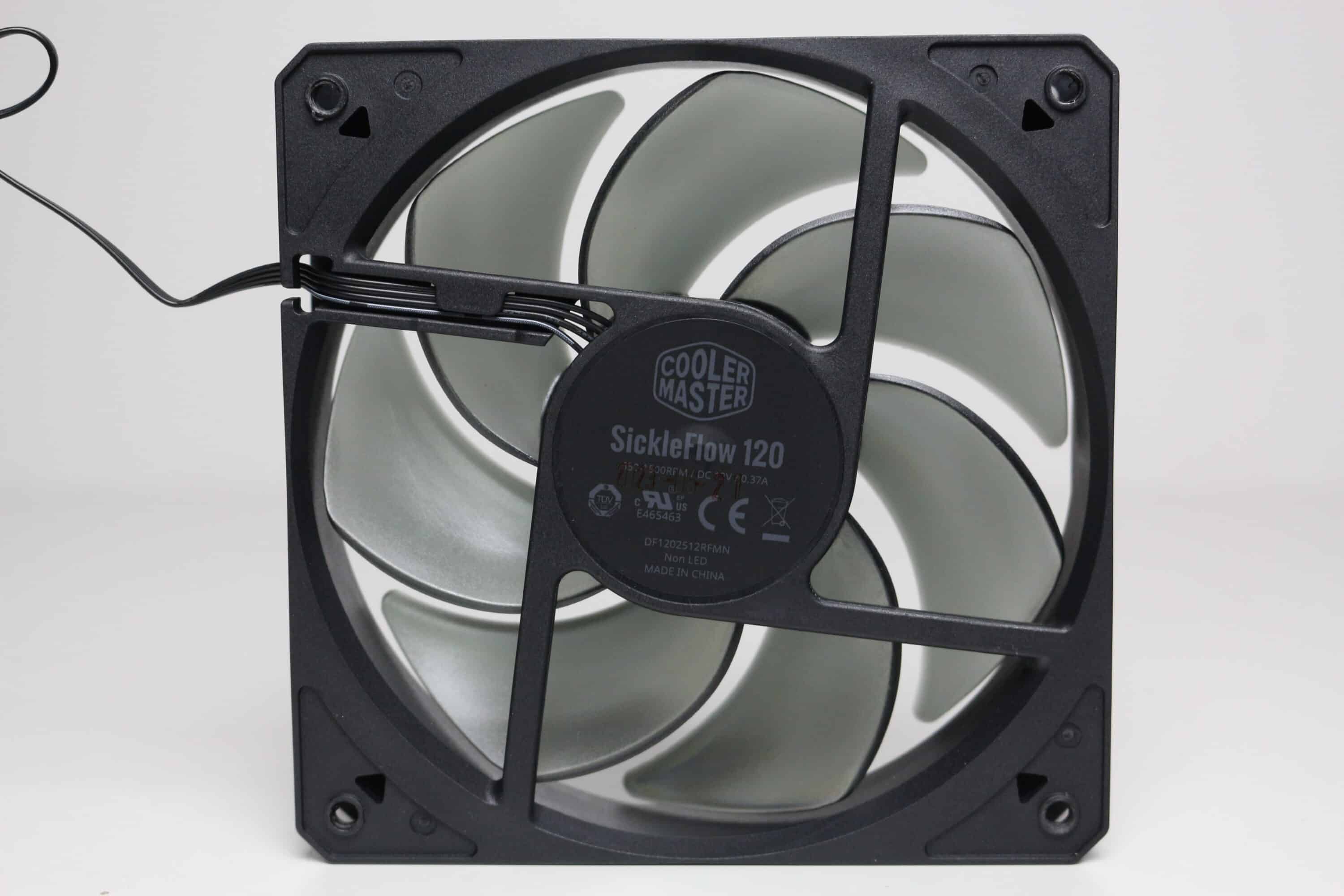 Ab Werk kommt das Cooler Master Qube 500 Flatpack mit einem vorinstallierten 120-mm-Lüfter vom Typ SickleFlow 120. Der Lüfter besteht aus einem schwarzen Kunststoffrahmen sowie einem grau-transparenten Rotor mit sieben Lüfterblättern. Der Anschluss am Mainboard erfolgt über einen 4-Pin-PWM-Stecker und der Drehzahlbereich des Lüfters liegt zwischen 650 und 1600 Umdrehungen pro Minute.