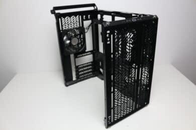 Cooler Master spendiert dem Qube 500 an der linken Seite zudem einen scharnier-gelagerten Montagerahmen, der einfach aufgeklappt werden kann und mit einer Schraube befestigt wird. Der Rahmen bietet Platz für bis zu zwei 120-mm- oder 140-mm-Lüfter bzw. entsprechende Radiatoren. Optional kann dort auch eine Festplatte angebracht werden. Insgesamt ist die Effektivität des Rahmens aber eher fraglich, da das Qube 500 auf der linken Seite ein geschlossenes Seitenfenster besitzt, welches dann mit dem rechten, belüfteten Seitenteil die Plätze tauschen müsste. Aus unserer Sicht hätte man den Rahmen auch weglassen können oder ein zweites Seitenteil aus Stahl beilegen müssen.