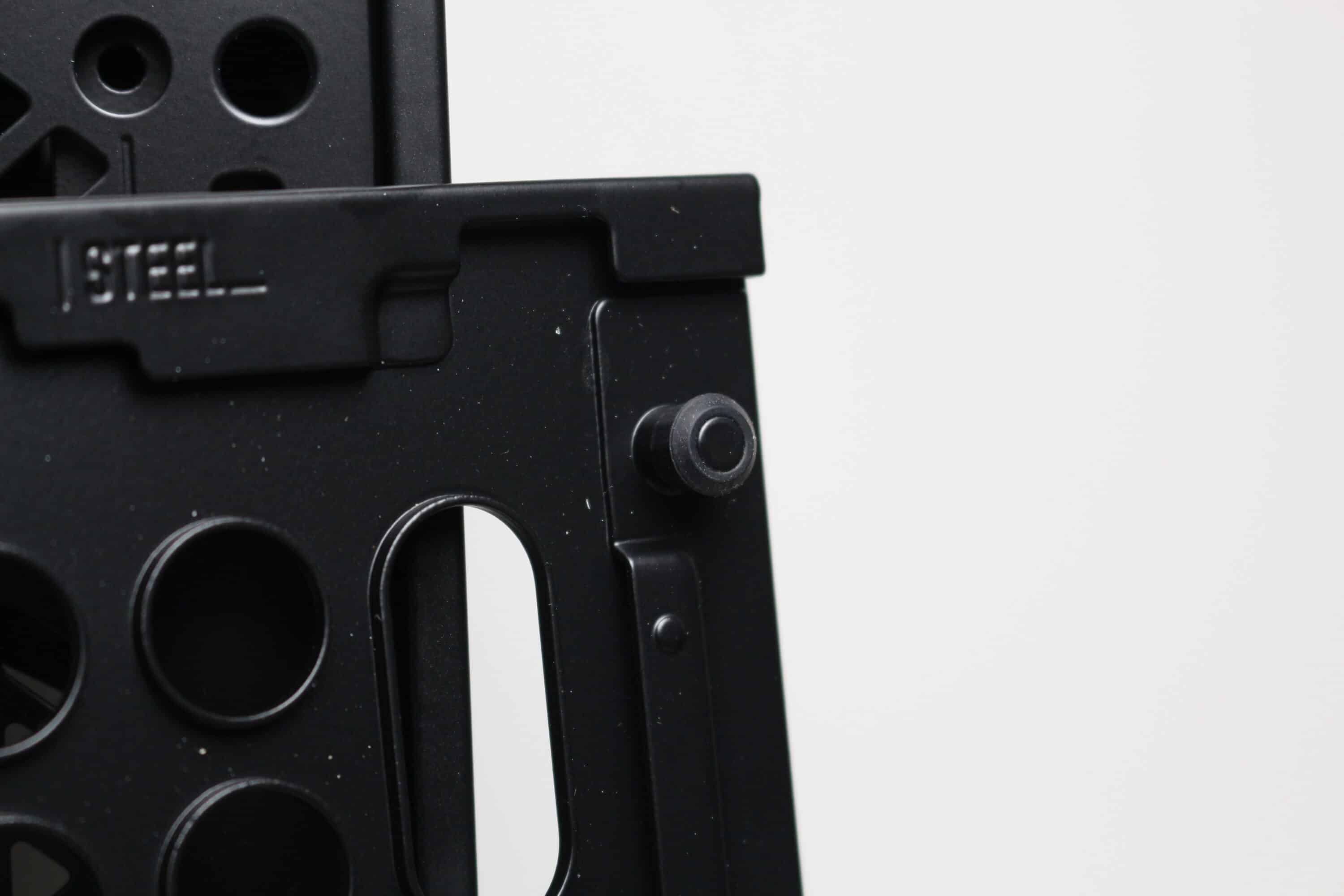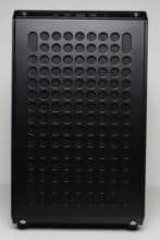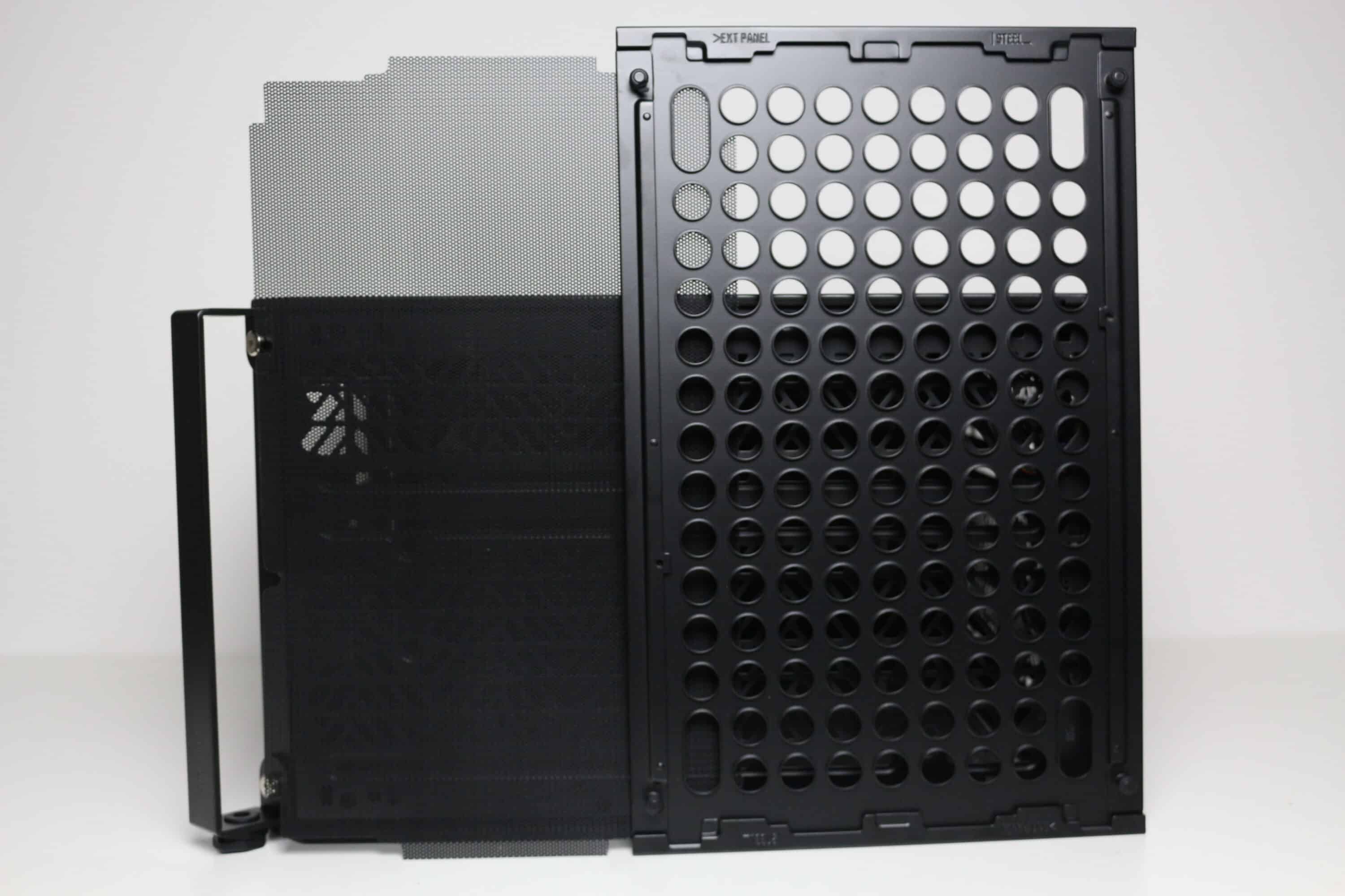 Das linke Seitenteil besteht beim Qube 500 Flatpack aus einem circa vier Millimeter starken Tempered Glass, welches leicht getönt wurde. Damit zur Anbringung auf Schrauben verzichtet werden kann, klebt Cooler Master an die Innenseite der Scheibe zwei Stahlelemente mit Stahlpins. Diese ermöglichen in Verbindung mit den Kunststoffklammern am Korpus eine werkzeuglose Montage. Eine identische Technik kommt für das rechte Seitenteil aus Stahl zum Einsatz. Optisch wurde für dieses aber die Gestaltung der Front- bzw. Deckelplatte übernommen. Auch hier verbaut Cooler Master hinter den runden Belüftungsöffnungen einen modularen Meshfilter. Beide Seitenteile verfügen am hinteren Ende zudem über eine kleine Griffmulde, um die Demontage zu erleichtern.