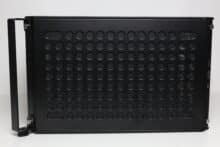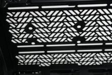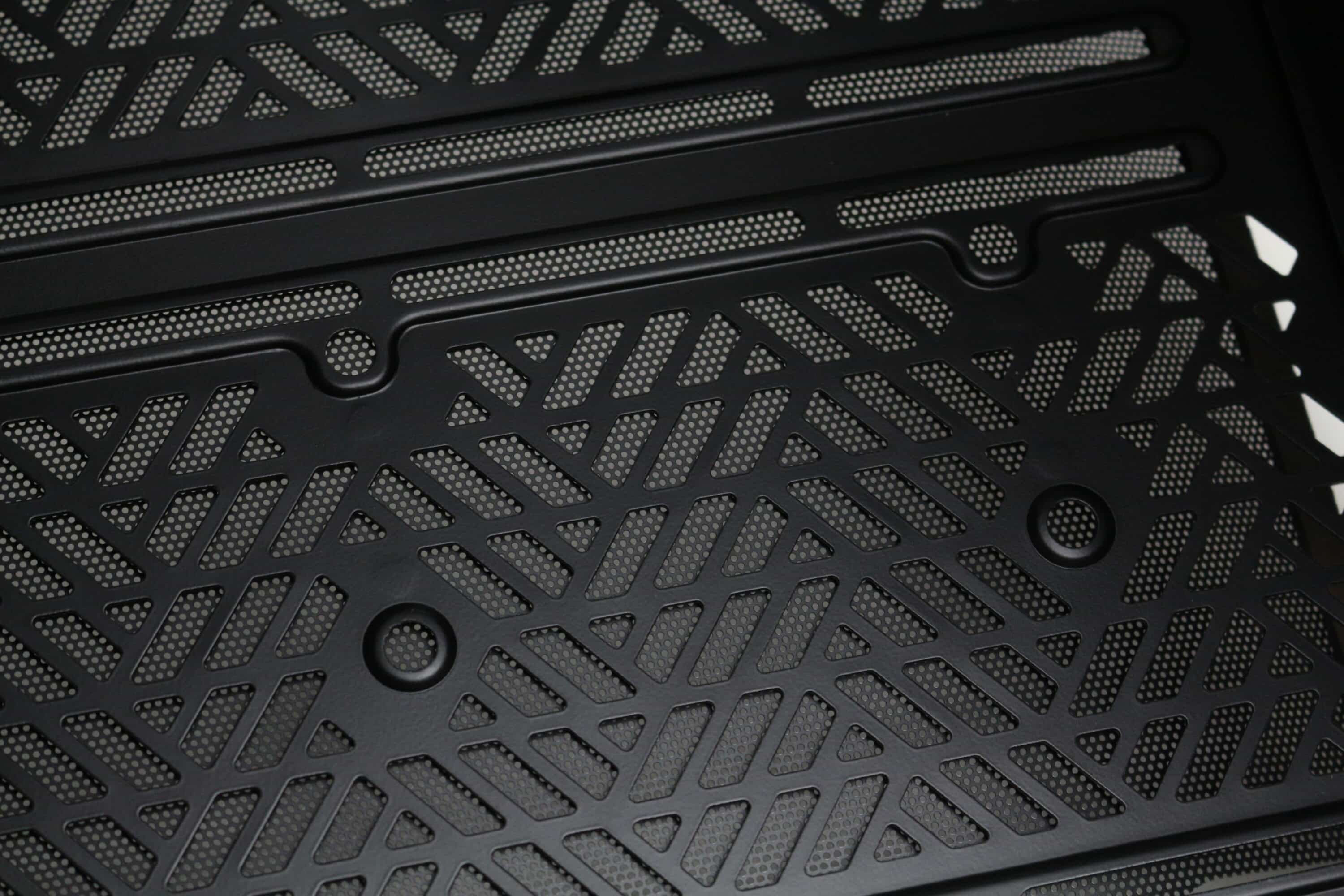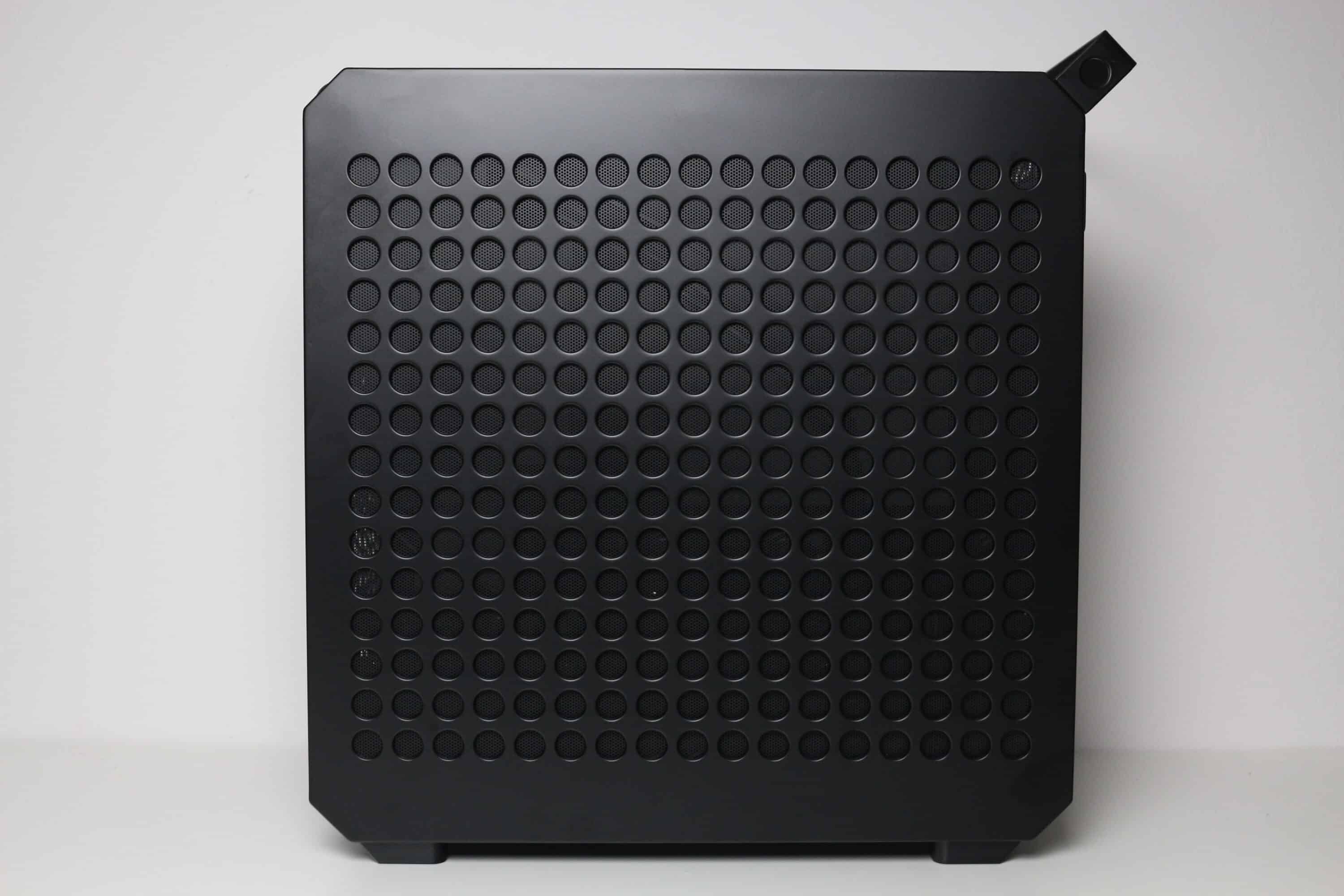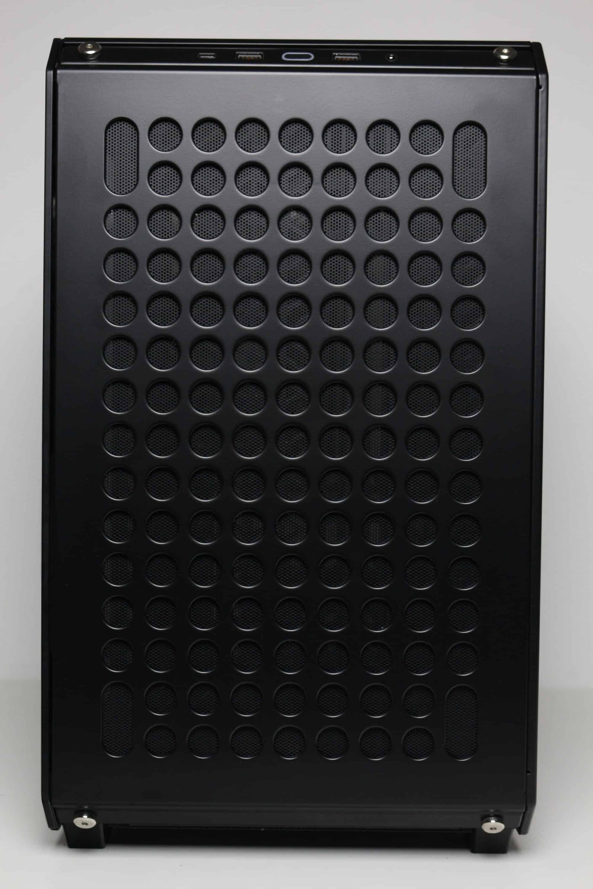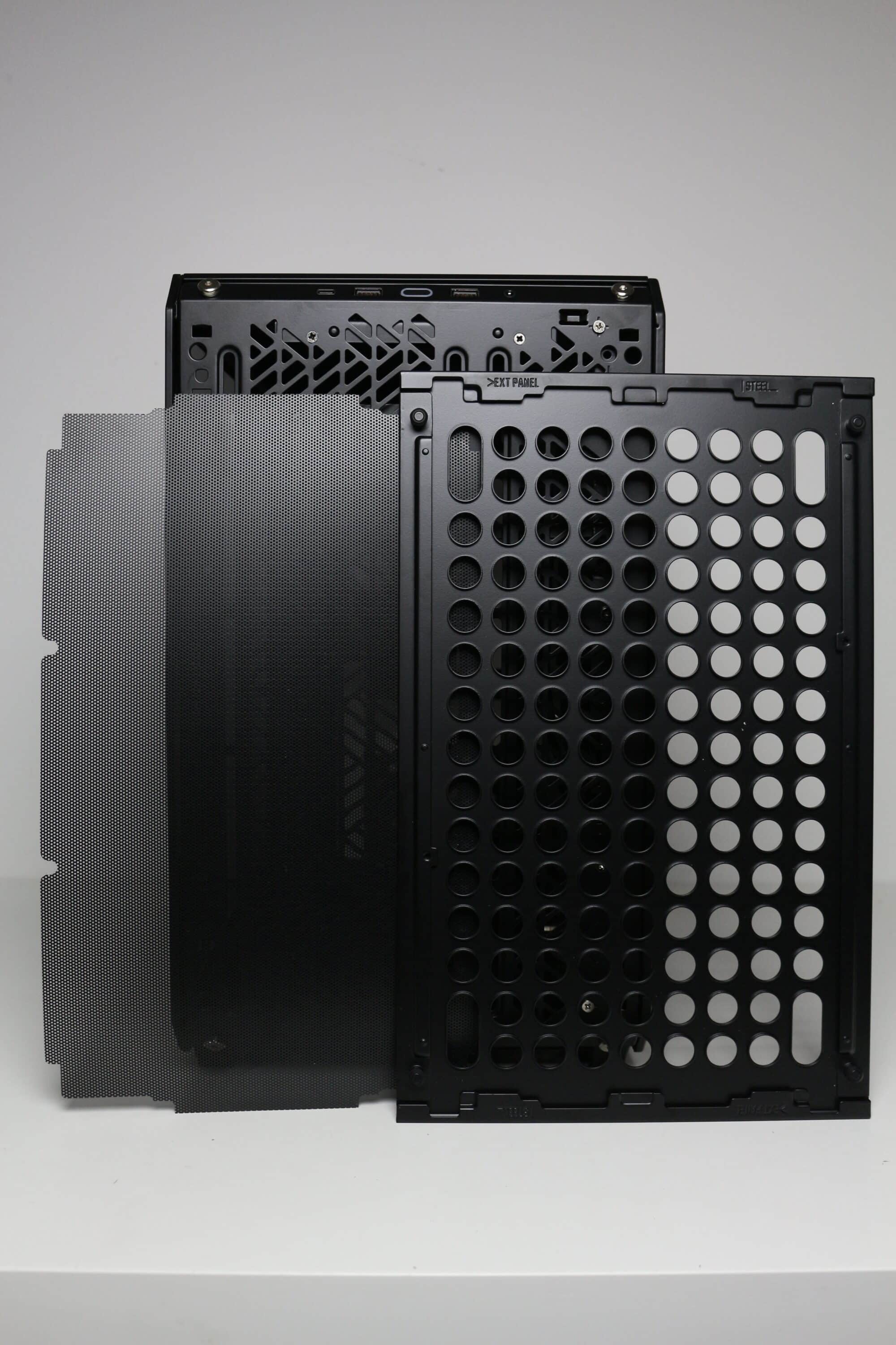 Optisch gestaltet Cooler Master das Qube 500 auffälliger als das Q500L. Der Hauptgrund dafür ist eine solide Stahlblatte in der Front, welche zur Verbesserung des Airflows mit großen, rundlichen Öffnungen versehen wurde. An der Rückseite des Stahlpanels hat Cooler Master zudem eine Staubfiltermatte aus einem feinen Mesh platziert, die zur Reinigung entfernt werden kann. Die Anbringung der Stahlplatte am Korpus erfolgt über vier Stifte mit Gummiringen, mit Hilfe derer das Panel einfach an den Korpus gedrückt werden kann. Entfernt man die Frontplatte, lassen sich großzügig dimensionierte Belüftungsöffnungen sowie Montageschienen für bis zu zwei 120- oder 140-mm-Lüfter bzw. entsprechende Radiatoren erkennen.