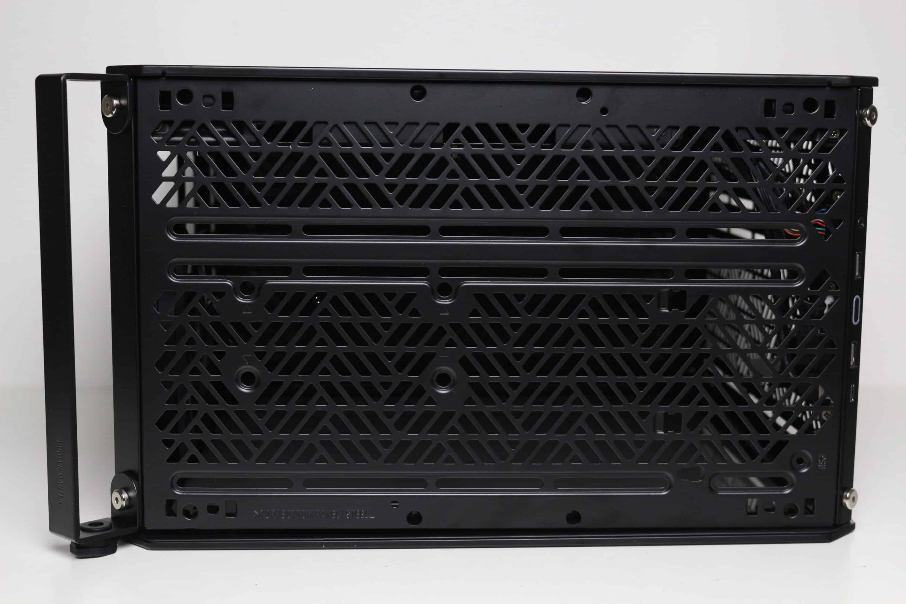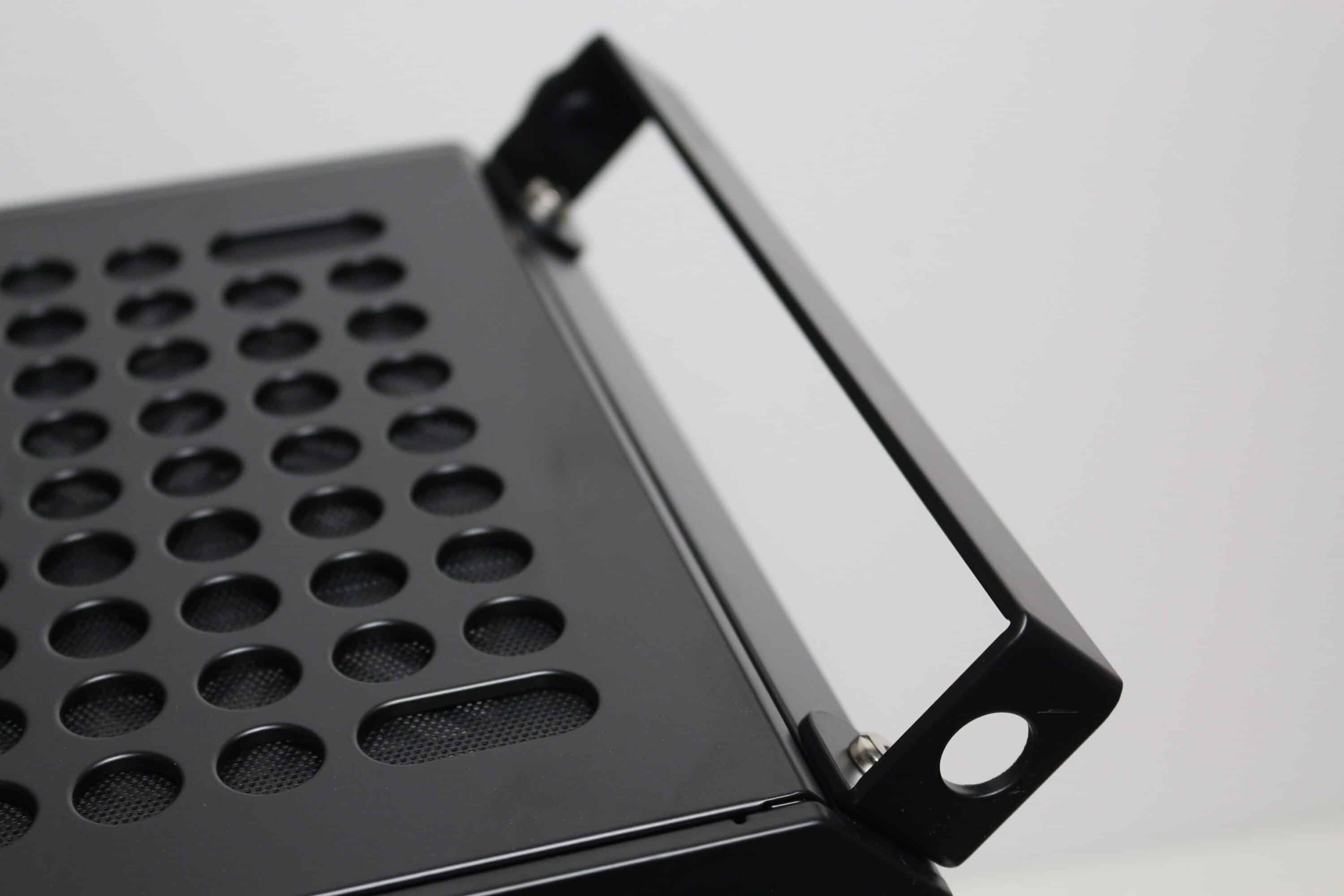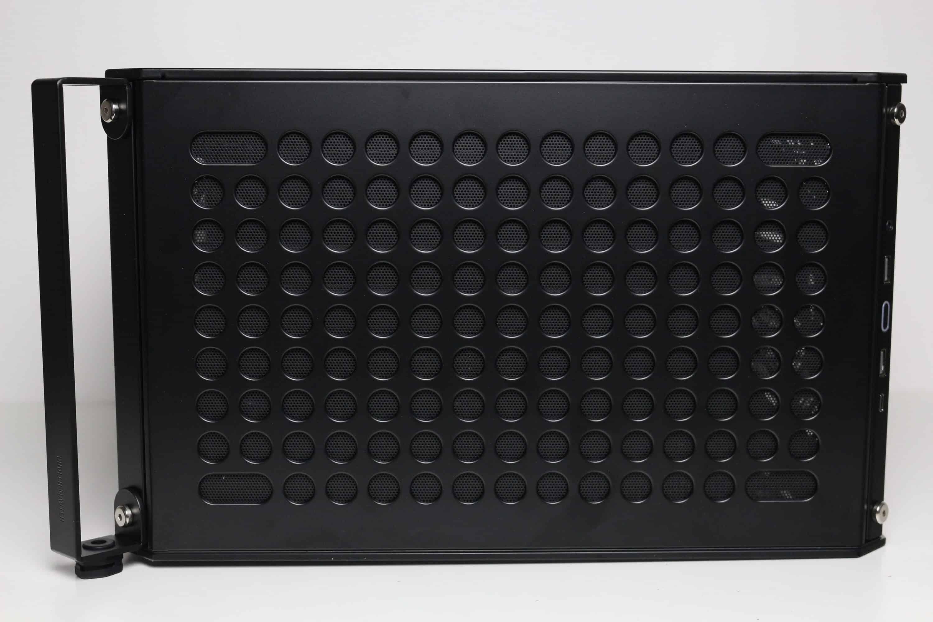 Der Deckelbereich ist mehr oder weniger eine exakte Kopie des Frontpanels. Auch hier platziert Cooler Master vor dem Korpus eine Stahlplatte mit runden Belüftungsöffnungen sowie eine modulare Staubfiltermatte dahinter. Die Verbindung zwischen Panel und Korpus erfolgt dort ebenfalls über gummierte Stifte. Die Gestaltung der Belüftungsöffnungen sowie die Montageschienen für bis zu zwei 120-mm- oder 140-mm-Lüfter wurden im Deckel unverändert übernommen. Am hinteren Ende finden wir jedoch einen vormontierten Tragegriff aus Stahl, der mit Hilfe von zwei Schrauben alternativ auch an einer der drei anderen Ecken befestigt werden kann.