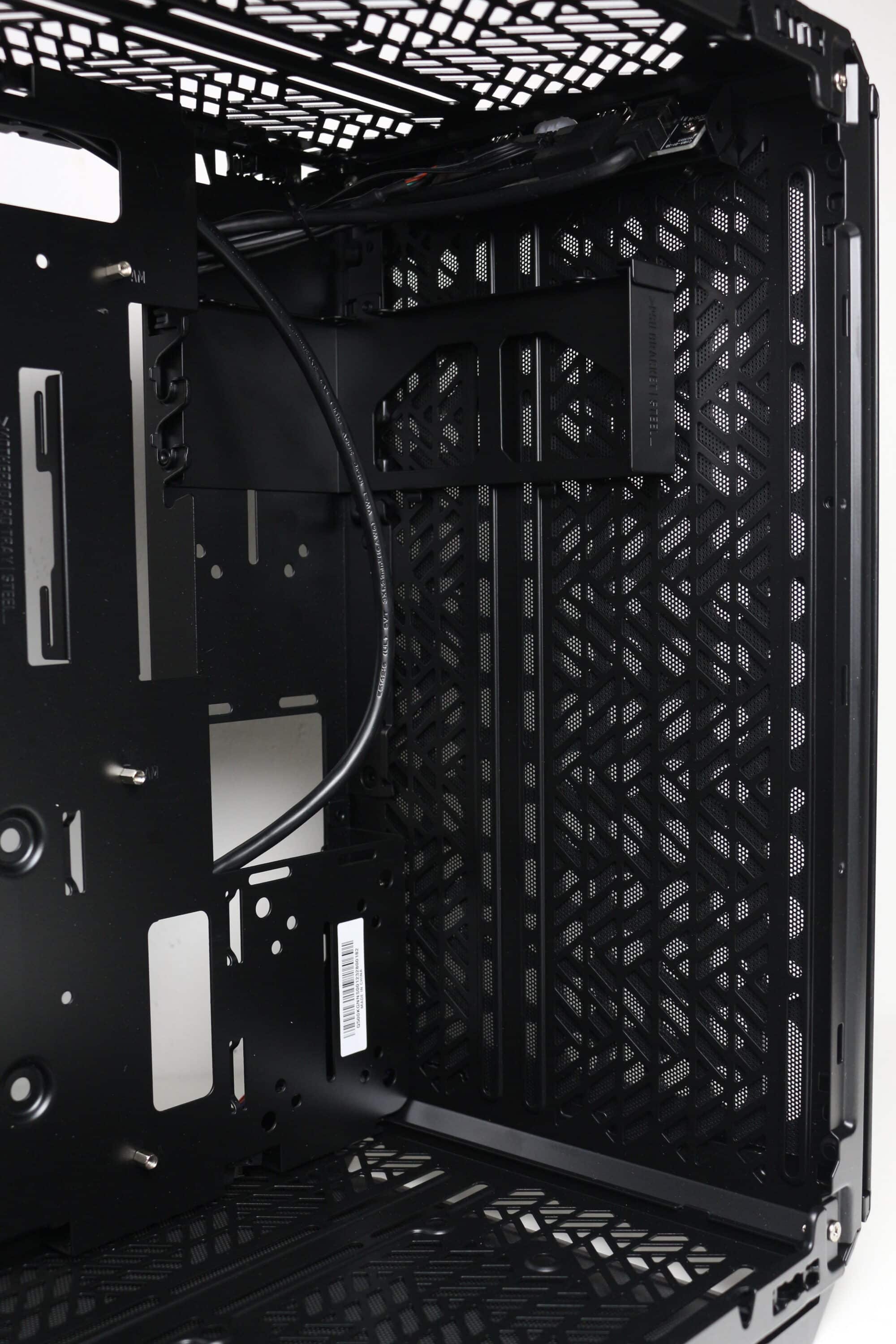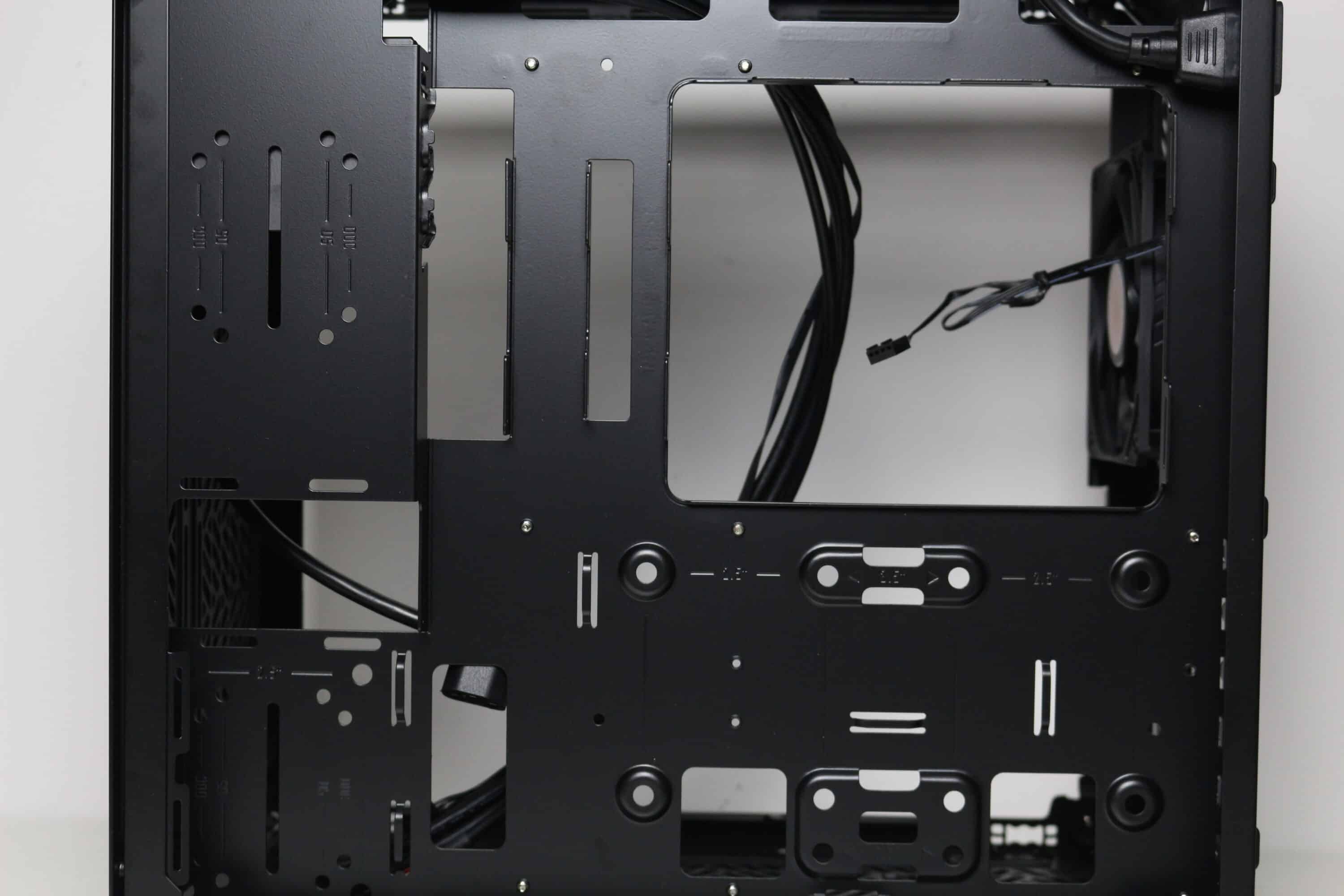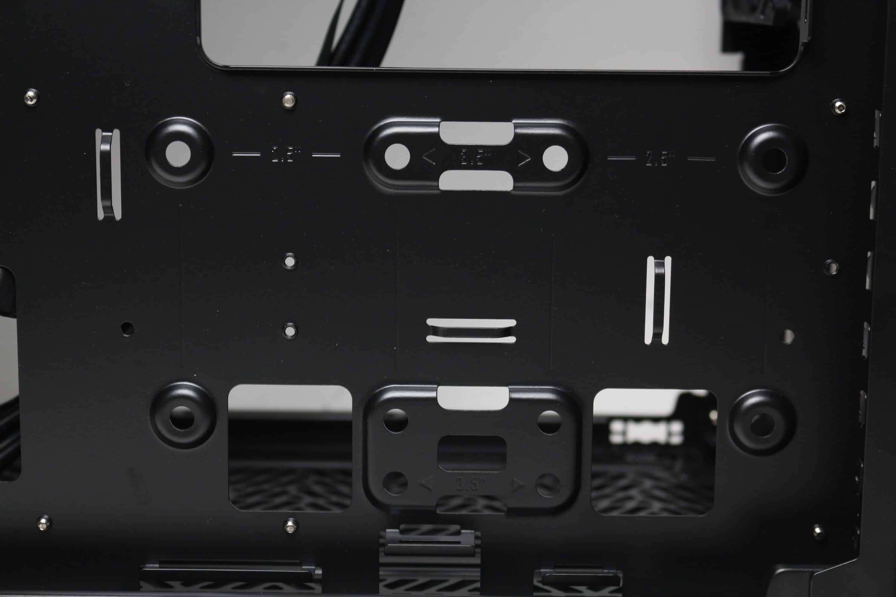 Die Rückseite des Mainboard-Trays bietet bis zu 32 Millimeter Platz für Kabel und zahlreiche Ösen für Kabelbinder. Außerdem kommen stellenweise um 90 Grad angewinkelte Halterungen zum Einsatz, die in Verbindung mit optionalen Klettkabelbindern als eine Art Kabelkanal eingesetzt werden können. Alle Kabel des Netzteils können über die etwas größere Öffnung am linken Rand hinter das Tray geführt und von dort verlegt werden. Außerdem darf natürlich der Ausschnitt zum nachträglichen Einbau eines CPU-Kühlers mit Backplate nicht fehlen.