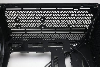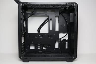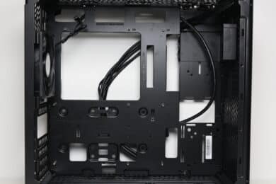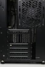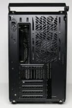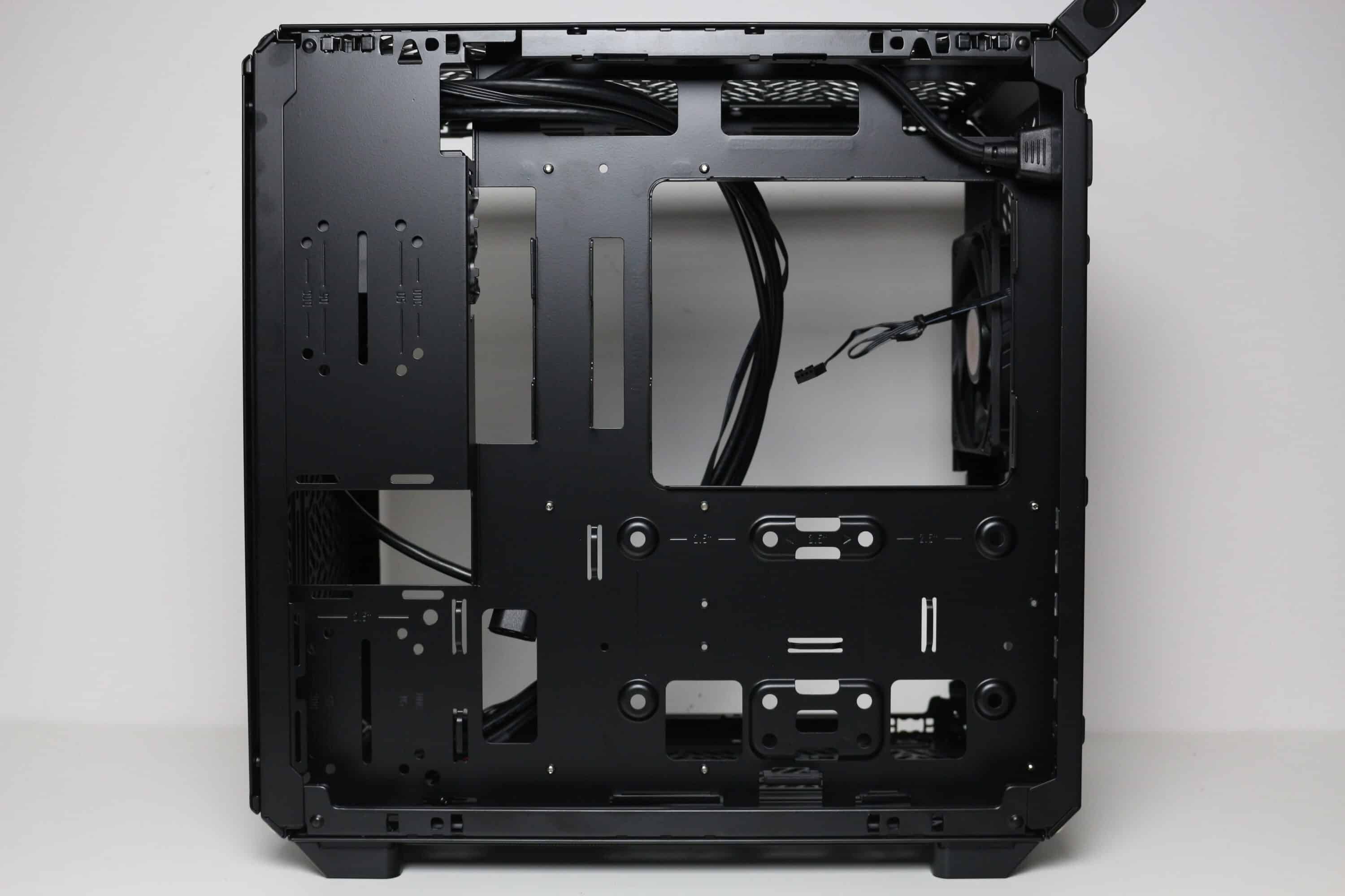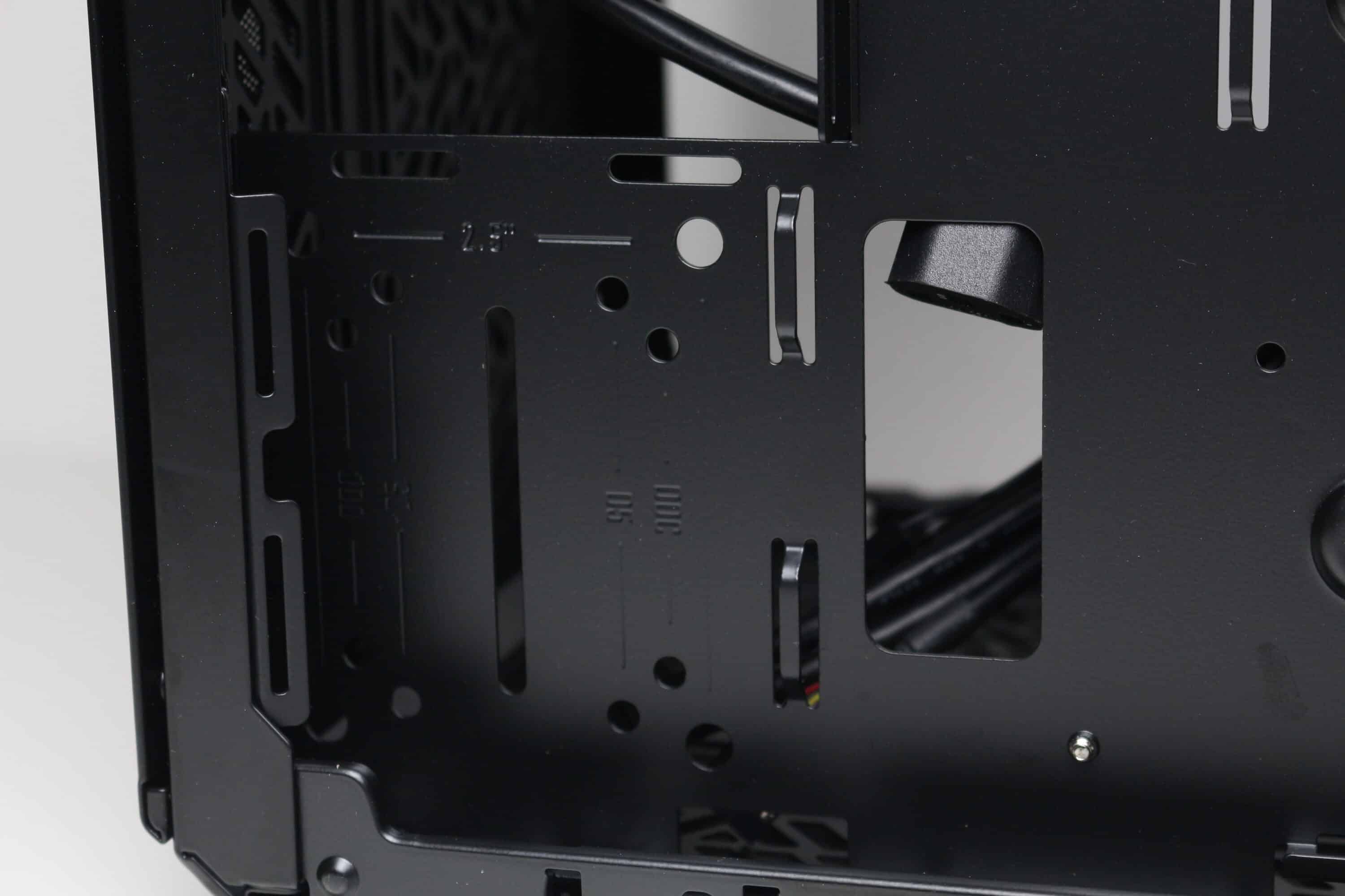 Die Rückseite des Mainboard-Trays bietet bis zu 32 Millimeter Platz für Kabel und zahlreiche Ösen für Kabelbinder. Außerdem kommen stellenweise um 90 Grad angewinkelte Halterungen zum Einsatz, die in Verbindung mit optionalen Klettkabelbindern als eine Art Kabelkanal eingesetzt werden können. Alle Kabel des Netzteils können über die etwas größere Öffnung am linken Rand hinter das Tray geführt und von dort verlegt werden. Außerdem darf natürlich der Ausschnitt zum nachträglichen Einbau eines CPU-Kühlers mit Backplate nicht fehlen.