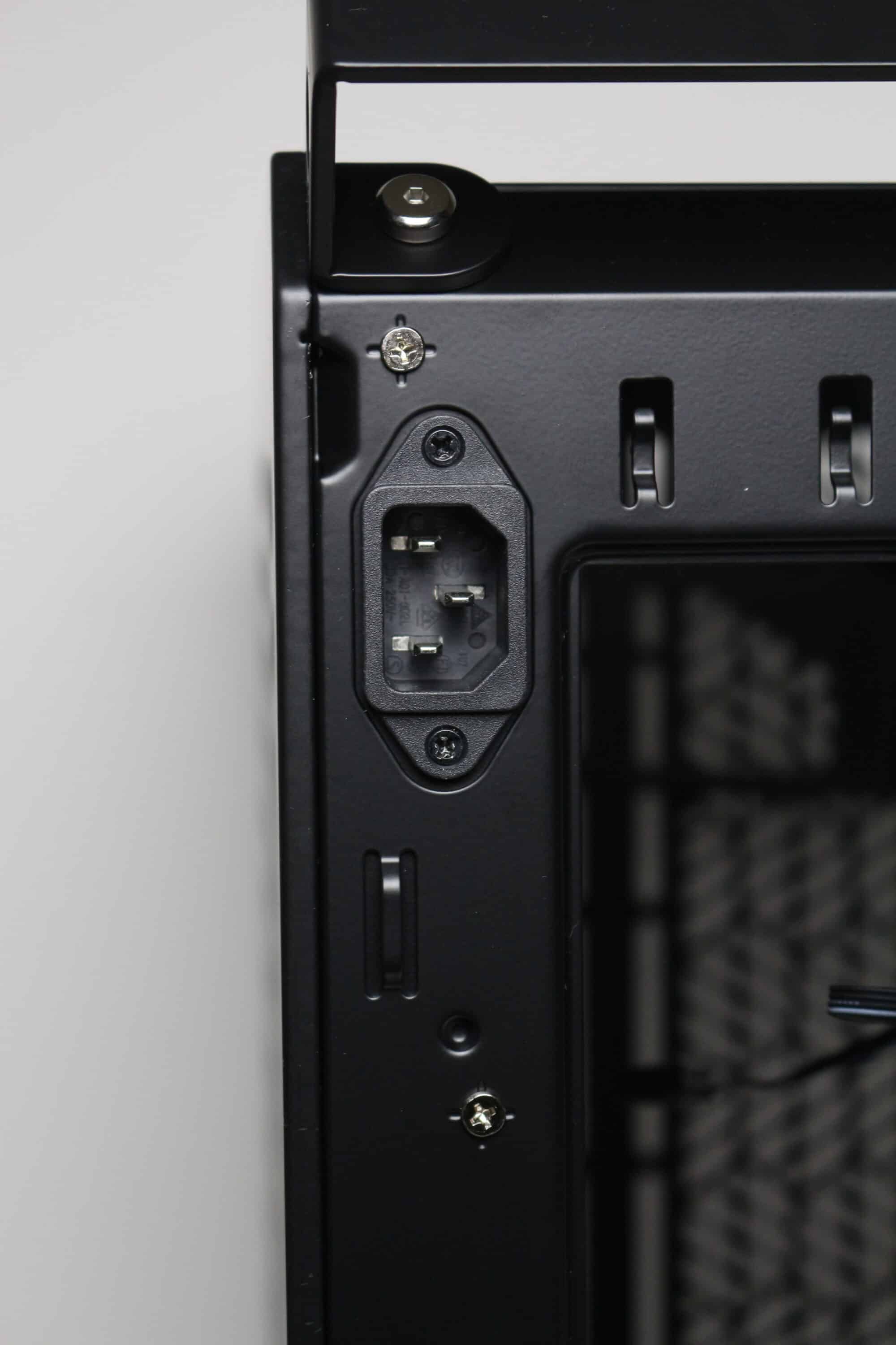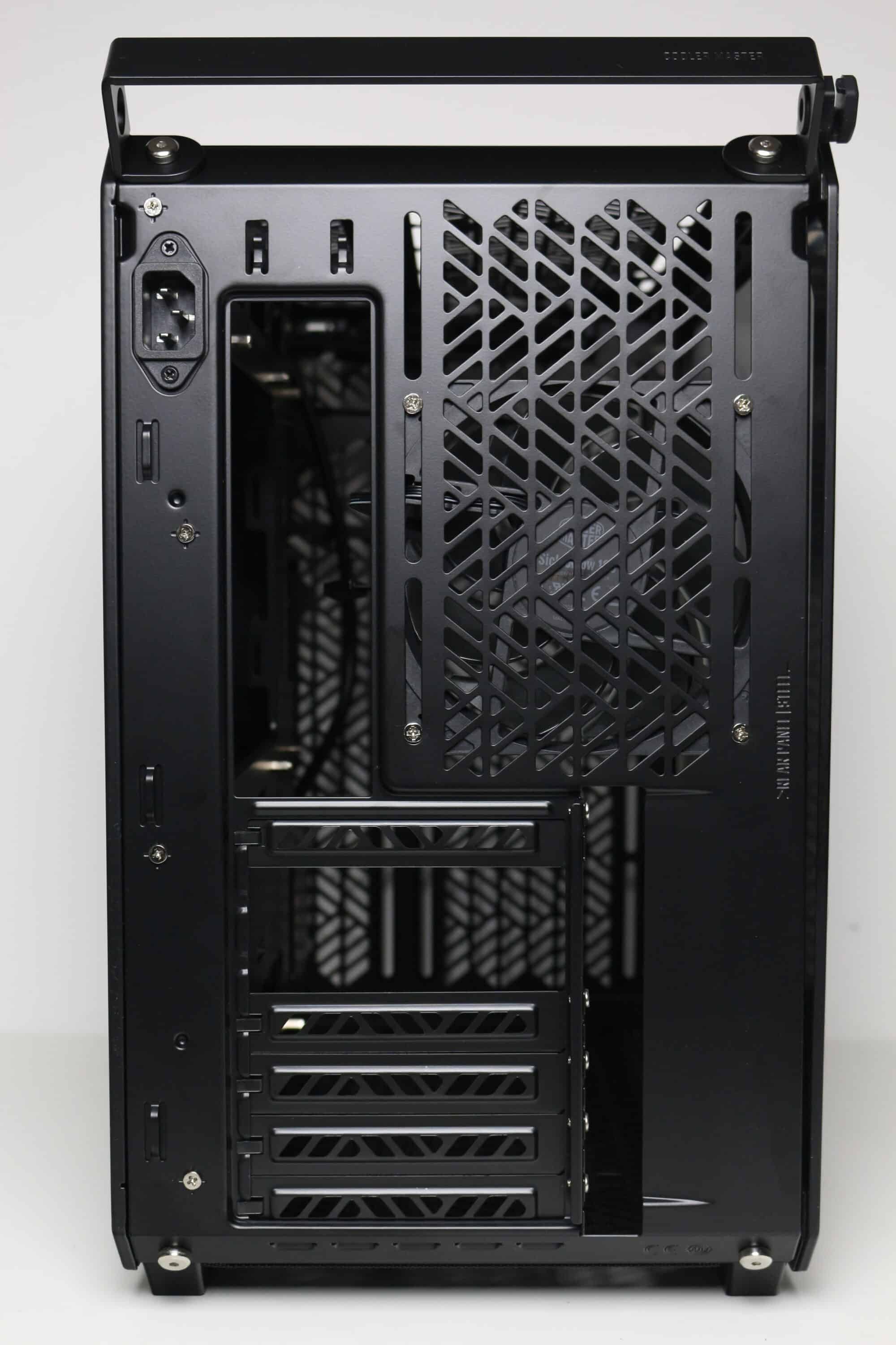 Bei einem Blick auf die Rückseite des Qube 500 fällt eines direkt auf: es gibt hier keinen Montageplatz für ein ATX-Netzteil. Stattdessen lassen sich im unteren Bereich sieben Slots für Erweiterungskarten erkennen, von denen aber nur fünf mit einer wiederverwendbaren Slotbende ausgestattet wurden. Darüber positioniert Cooler Master einen vorinstallierten 120-mm-Gehäuselüfter, der mittels Montageschienen flexibel verschoben werden kann. An der oberen linken Ecke verbaut der Hersteller zuletzt noch die Buchse für das Kaltgerätekabel, welches im Innenraum zum Netzteil geführt wird.