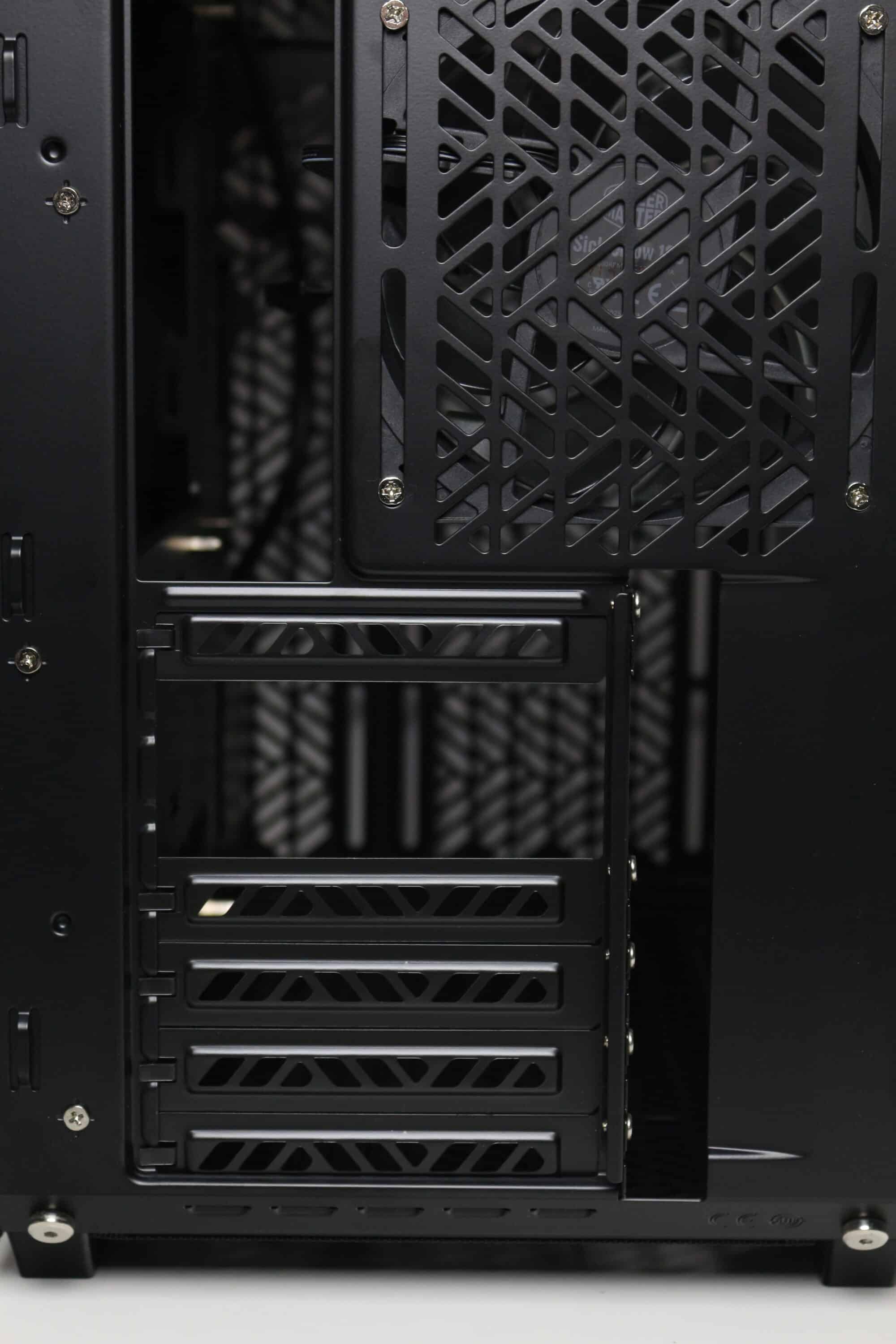 Im Cooler Master Qube 500 können insgesamt bis zu vier 3,5″- oder drei 2,5″-Datenträger verbaut werden. Dafür gibt es sowohl im Deckel als auch im Boden einen Montageplatz für jeweils eine 3,5″-HDD, die dann jedoch einen Lüfterplatz blockiert. Außerdem lassen sich am seitlichen Rahmen und hinter dem Mainboard-Tray zwei weitere 3,5″-Datenträger befestigen. Möchte man stattdessen lieber 2,5″-SSDs verbauen, dann ist auch das möglich. Diese finden nur an der Rückseite des Mainboard-Trays Platz. Egal ob 3,5″ oder 2,5″, die Montage erfolgt immer entkoppelt und werkzeuglos über Gummiringe und Montagestifte.