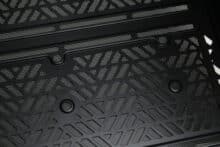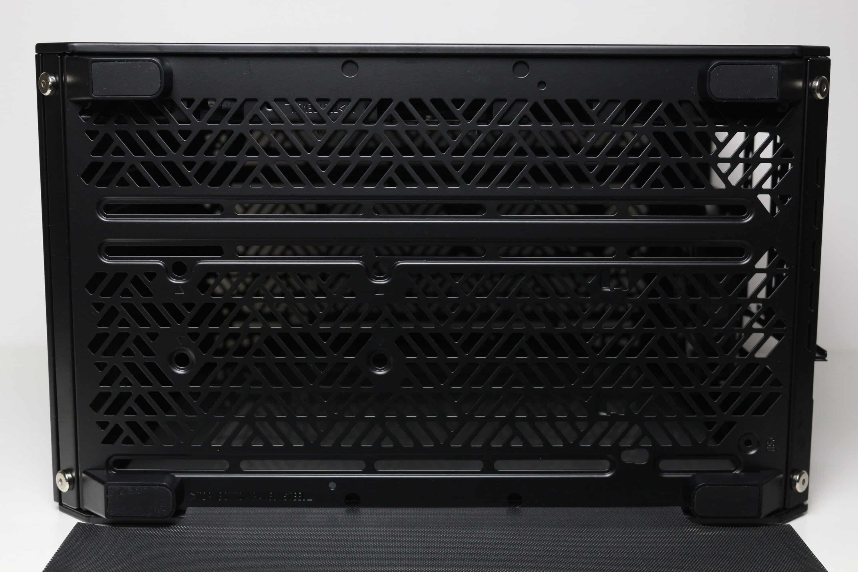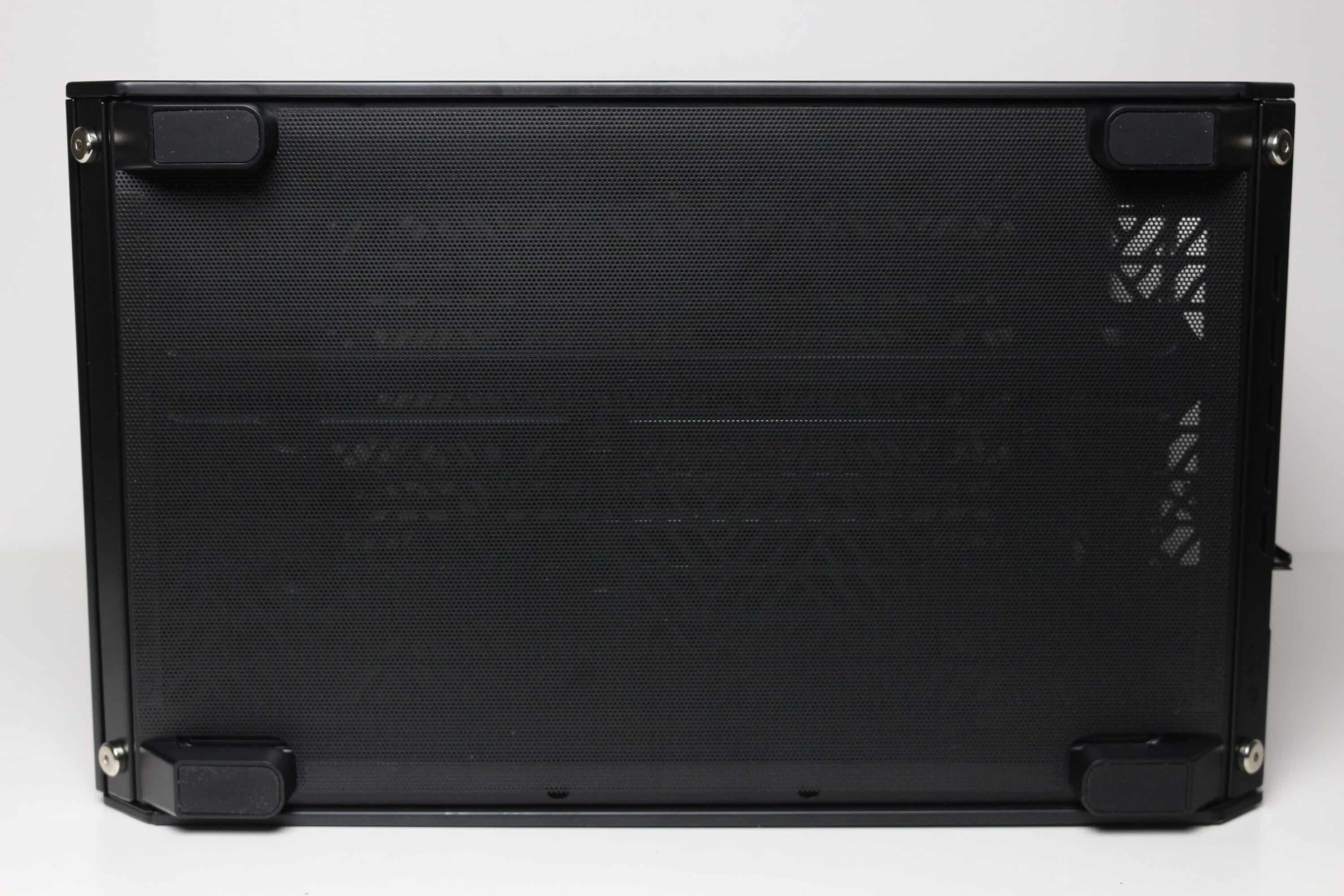 An der Unterseite des Qube 500 gibt es keine großen Überraschungen. So verfügt auch diese wieder über großzügig dimensionierte Belüftungsöffnungen und Montageschienen für bis zu zwei 120- oder 140-mm-Lüfter. Vor den Lüftern positioniert Cooler Master einen großen Staubfilter aus Mesh, welcher über Magnetstreifen am Korpus befestigt wird und dadurch leicht entfernt werden kann. Als Standfüße kommen vier simple Blöcke aus Kunststoff zum Einsatz, die zum Schutz des Untergrundes über eine Schicht Gummi verfügen. Plant man den Einsatz eines anderes Layouts des Qube 500, dann können die Füße auch nach Belieben umpositioniert werden.
