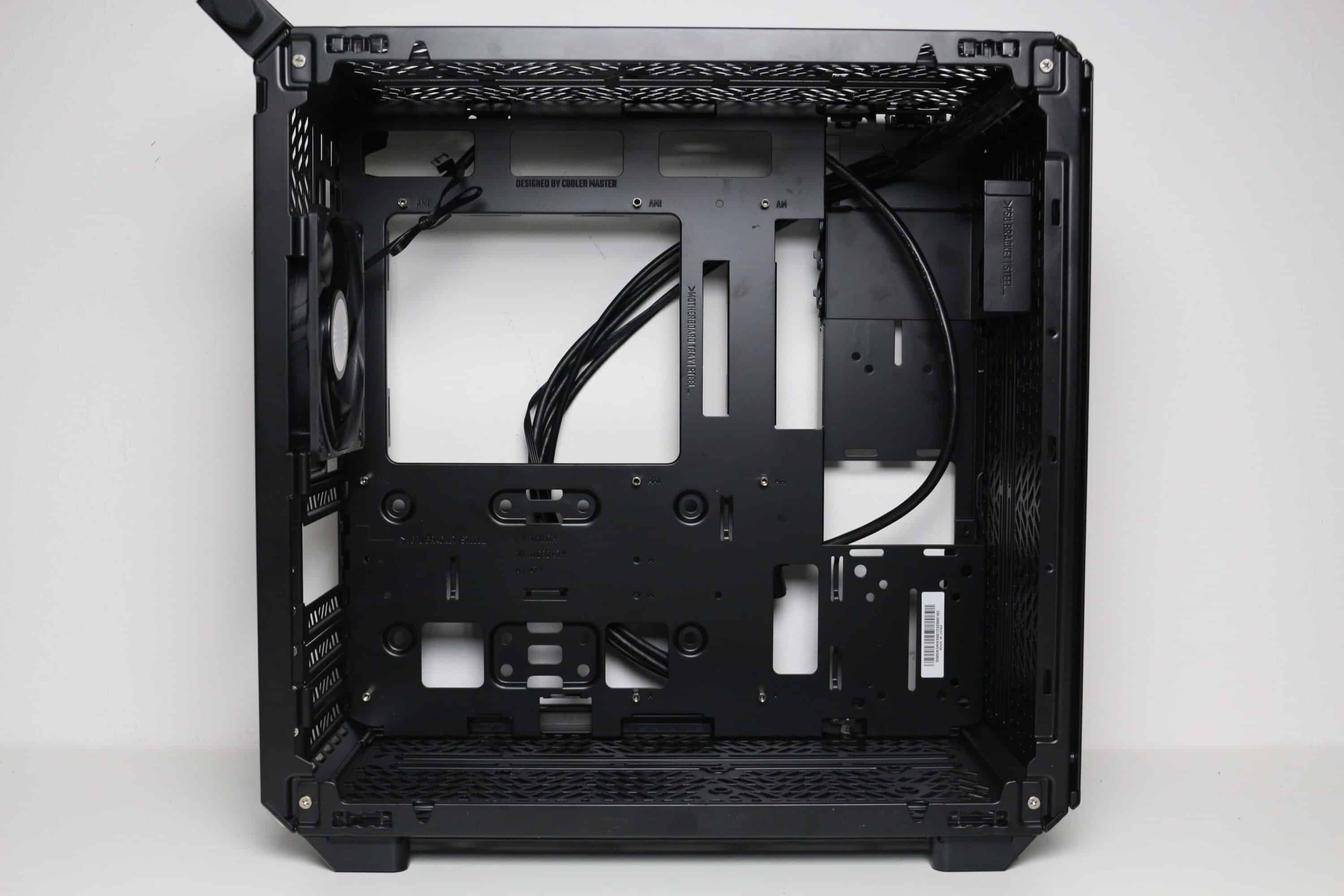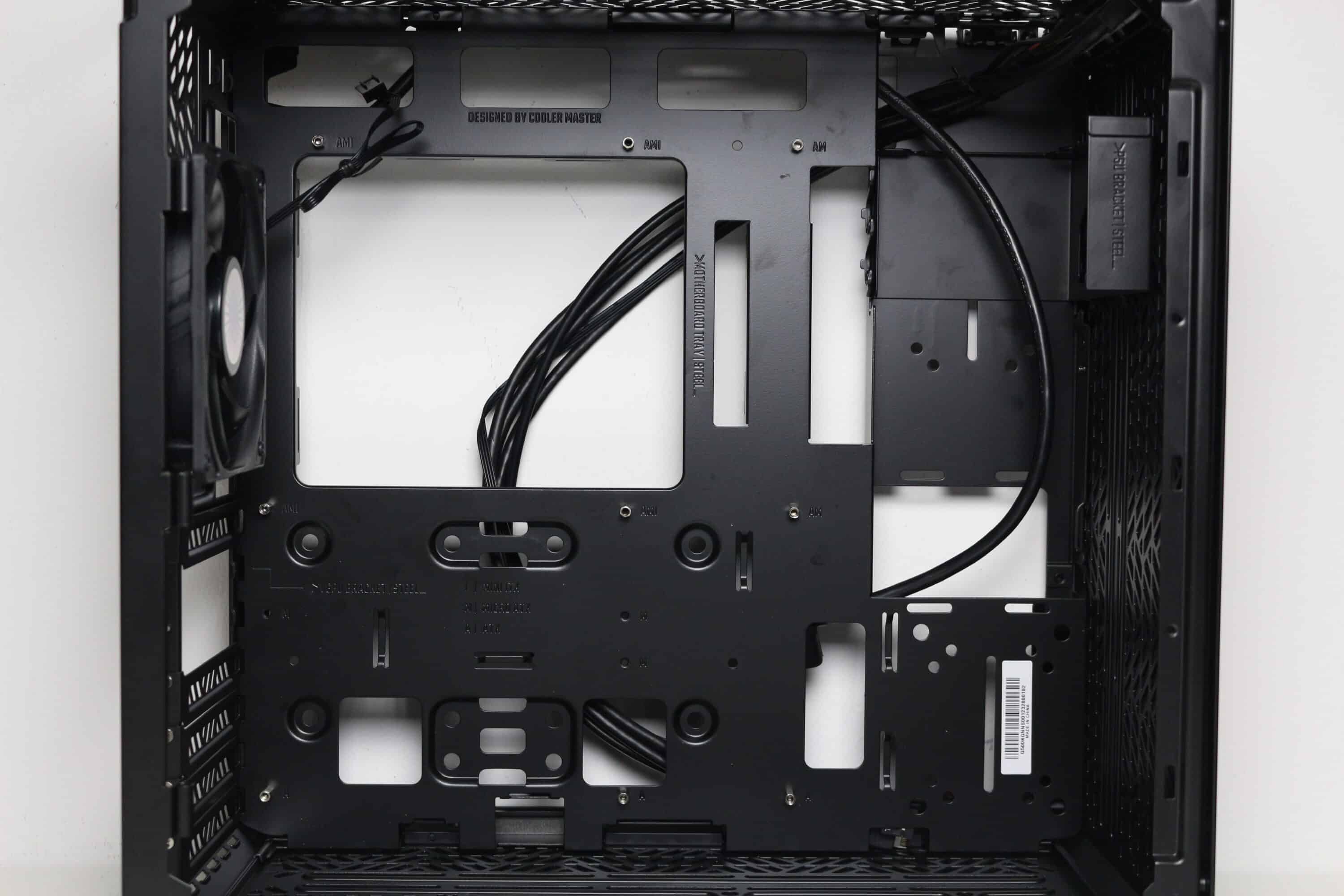 Der Innenraum des Cooler Master Qube 500 Flatpack setzt sich aus einer großen Hauptkammer für alle wichtigen Komponenten, wie zum Beispiel Mainboard, Grafikkarte und Netzteil, sowie einer kleiner Kammer hinter dem Mainboard-Tray für Datenträger und Kabel zusammen. Das Tray ist überwiegend plan gestaltet, verfügt aber über diverse Öffnungen für Kabel und eine große Einbuchtung an der rechten Seite für das Netzteil. Außerdem wurden alle Abstandshalter für ein normales ATX-Mainboard vorinstalliert.