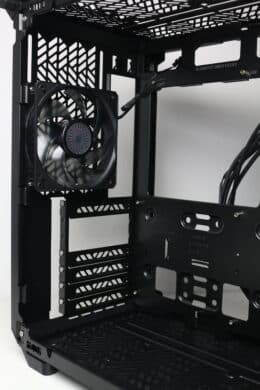 In Bezug auf Radiatoren bietet das Qube 500 Montageplätze für jeweils einen 240- oder 280-mm-Wärmetauscher im Deckel, am Boden, an seitlichen Montagerahmen sowie an der Front, wenn das Netzteil hier nicht platziert wird. Entsprechend der Radiatoren können hier natürlich auch entsprechend große Lüfter (120 mm oder 140 mm) verbaut werden. Exemplarisch haben wir im Deckel einmal die Cooler Master MasterLiquid 240 Atmos ARGB verbaut.