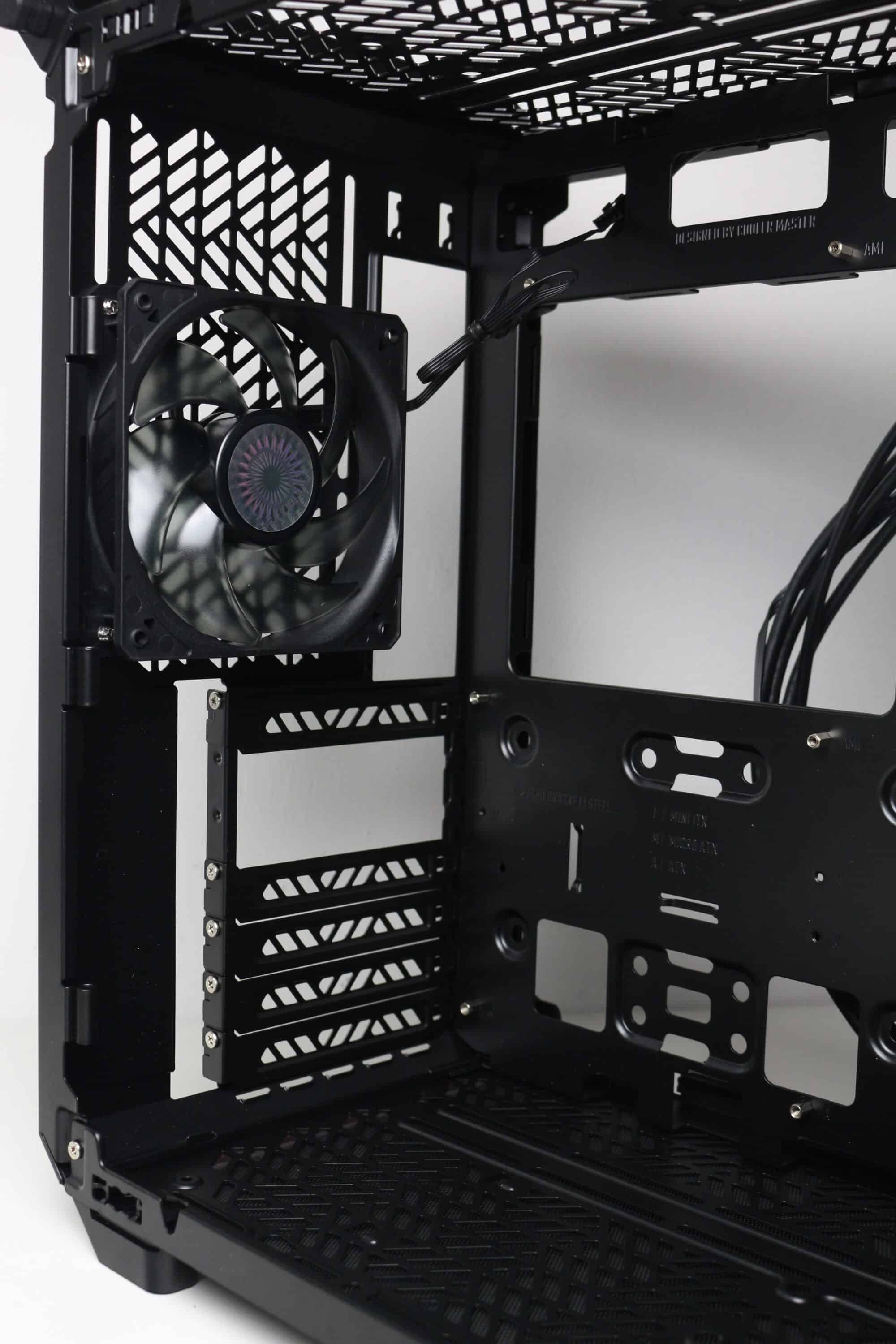 Im vorderen Bereich finden wir den Montagerahmen aus Stahl zur Befestigung des Netzteils. Dazu muss der Rahmen zunächst ausgebaut, mit dem Netzteil bestückt und wieder eingebaut werden. Das Netzteil kann sowohl mit dem Lüfter zum Innenraum als auch zur Front zeigend montiert werden. Am Heck finden wir den vorinstallierten Lüfter sowie die Slots für Erweiterungskarten. Da Cooler Master davon ausgeht, dass der Käufer sowieso eine Grafikkarte verbaut, kommt das Qube 500 mit nur fünf perforierten Slotblenden.