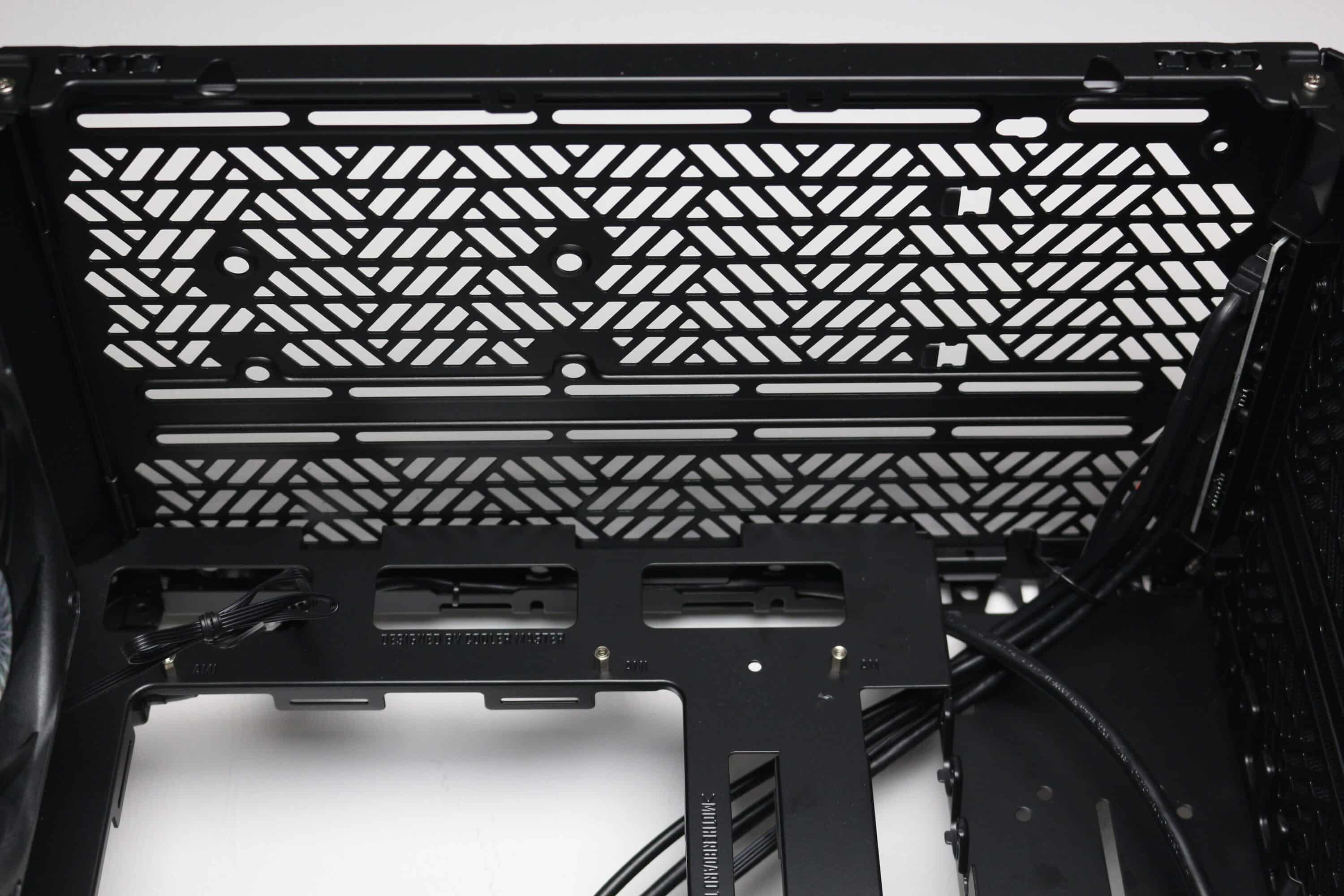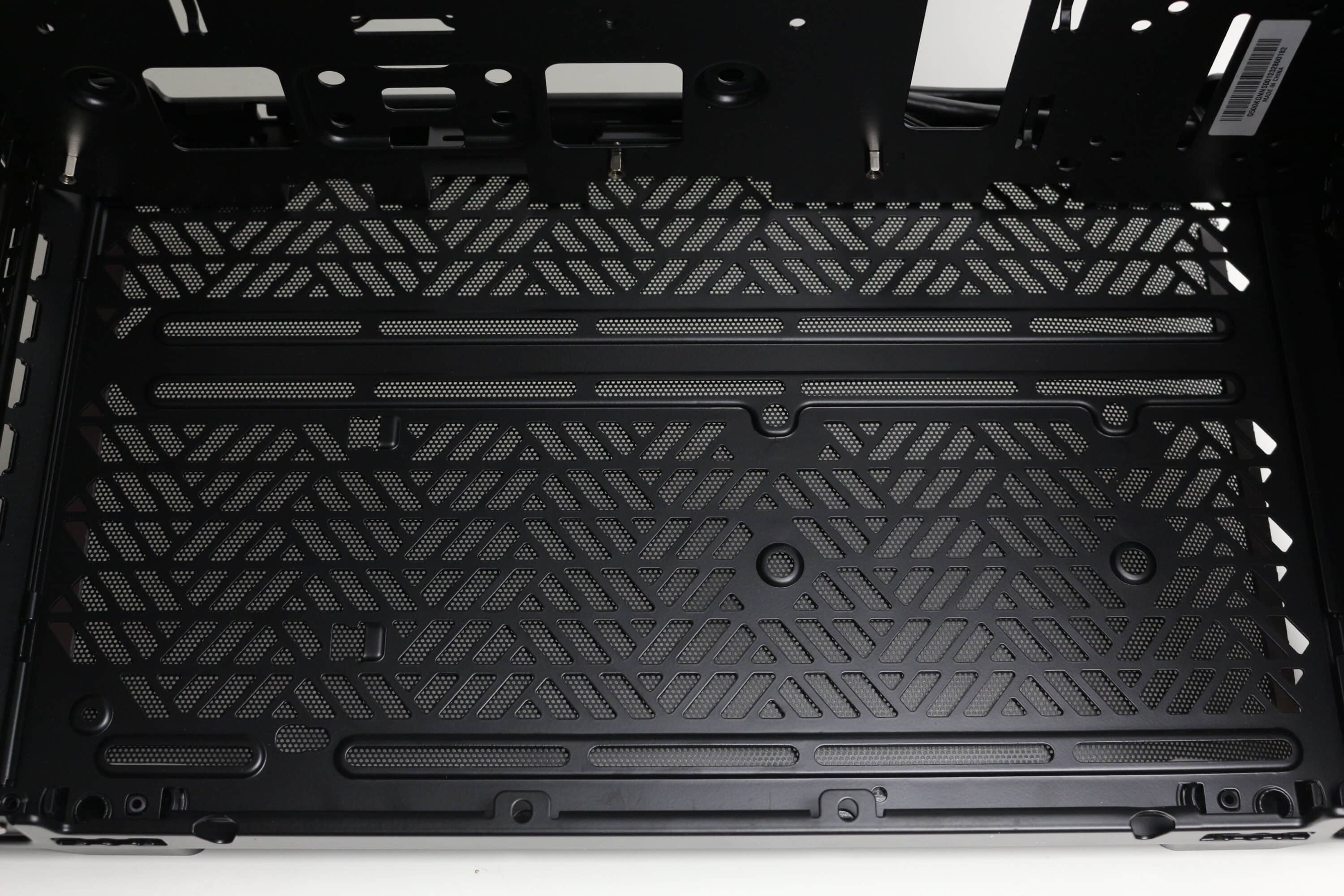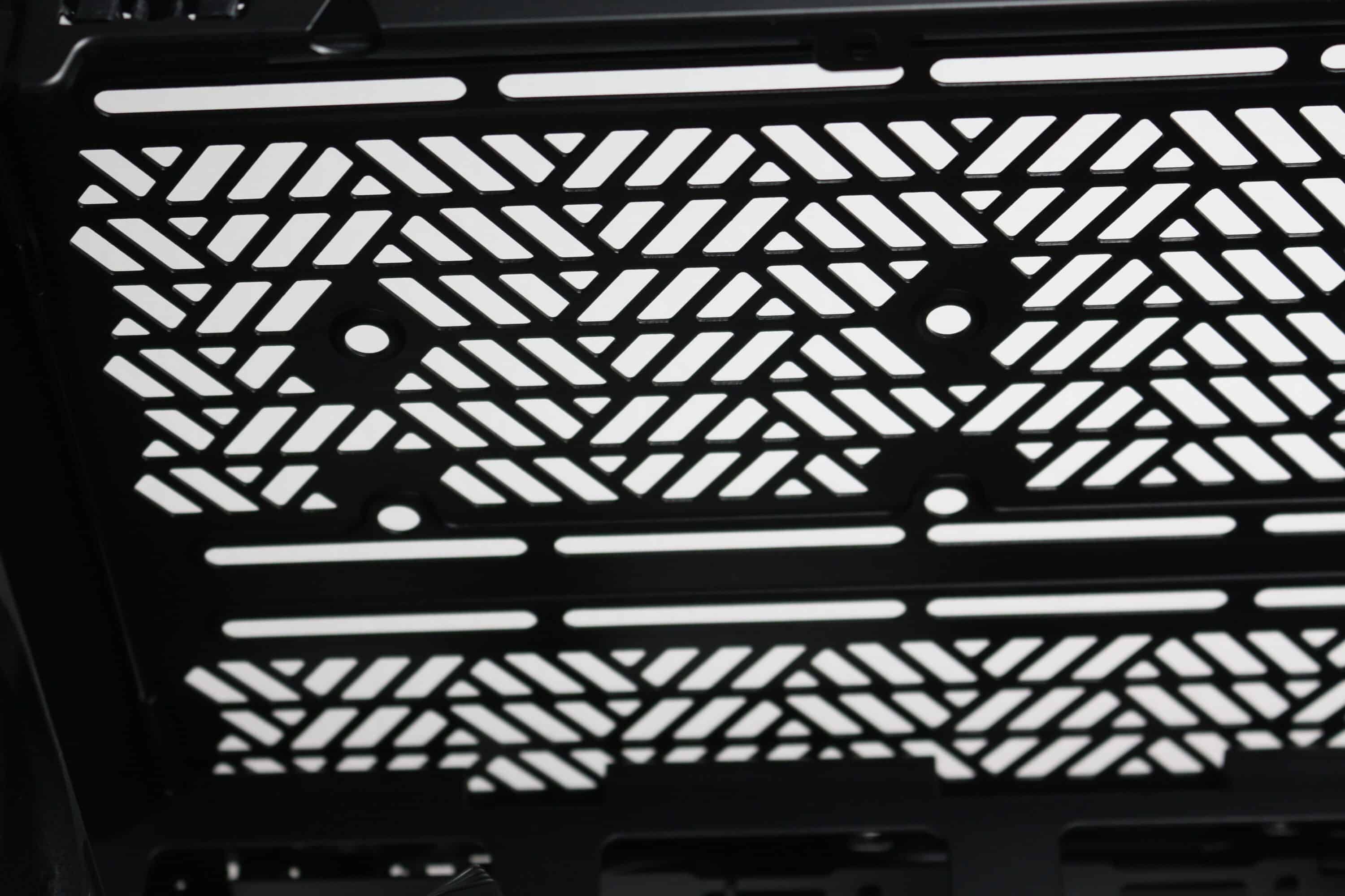 Wie bereits erwähnt, sind das Deckel- sowie das Bodenelement exakte Kopien voneinander. Oberhalb bzw. unterhalb des Mainboard-Trays gibt es jeweils einige Zentimeter Platz, die vor allem bei der Montage eines Radiators bzw. zusätzlicher Lüfter hilfreich sein werden. Deshalb gibt es hier auch ein flexibles Schienensystem für bis zu zwei 120-mm- oder 140-mm-Lüfter, welches nach außen hin versetzt wurde.