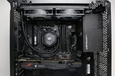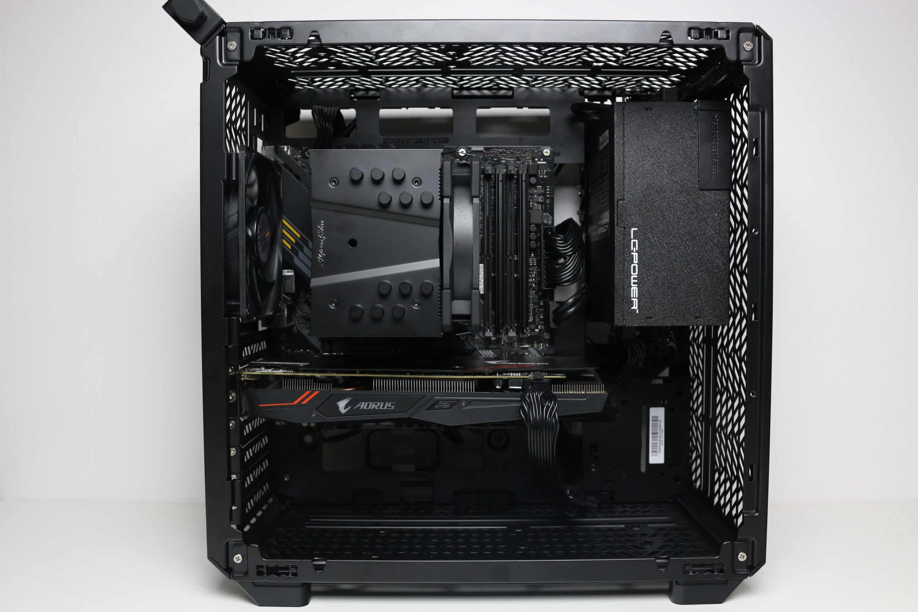 Nun kommen wir zum Systemeinbau beim Cooler Master Qube 500 Flatpack Test. Als Hardware verwenden wir einen AMD Ryzen 5 1400* auf einem ASUS TUF Gaming B550M-Plus* mit 16GB Crucial Ballistix Sport LT grau DDR4-2666*. Der Ryzen wird von einem Alpenföhn Brocken 4* gekühlt und ist auf 3,8 GHz (1,175 V) übertaktet. Für die Bildausgabe ist eine Gigabyte AORUS GTX 1060 6GB zuständig. Die Stromversorgung erledigt das vollmodulare LC-Power LC550 V2.31 Platinum*.