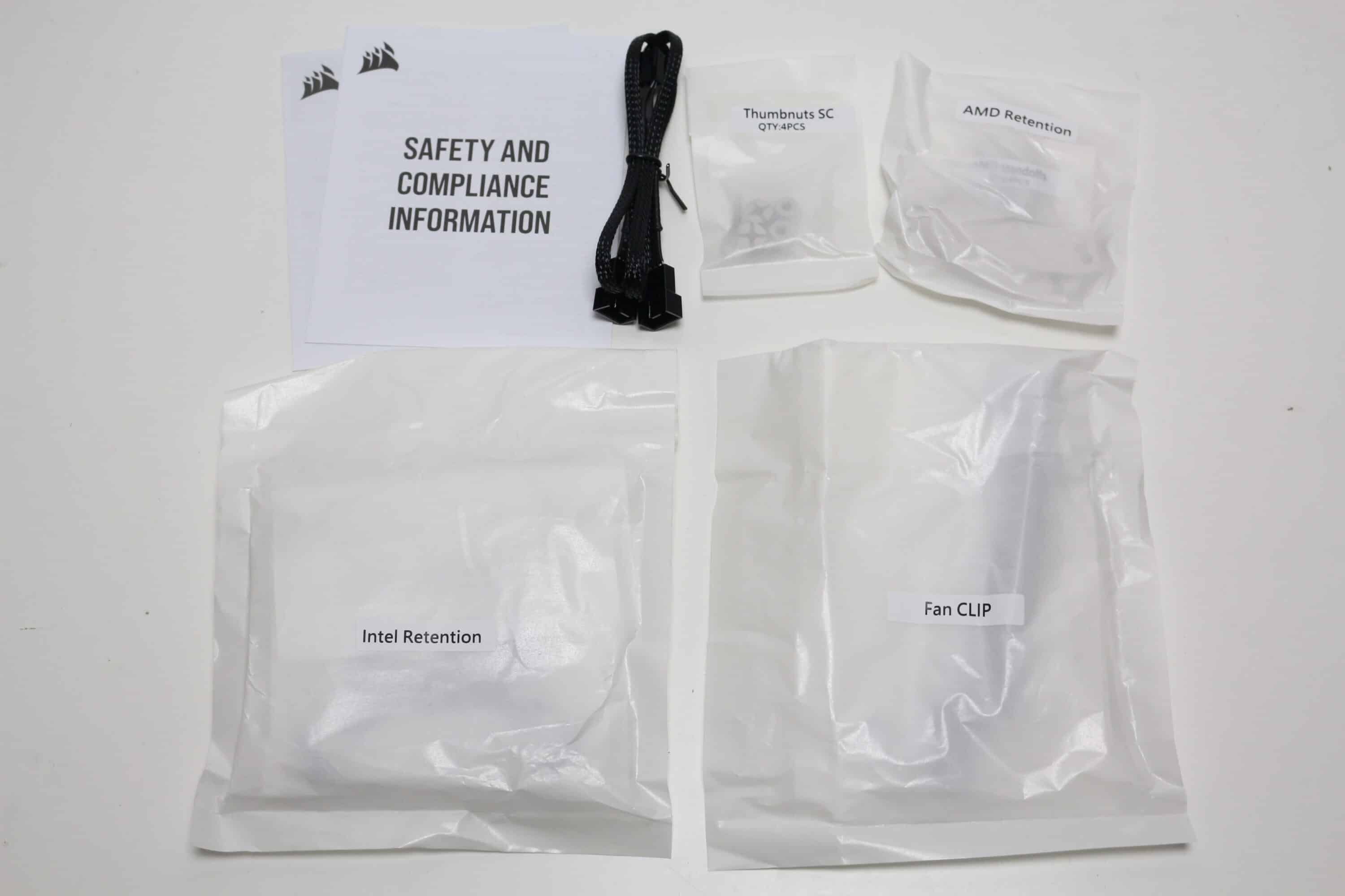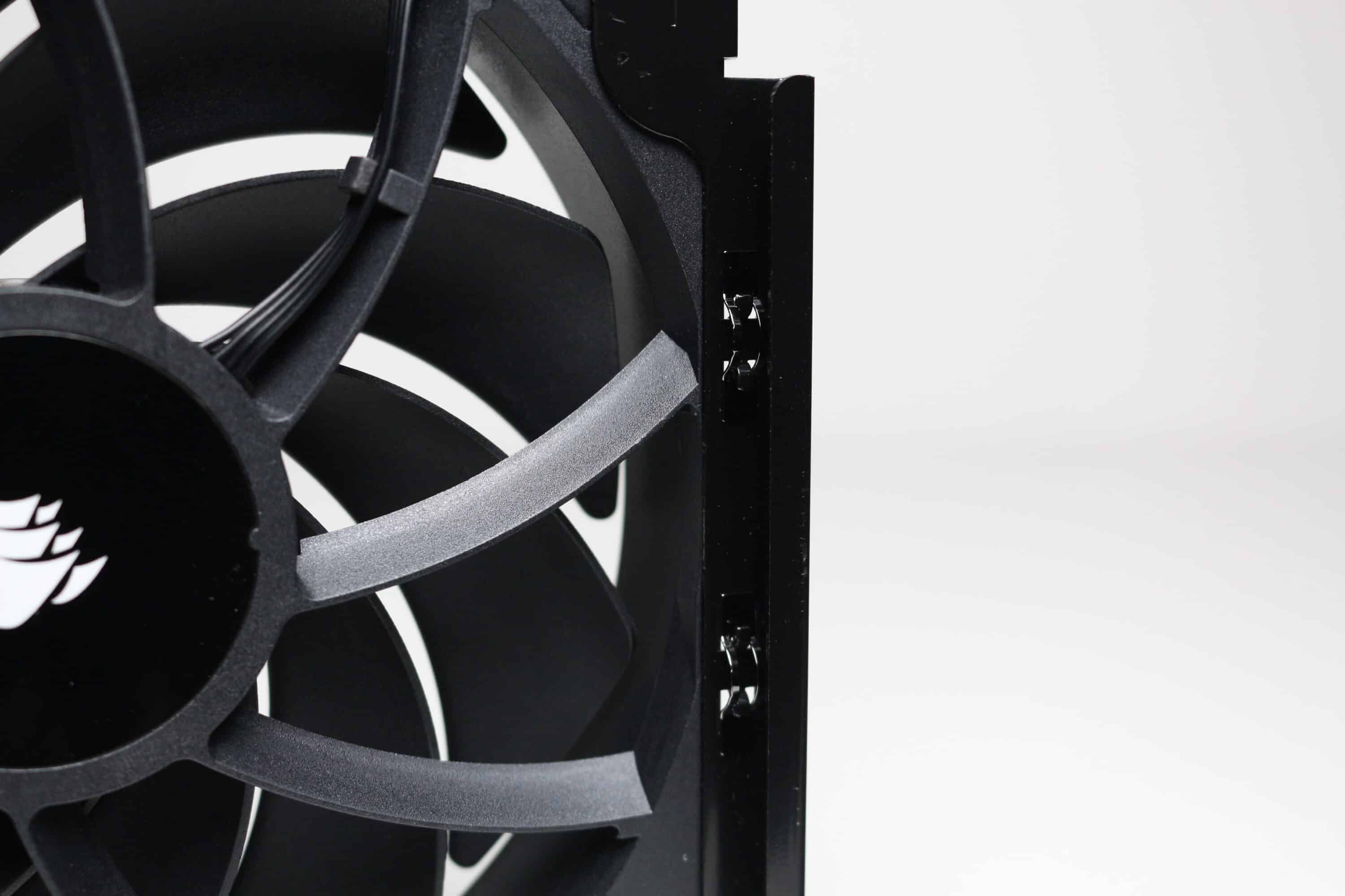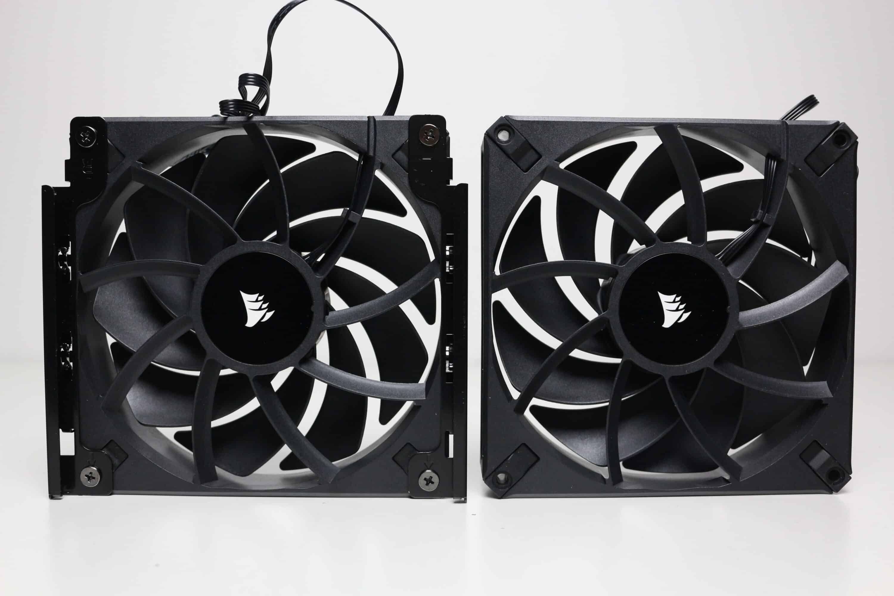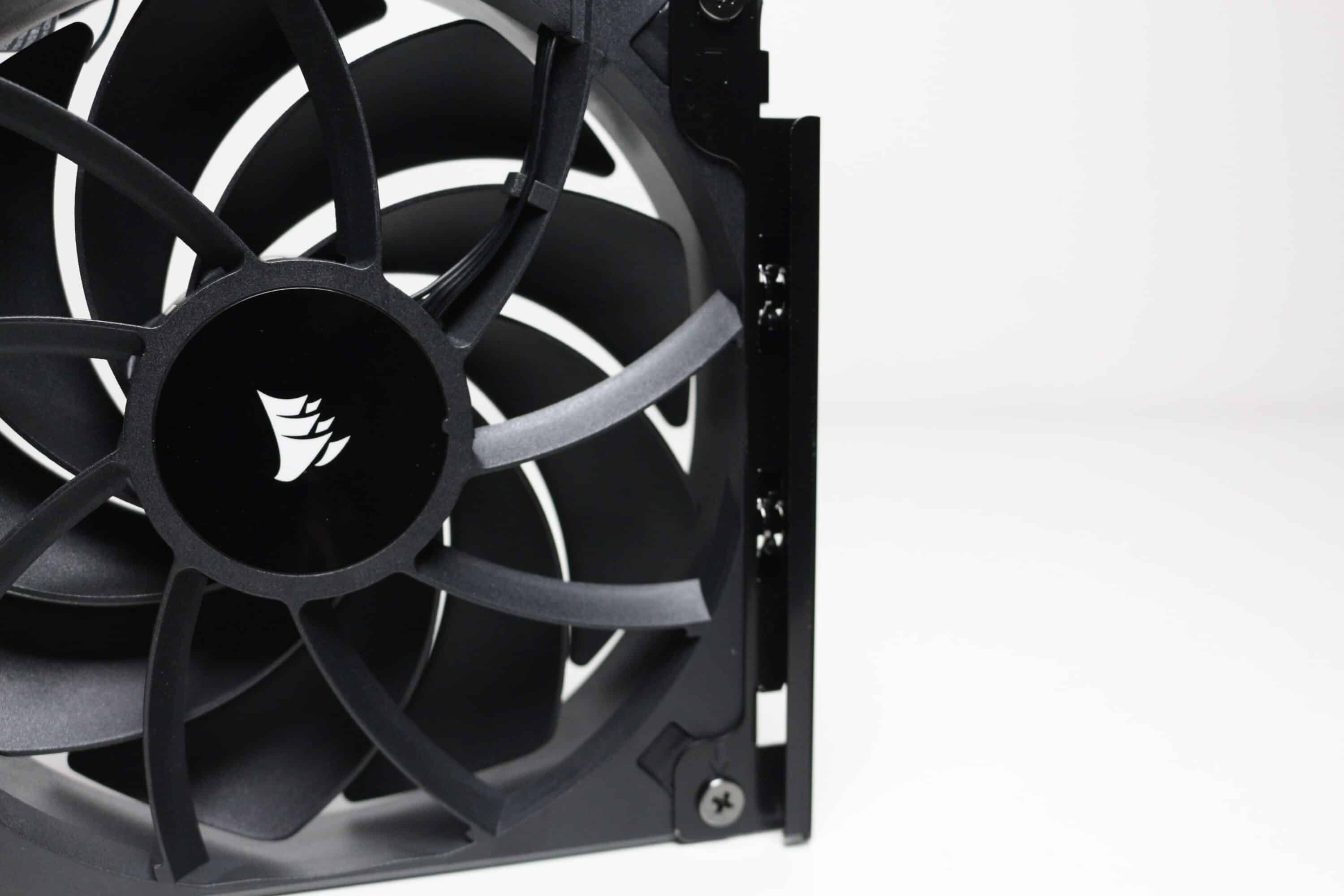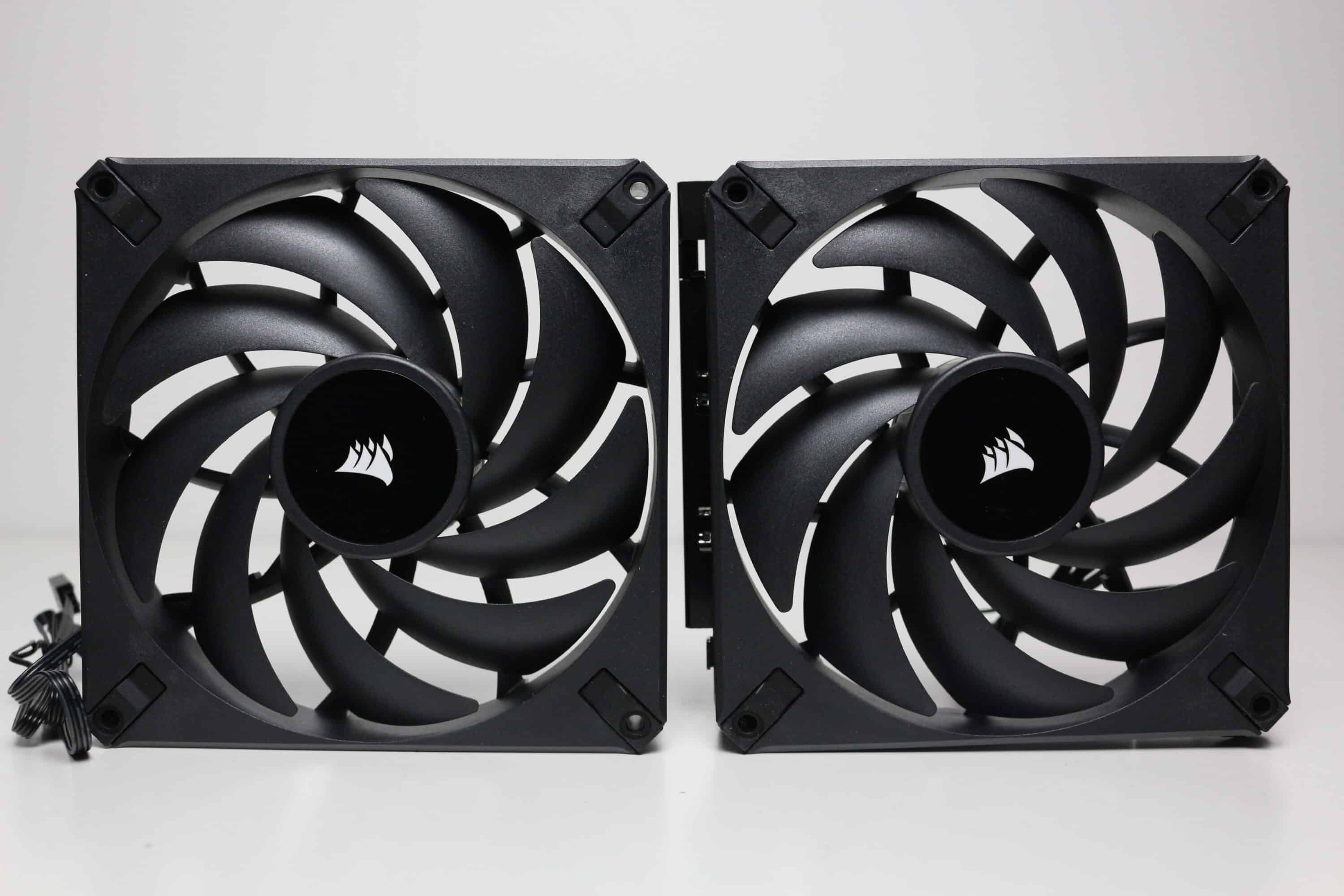 Als Lüfterbestückung setzt Corsair auf zwei schwarze AF140 Elite, die jeweils über eine Rahmenbreite von 140 Millimetern verfügen und sich zwischen 400 und 1600 Umdrehungen drehen können. Der Anschluss am Mainboard erfolgt jeweils über einen 4-Pin-PWM-Anschluss und eine passende Y-Weiche liegt dem Montagezubehör bei. Das Rotorblatt verfügt über neun schwarze Lüfterblätter und an den Ecken des Rahmens platziert Corsair jeweils ein Gummielement zur Entkopplung.